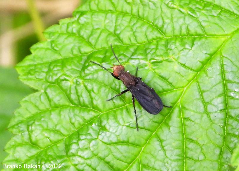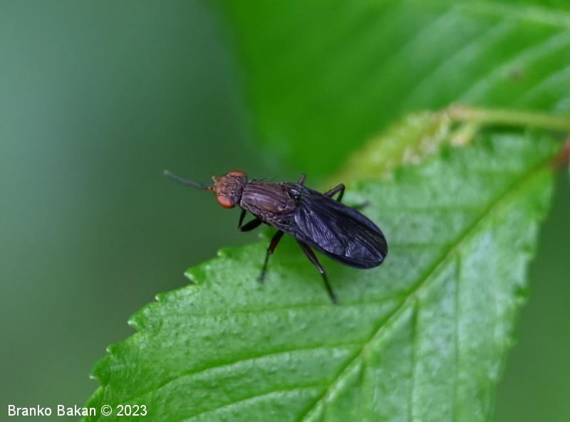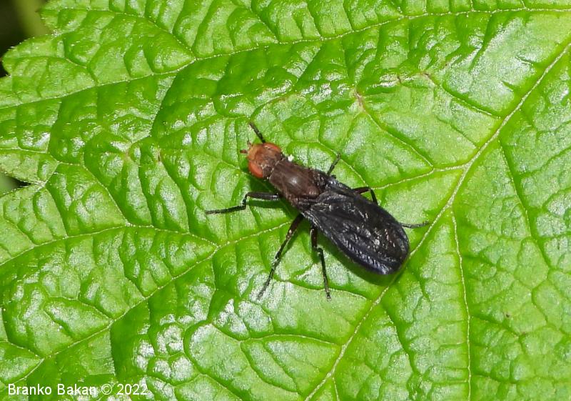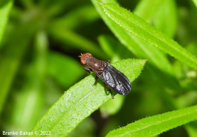 Odrasli osebki: preoznavni so po zelo temnih krilih. Glava je precej široka, po zgornji strani ploska, rjavkasta, z močno razmaknjenimi, rdečimi očmi. Tipalnice so kratke, betičaste, rumenkaste, s tankimi nitastimi izrastki (ariste). Oprsje je podolgovato kvadratasto, rjavo, z vzdolžnimi temnejšimi pasovi, ob straneh poraslo z daljšimi, nazaj štrlečimi ščetinami, sicer golo. Ščitek (scutellum) je temnorjav, jezičast. Krila so temnorjava, skoraj črna, opnasta, dobro ožiljena. Zadek je rjav, nekoliko krajši od kril. Noge so dokaj dolge, stegenca so črnorjava, ostali segmenti - predvsem stopalca - so skoraj črni.