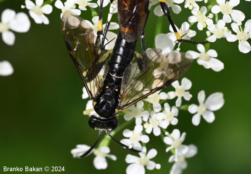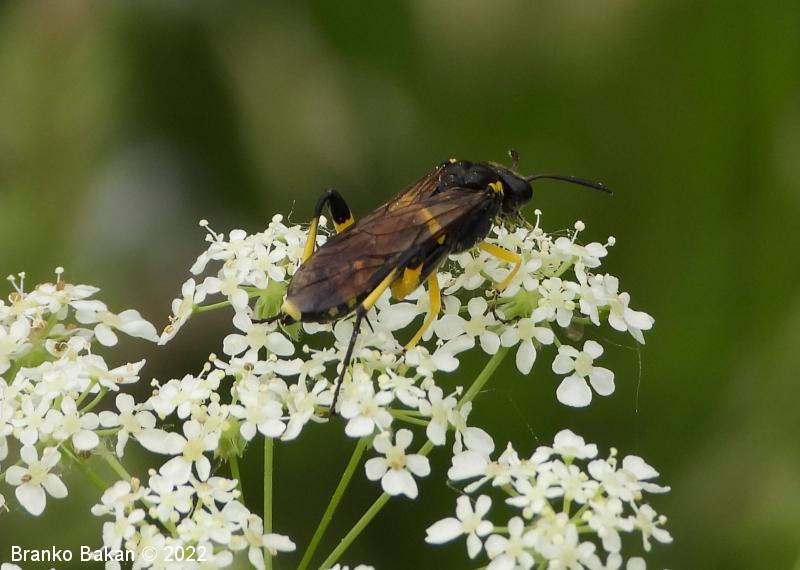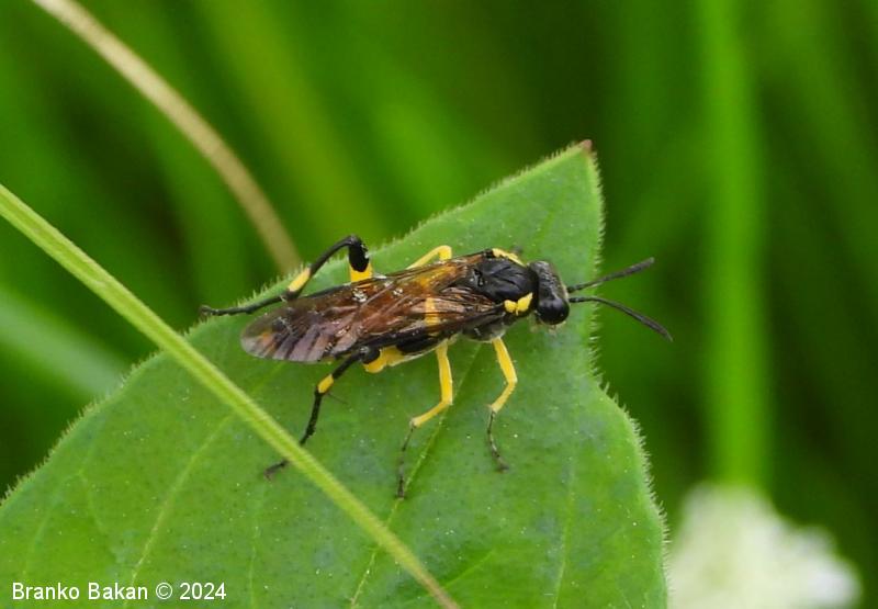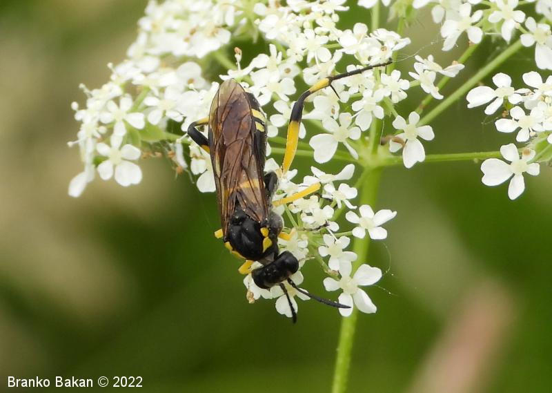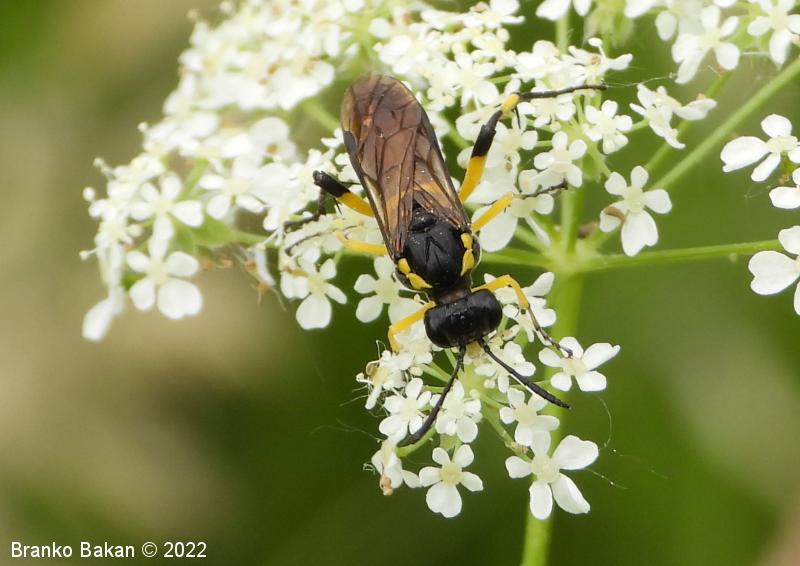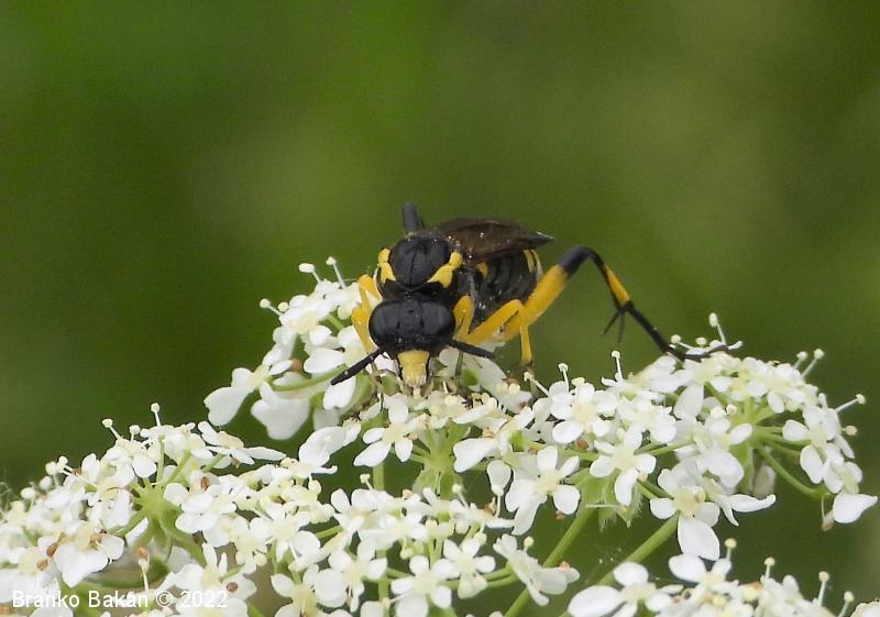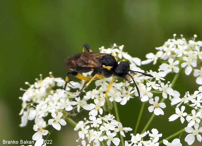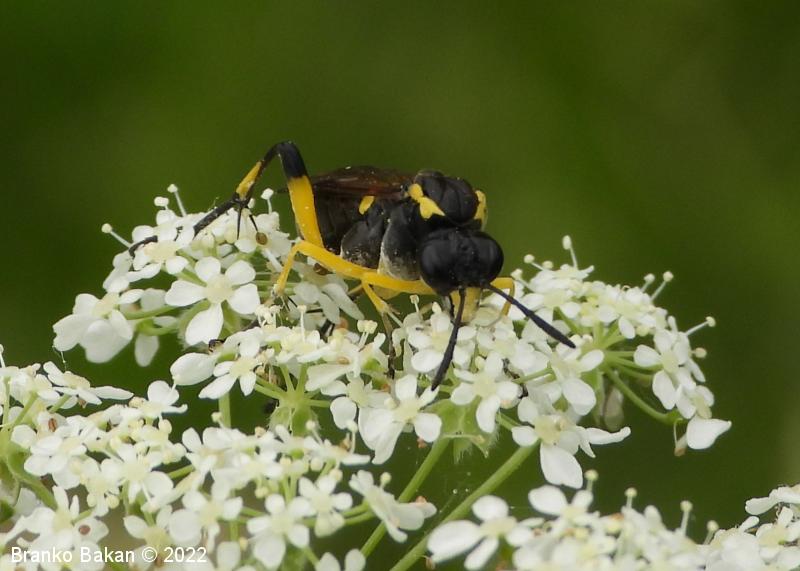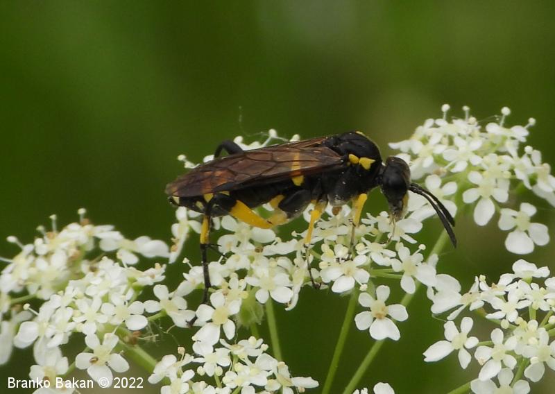 Samica: srednje velika. Telo je bleščeče črno. Glava je črna, sprednji del (klipeus) je rumen, tipalnice so v celoti črne, srednje dolge in rahlo razširjene proti vrhu. Oprsje je ob straneh nekoliko grbasto dvignjeno, gladko, črno, v sprednjem delu z robnima rumenima lisama, ki sta med seboj ozko ločeni. Krila so rahlo potemnjena, s krepkimi žilami in temno, podolgasto pterostigmo (obarvano žilno okence). Zadek je široko podolgast, črn, prvi segment je rumen, na 5. in 6. segmentu sta večinoma po dva rumena, prekinjena pasovaa, konica je rumena. Noge so rumene, zadnje noge so mnogo večje od ostalih, če posebej obrtec (coxa) je krepak, črn, tudi stegenca so na konicah črne, goleni pa pri vrhu in s krepkim trnom na koncu, stopalca so črna.