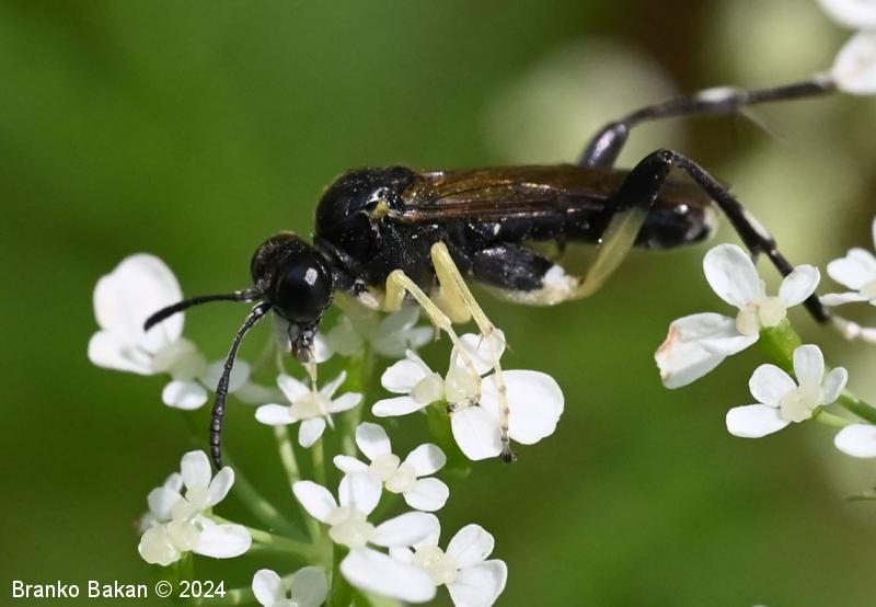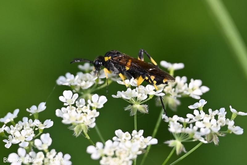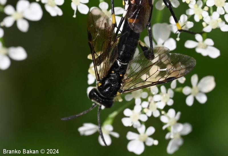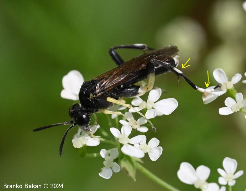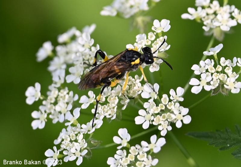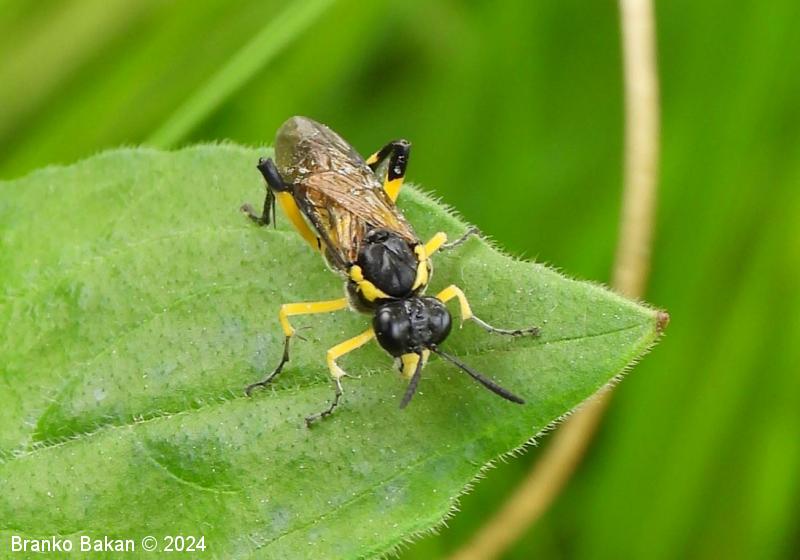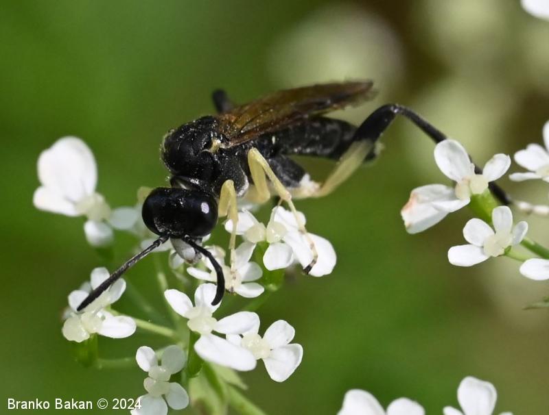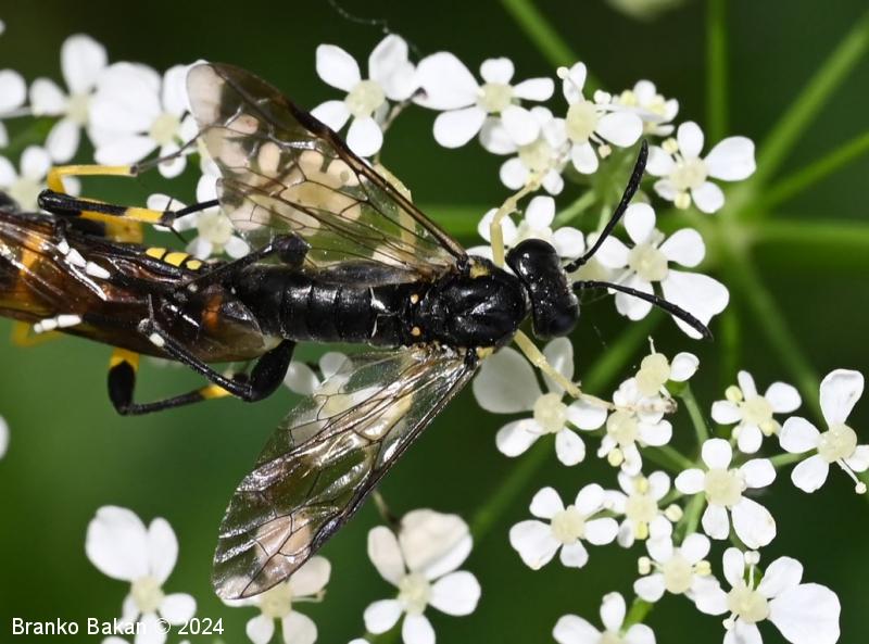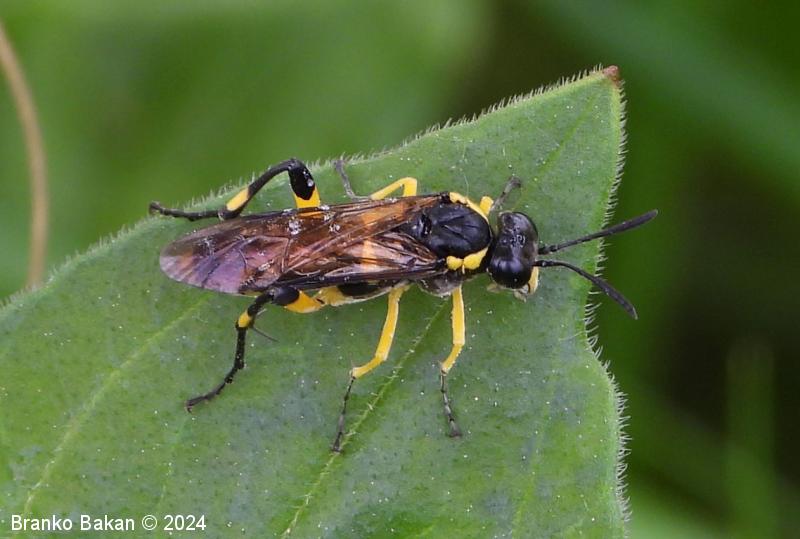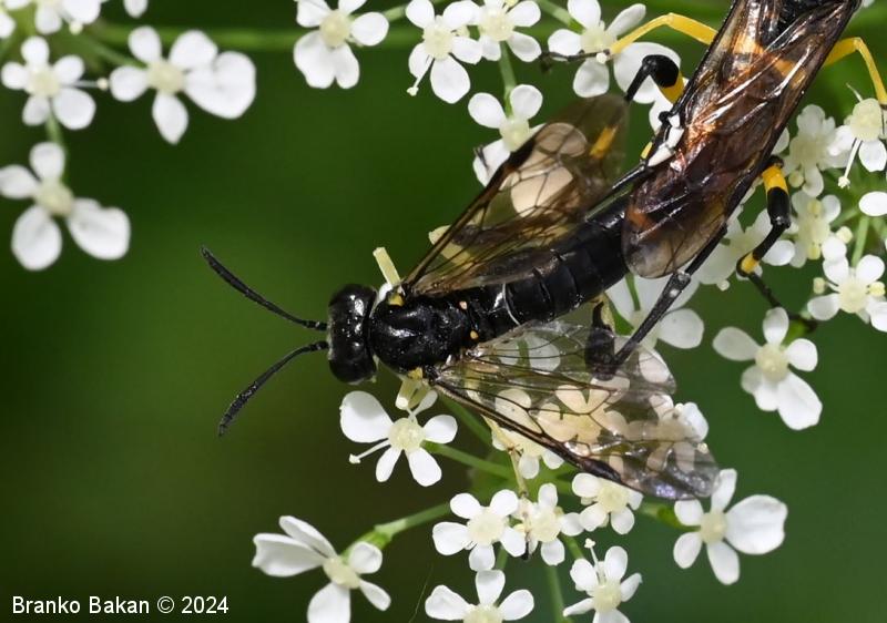 Samica: srednje velika. Telo je bleščeče črno. Glava je črna, sprednji del (klipeus) je rumen, tipalnice so v celoti črne, srednje dolge in rahlo razširjene proti vrhu. Oprsje je ob straneh nekoliko grbasto dvignjeno, gladko, črno, v sprednjem delu z robnima rumenima lisama, ki sta med seboj ozko ločeni. Krila so rahlo potemnjena, s krepkimi žilami in temno, podolgasto pterostigmo (obarvano žilno okence). Zadek je široko podolgast, črn, prvi segment je rumen, na 5. in 6. segmentu sta večinoma po dva rumena, prekinjena pasovaa, konica je rumena. Noge so rumene, zadnje noge so mnogo večje od ostalih, če posebej obrtec (coxa) je krepak, črn, tudi stegenca so na konicah črne, goleni pa pri vrhu in s krepkim trnom na koncu, stopalca so črna.