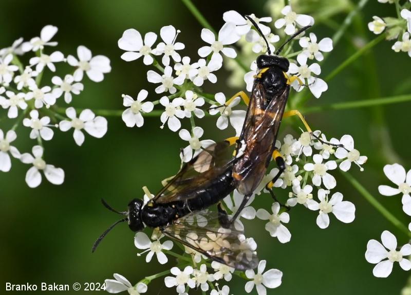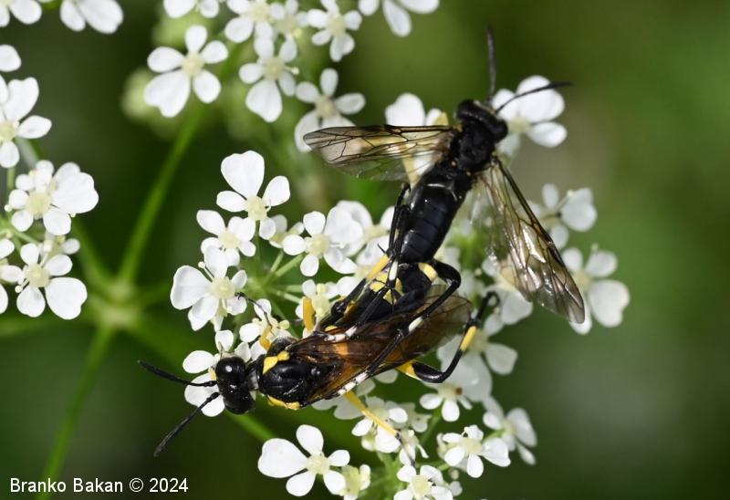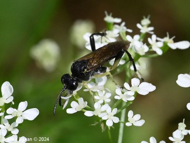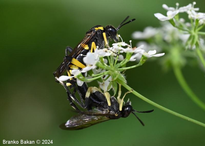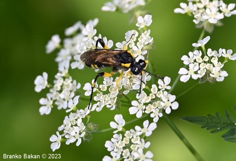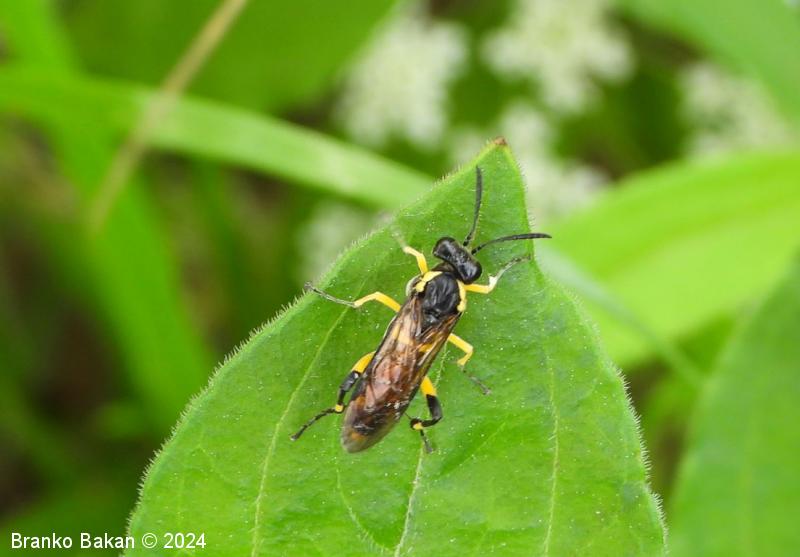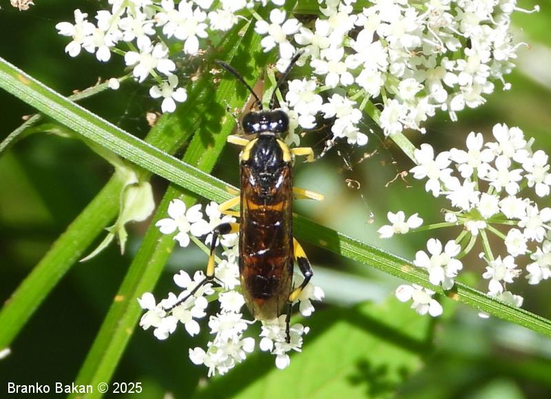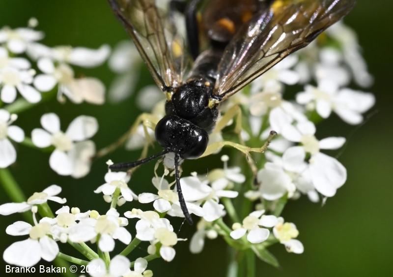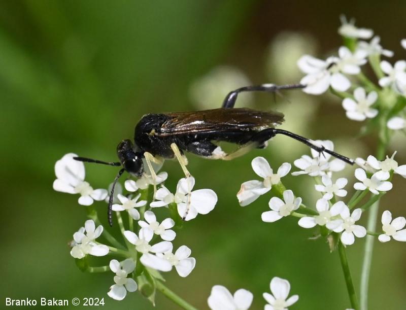 Samica: srednje velika. Telo je bleščeče črno. Glava je črna, sprednji del (klipeus) je rumen, tipalnice so v celoti črne, srednje dolge in rahlo razširjene proti vrhu. Oprsje je ob straneh nekoliko grbasto dvignjeno, gladko, črno, v sprednjem delu z robnima rumenima lisama, ki sta med seboj ozko ločeni. Krila so rahlo potemnjena, s krepkimi žilami in temno, podolgasto pterostigmo (obarvano žilno okence). Zadek je široko podolgast, črn, prvi segment je rumen, na 5. in 6. segmentu sta večinoma po dva rumena, prekinjena pasovaa, konica je rumena. Noge so rumene, zadnje noge so mnogo večje od ostalih, če posebej obrtec (coxa) je krepak, črn, tudi stegenca so na konicah črne, goleni pa pri vrhu in s krepkim trnom na koncu, stopalca so črna.