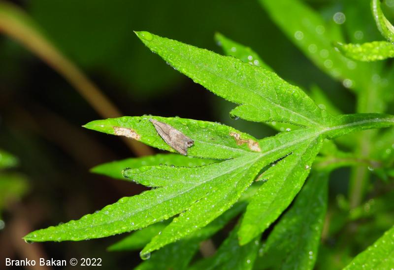 Odrasli osebki: krila so v mirovanju strehasto zložena čez telo. Sprednja krila so sivorjava, fino drobno luskasta, s svetlo "sedlasto" osrednjo liso, ki je bolj ali manj jasno izražena, ob zgornjem robu so pogosto kovinsko temnomodre črte, ki so temno obrobljene (lahko tudi manjkajo), prepoznavne so tudi 3 do 4 črne pike na zunanjem robu kril, ki je pogosto plitvo zaokroženo izrobljen. Zadnja krila so sivorjava, v bazalnem delu nekoliko svetlejša. Tipalnice so nitaste, ob njih so naprej štrleče, dokaj velike pipalčice.