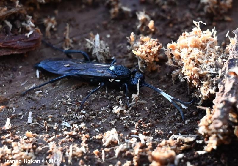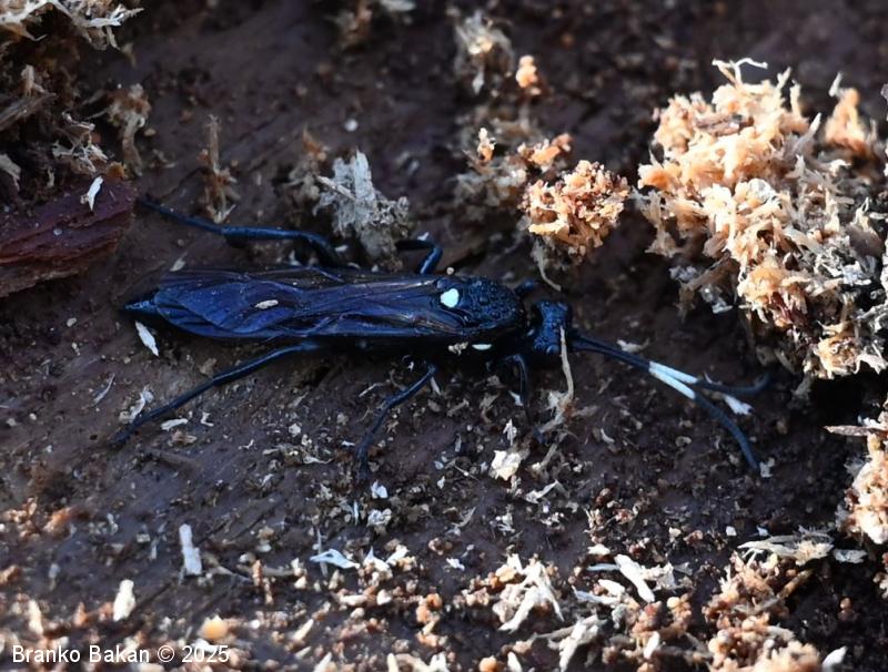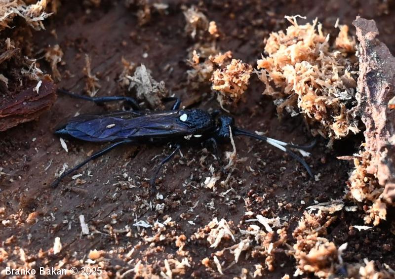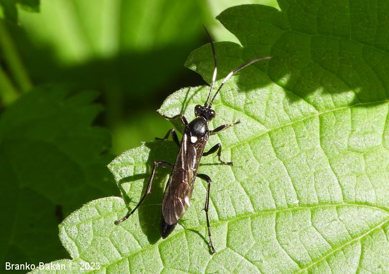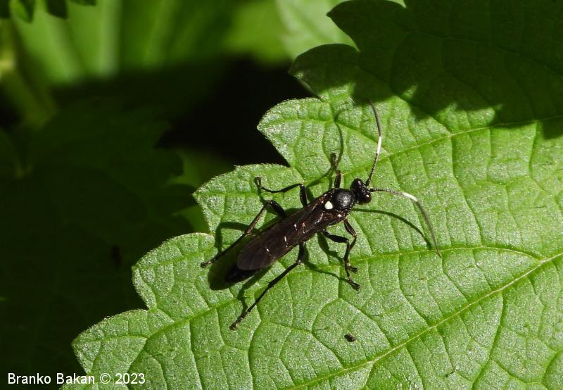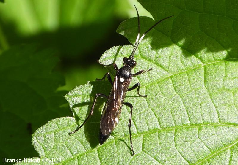 Samica: vitka, črno obarvana s temnimi krili. Glava je črna, v zadnjem delu konkavna, oči so temne, pogosto belo obrobljene. Tipalnice so nitaste, v prvi tretjini belo pasaste, bazalni členek je največji in kijast, 2. členek je vsaj 2-krat daljši kot je širok. Oprsje je ob straneh rahlo robato, sicer gladko in skoraj nebleščeče, črno. Ščitek (scutellum) je topo trikoten do jezičast, bel. Krila so nekoliko temna, pterostigma (temno žilno okence) je ozko eliptična, rjavkasta. Zadek je vitek, v celoti črn, v ospredju in na koncu zožen, brez izrazitega ovipozitorja (leglica). Noge so črne, srednje in zadnje goleni imajo po dva apikalna trnata izrastka.