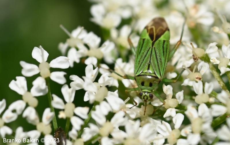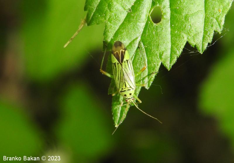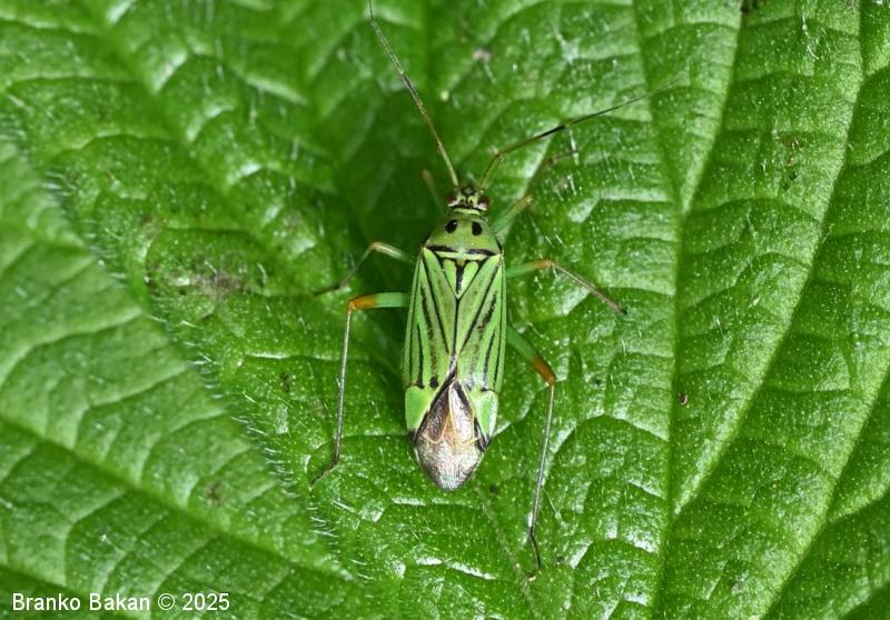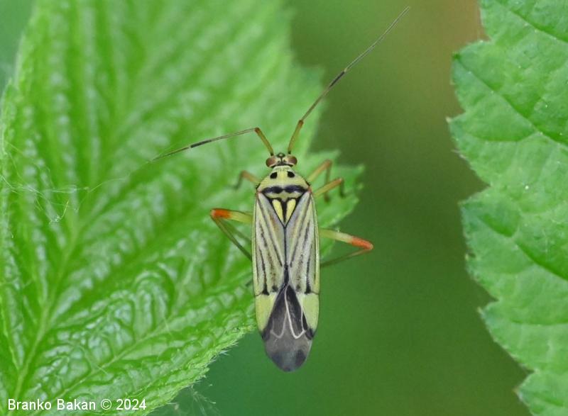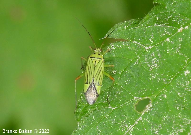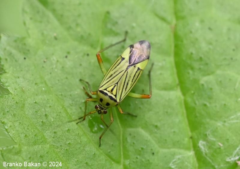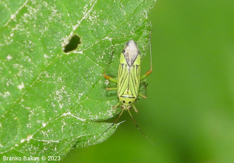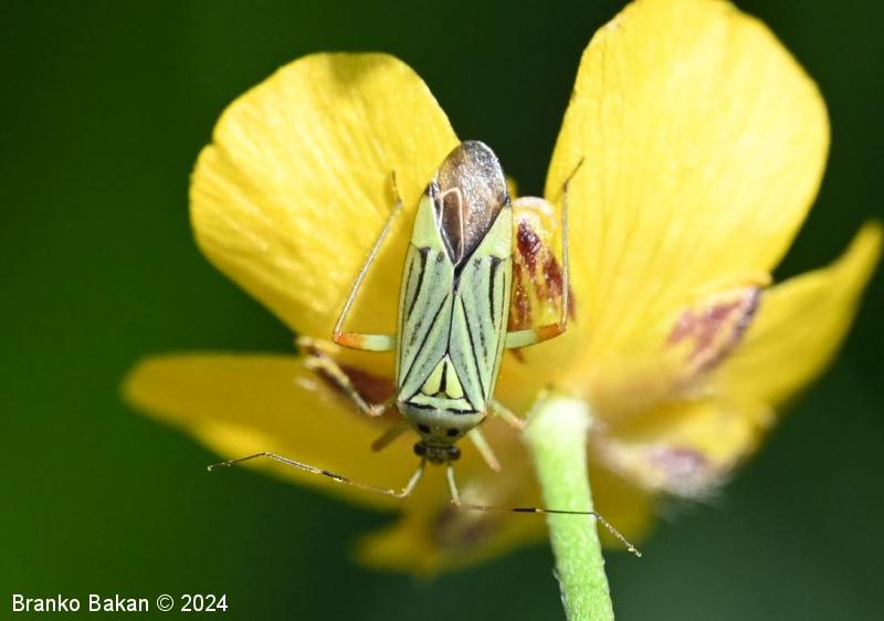 Odrasli osebki: telo je rumenozeleno, vitko, raztreseno poraslo s kratkimi, črnimi dlačicami. Glava je zelena, z drobnima črnima pikama med očmi, ki so rdečkaste, ter črno, vilasto razcepljeno liso v sprednjem delu in črno obrobljenim "ovratnikom". Tipalnice so vitke, dolge, zelenkaste ali rumenkastorjave, 2. členek je v spodnjem delu rumenkast, v zgornjem črn. Oprsje je trikotno trapezasto, z dvema črnima, kvadratastima lisama v ospredju, s črno prečno linijo v zadnjem delu in dvema temnima lisama na spodnjem zunanjem robu. Ščitek (scutellum) je jezičasto trikoten, z ostro črno, vzdolžno črto in večinoma črno obrobljen. Polpokrovke so v bazalnem delu ostro trikotno obrobljene, z bolj ali manj izrazito vzdolžno črtaste. Krila so črnorjava s temnejšimi lisami na konicah in svetlo obrobljenimi žilnimi okenci. Noge so zelenkaste, še posebej zadnja stegenca so pri vrhu rdečkasta ali rumenkasta.