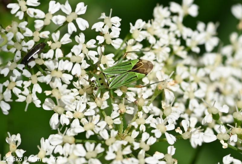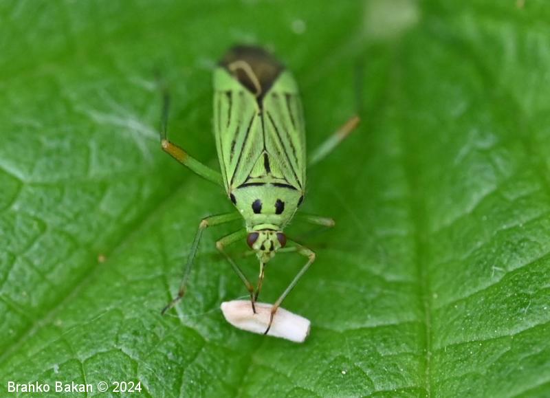 Obnašanje in razvoj: odrasli so aktivni nekje od sredine maja do julija. V glavnem sesajo rastlinske sokove različnih dreves, predvsem jesena (Fraxinus spp.) in zelnatih rastlin, plenijo pa tudi listne uši (Aphididae) ter druge manjše žuželke. Ličinke so rjavo- do črnordeče, s turkiznim odtenkom glave in oprsja, ki imata črno lisast vzorec, tipalnice so svetle, prvi členek je temen, drugi členek je temen v drugi polovici. Hranijo se napodoben način kot odrasli osebki.