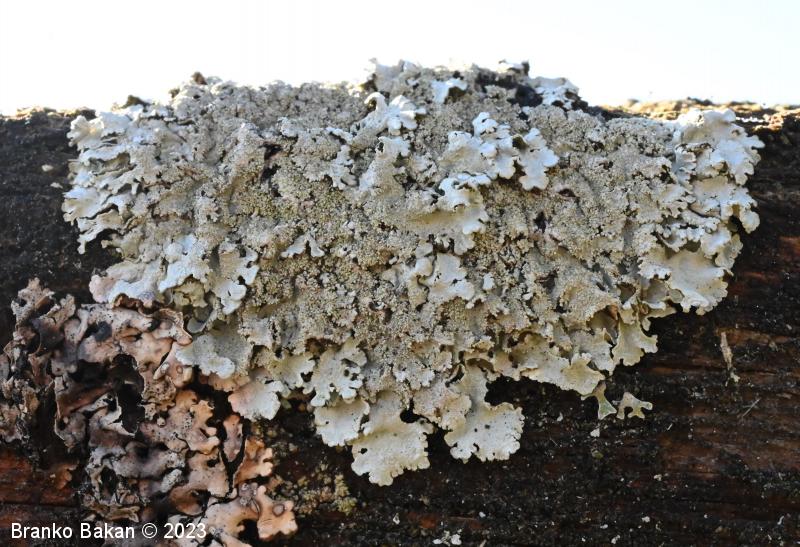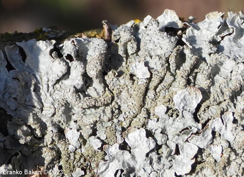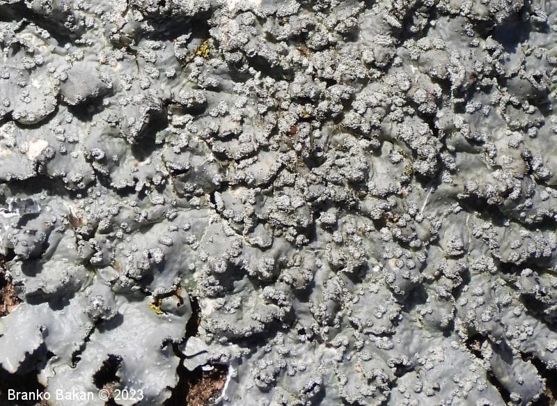 Opis: listasta steljka se plosko razrašča po površini in je rozetasta ali amorfna, nepravilno razrasla in deljena v široke, zaokrožene, 5 do 10 mm velike krpe, tiste ob zunanji strani se pogosto privzdignejo in so včasih rjavkasto obrobljene. Zgornja površina steljke je bledo siva do modrikasto siva (v mokrem stanju postane živo zelene barve), naravna, rahlo jamičasta, posejana s točkastimi pseudoficelami. Iz teh se pogosto razvijejo soraliji, kar daje rahlo kosmičast videz, večinoma so razporejeni v sredini steljke, redkeje na periferiji krp. Apoteciji se zelo redko razvijejo, so do 5 mm široki, kratkopecljati, pojavijo se na površini krp, imajo rdeče rjav, vbočen disk, rob je nazobčan, raven ali gosto posut s sorediji. Steljka je na spodnji strani svetla, belkasta ali rjavkasta, običajno ima ob robu pas brez rizin.