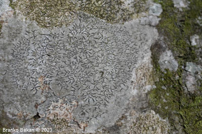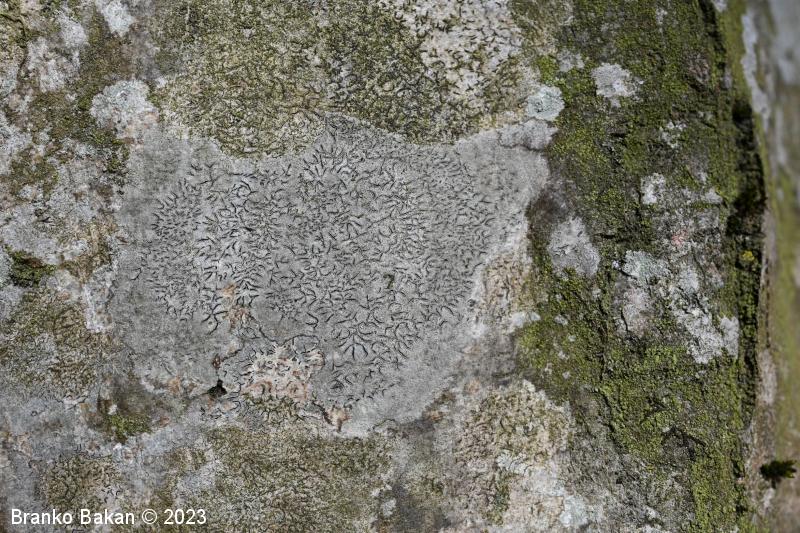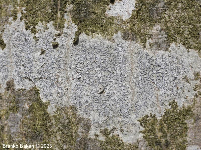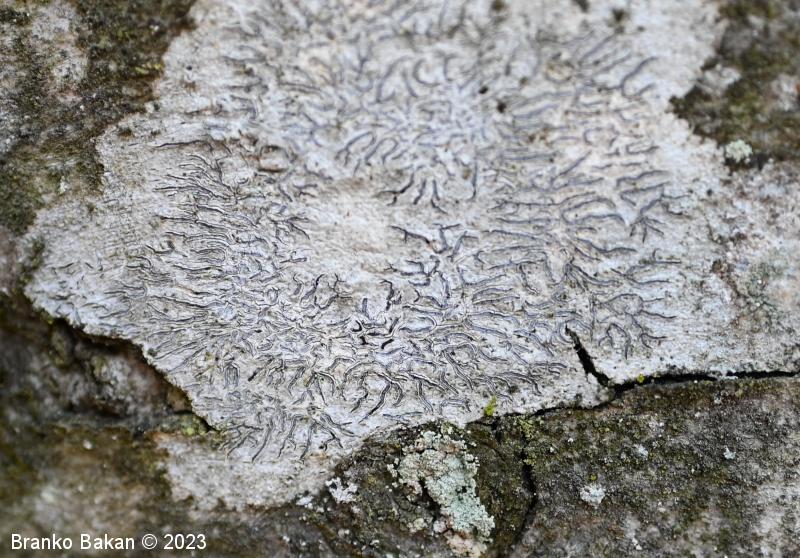 Opis: steljka je podobna sivobelemu ali zelenkastemu "madežu" in je skorjasta, bolj ali manj gladka do rahlo nagubana. Ne razvije soredijev. Apoteciji so v obliki vzdolžnih, prečnih do ukrivljenih brazd in so lahko ugreznjeni, na površju ali združeni v skupke. Njihov rob je črn, gladek, diski so ozki, črtalasti, večinoma belkasto poprhnjeni, brez steljkinega roba.