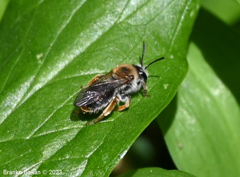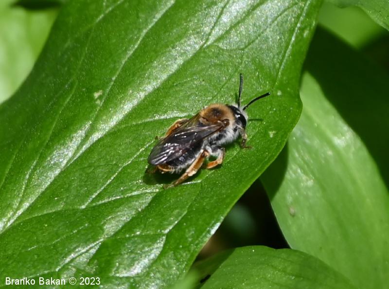 Samica: glava je temna, v sprednjem delu porasla s svetlimi dlakami, ploska, zgornji del z očesci je navadno ogolel (za rod Andrena sta značilni dve manjši brazdi pod vsako tipalnico). Tipalnice so temne, segajo nekje do začetka oprsja. Oprsje je temno, gosto poraslo z rdeče- oz. lisičjerjavimi dlakami. Krila so prosojna, s krepkejšo kostalno žilo, nekoliko presegajo zadek. Zadek je temen, eliptičast, večji del gol, le pri koncu je porasel z rjavordečimi dlakami. Noge so temne, zadnje goleni so porasle s svetlorjavimi dlakami.