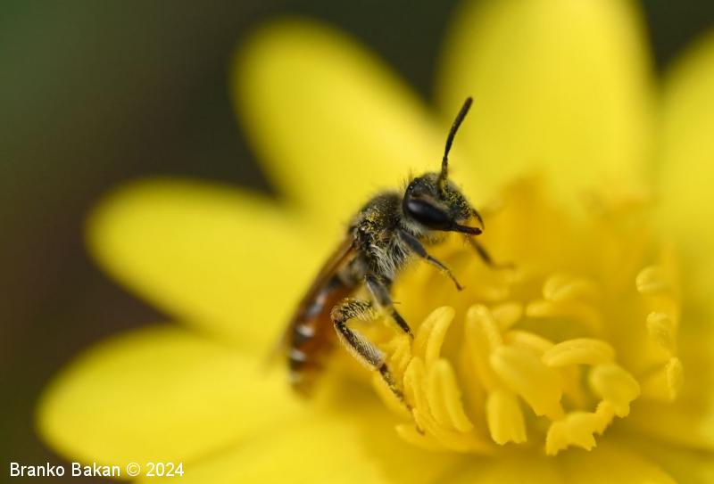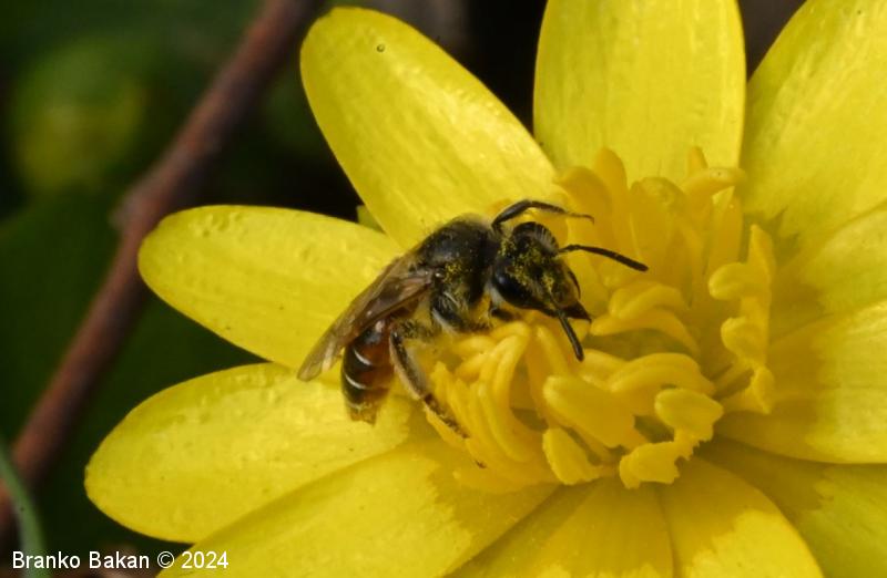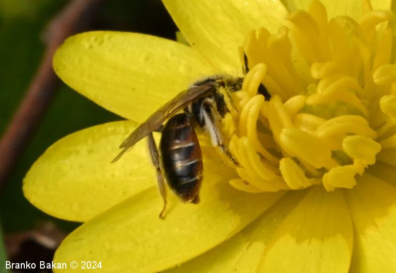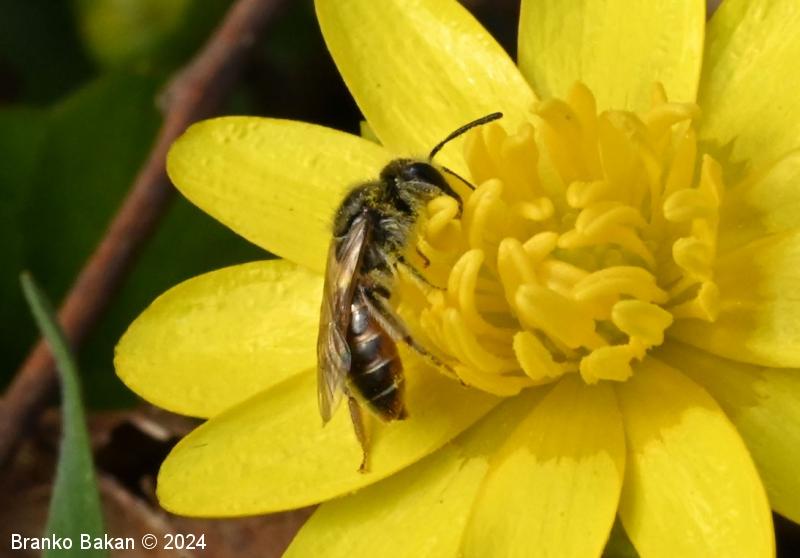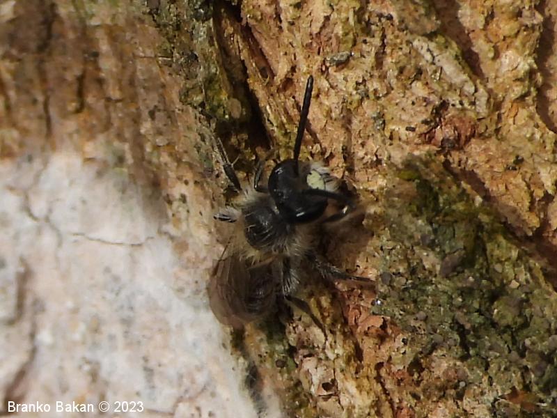 Samec: prepoznaven je po bledorumenkasti nadustni ploščici (clypeus), ki ima dve drobni črni piki, obroblja jo gosta serija dolgih, belih dlak. Telo je črno, le zadek je po trebušni strani rdečerjav (manj kot pri samici). Oprsje je gosteje poraslo s svetlimi dlakami, prav tako rob zadka, ki ima manj izrazite bele pasove.
