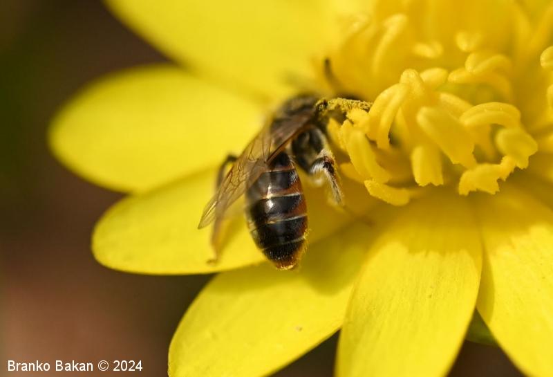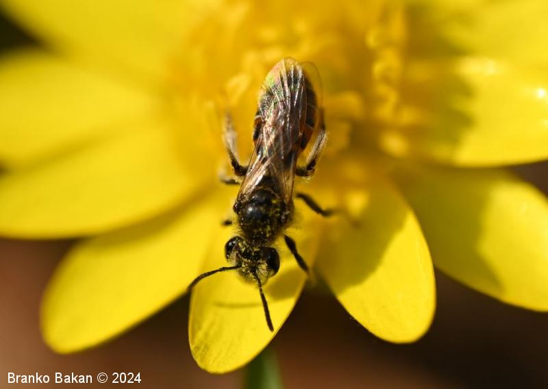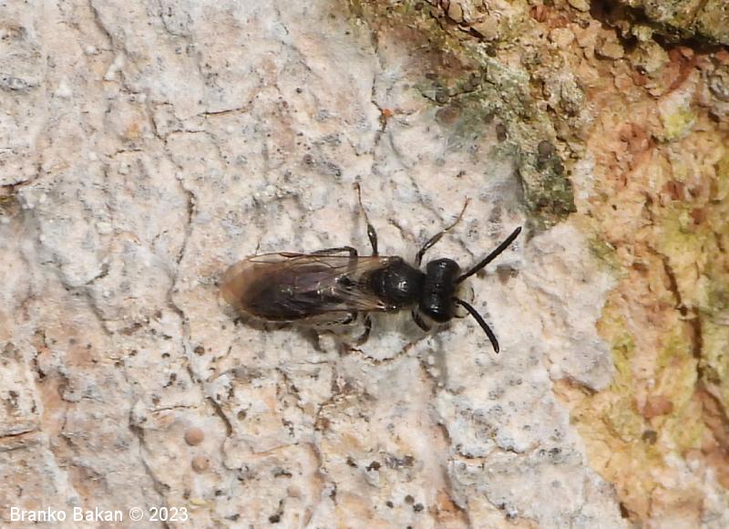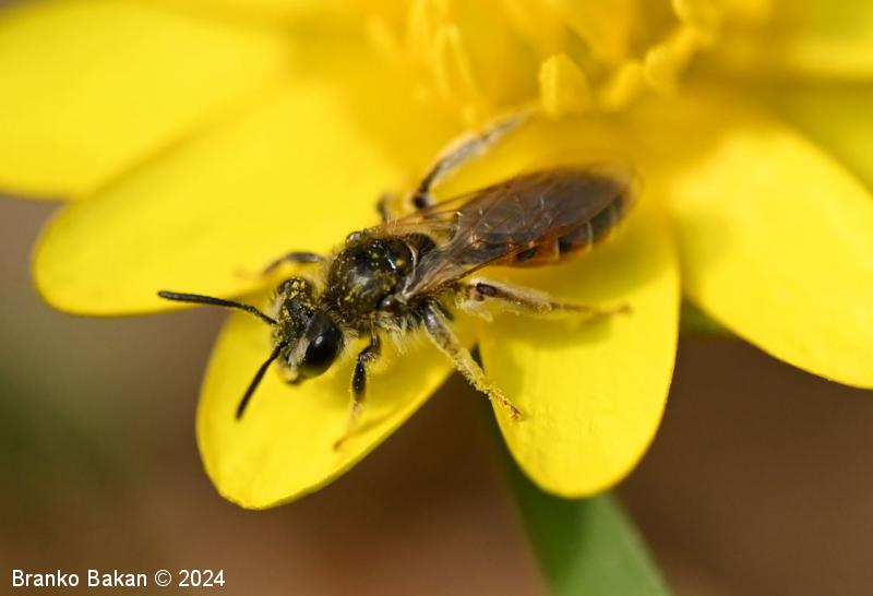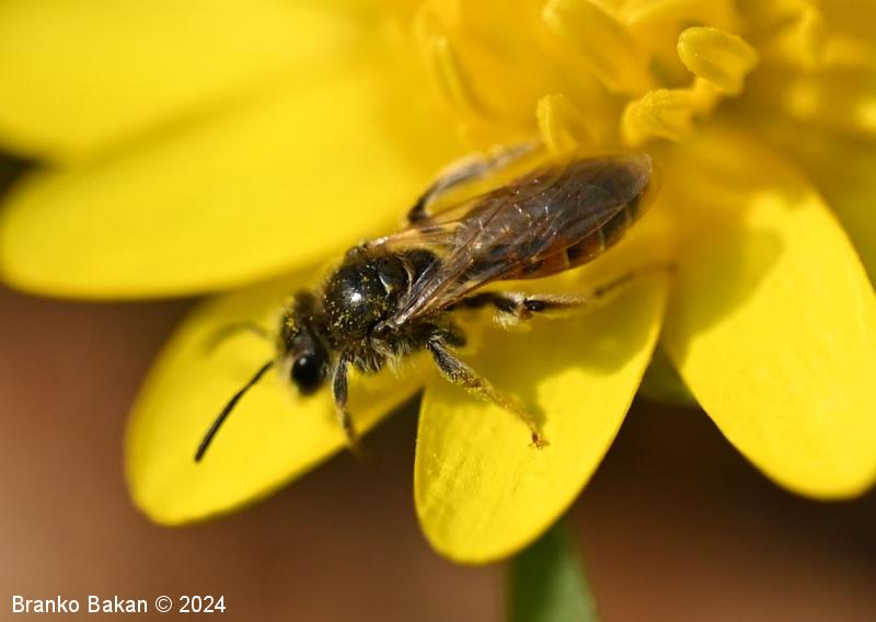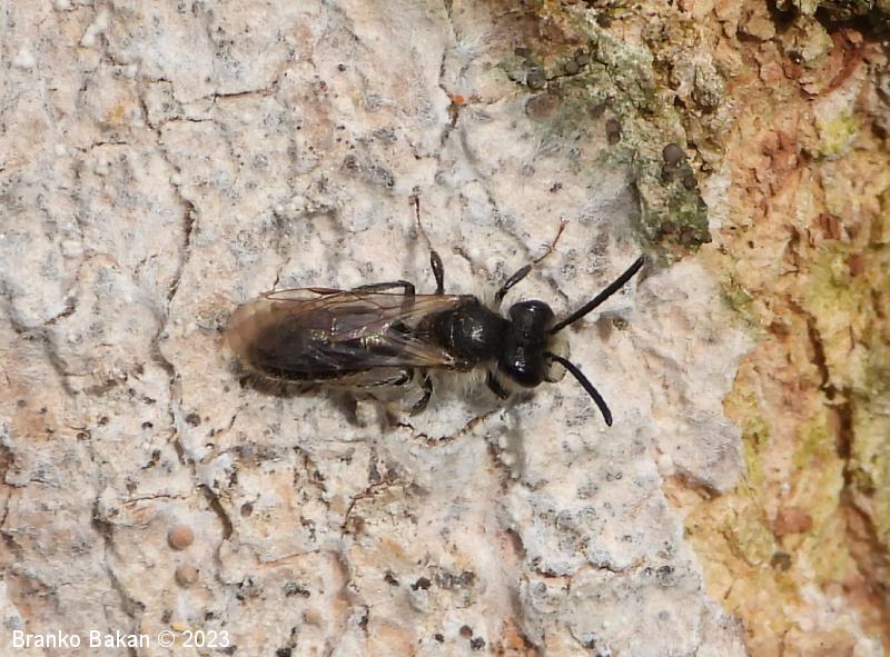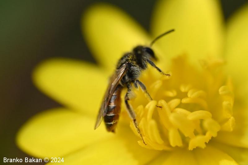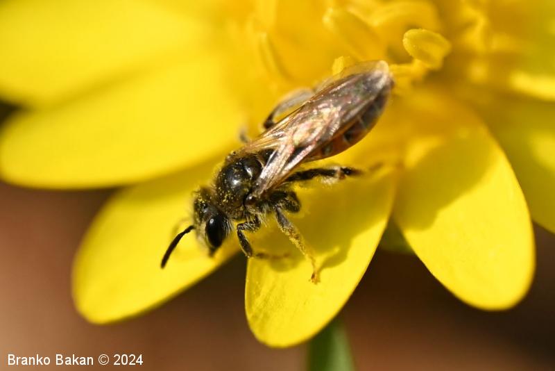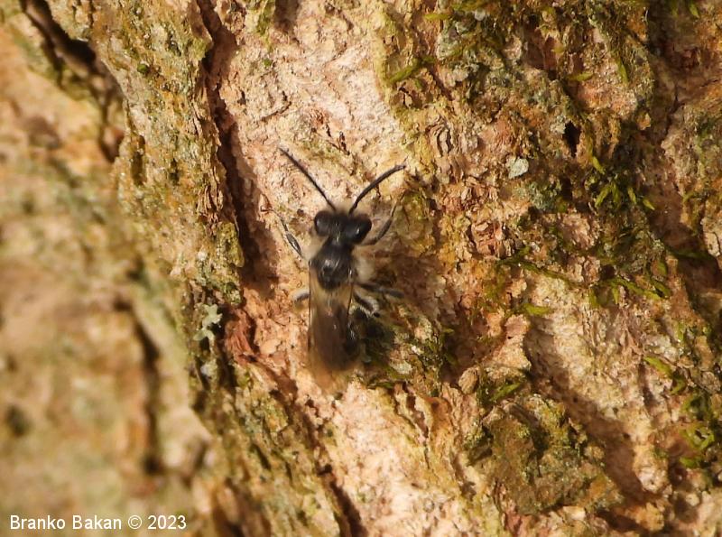 Samica: prepoznavna po rdečerjavih lisah na bočnem delu zadka. Glava je široka, črna, delno porasla s svetlimi dlakami, oči so velike, črne, ob straneh s tipalčno brazdo (značilnost roda). Oprsje je prav tako črno, po zgornji strani večinoma golo in bleščeče, skoraj gladko, ob straneh je poraslo z belkastimi dlakami. Krila so rahlo rjavkasta, sicer prosojna, pterostigma je ozka, rjavkasta. Zadek je črn in kontrastno ozko belo pasast, po spodnji strani rdečerjav, pogosto rdečerjavo lisast tudi po bočni strani (trikotne lise). Noge so črne, porasle z belkastimi (svetlimi) dlakami.