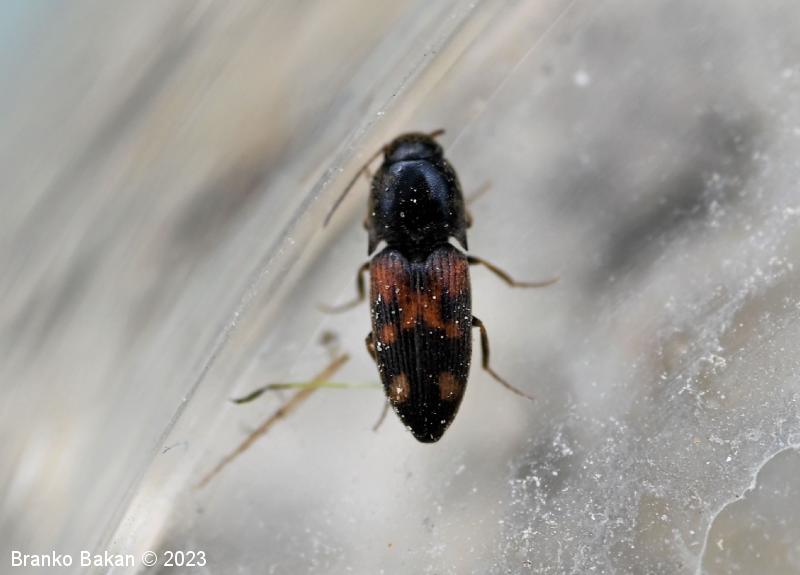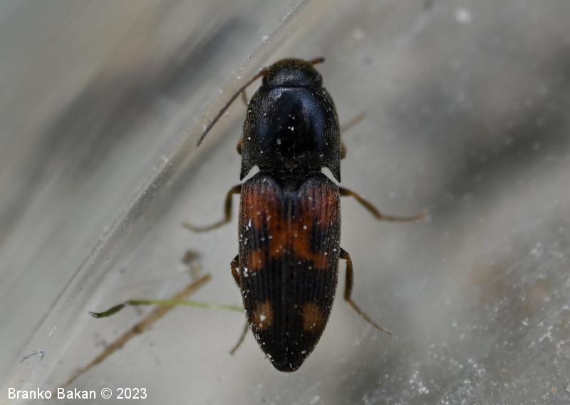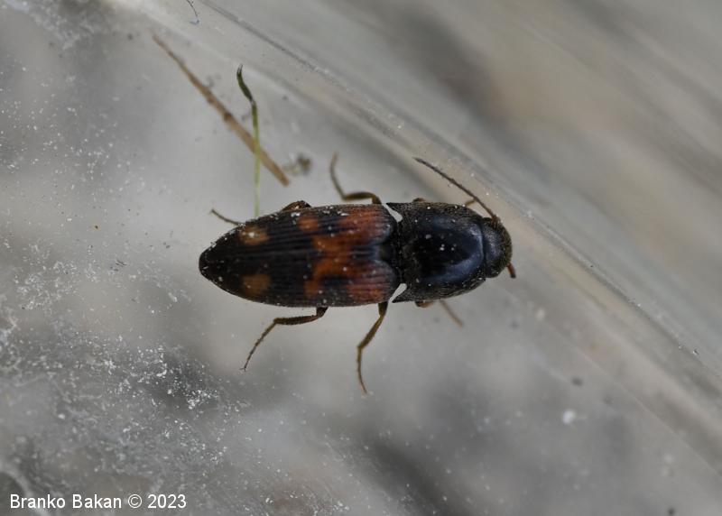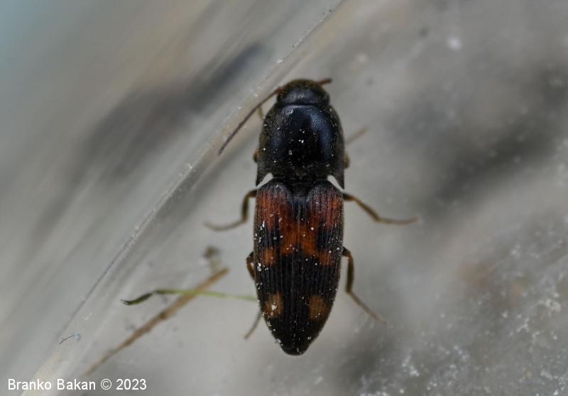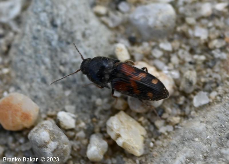 Odrasli osebki: precej drobni hrošči s prepoznavno "pisanimi" pokrovkami. Telo je podolgasto, poraslo z rumenkastimi, prilaglimi dlakami. Glava je črna, rahlo kimasta, ustni organi so navzdol upognjeni. Tipalnice so nitaste, na bazi rjavkaste. Oprsje je široko zvonasto, v spodnjem delu ob straneh podaljšano v daljša, ostra trnata izrastka, tako široko kot pokrovke, grobo jamičasto, črno. Pokrovke so v sprednjem delu rjavordeče, sicer črne, na zadnjem delu z dvema rumenkastorjavima lisama (obarvanost lahko močno variira), vzdolžno jamičasto izbrazdane. Noge so rumenkastorjave s črnimi lisami.