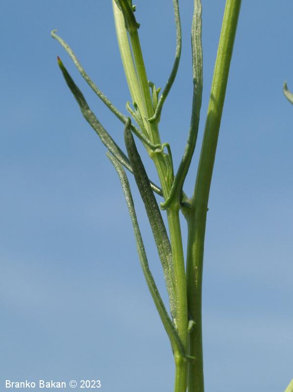 Opis: močno razrasla, večinoma pokončna trajnica z dolgimi, skoraj šibastimi poganjki. Listi so ozko črtalasti, celorobi ali po robu rastreseno porasli z zelo majhnimi zobci, koničasti, 3 do 5 cm dolgi. Koški so večinoma posamični, na dolgih pecljih. Jezičastih (zunanji) cvetov koška je večinoma po 13, svetlorumeni, iztegnjeni, cevasti (notranji) cvetovi so temnorumeni. Zunanji ovojek je sestavljen iz 10 do 20 listov, ki so širokokožnati in imajo temno konico. Plod (rožka) je rjav, vzdolžno rebrast.