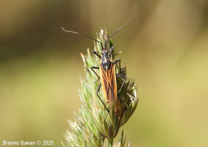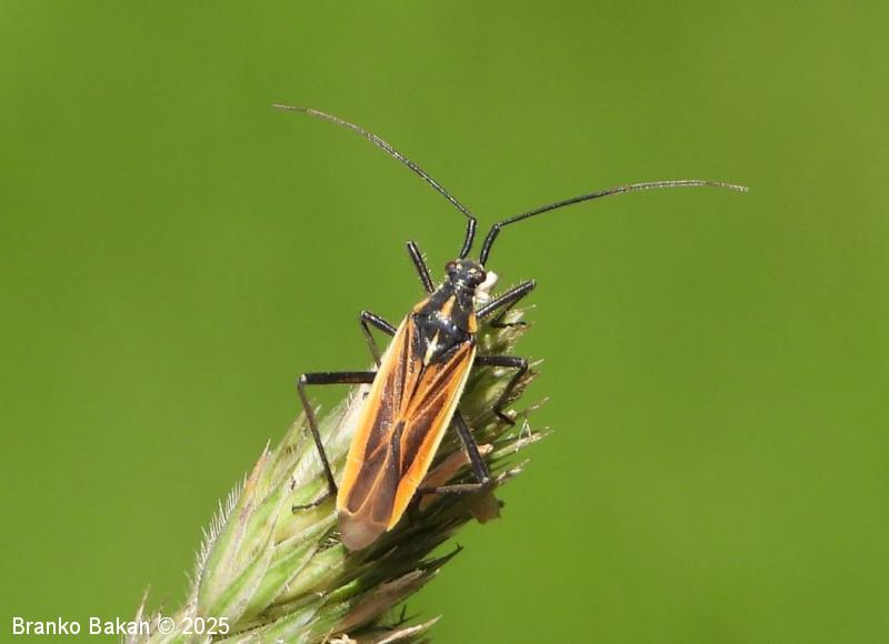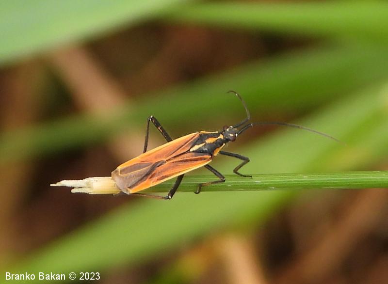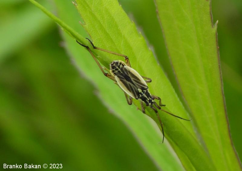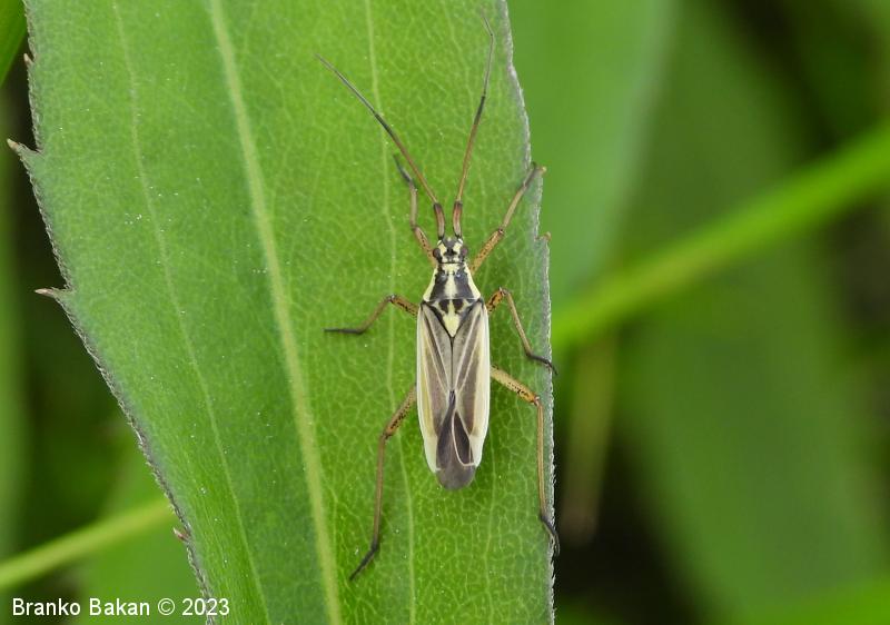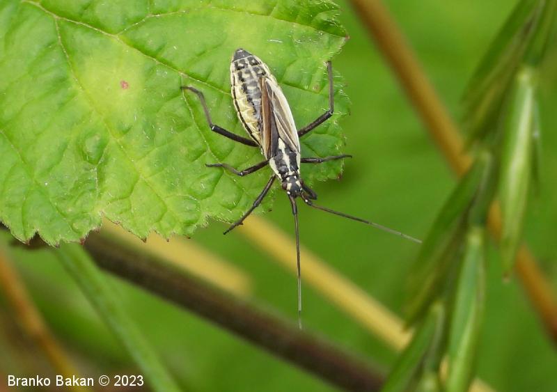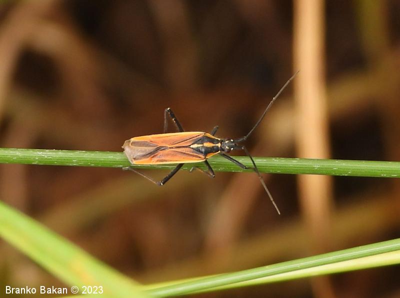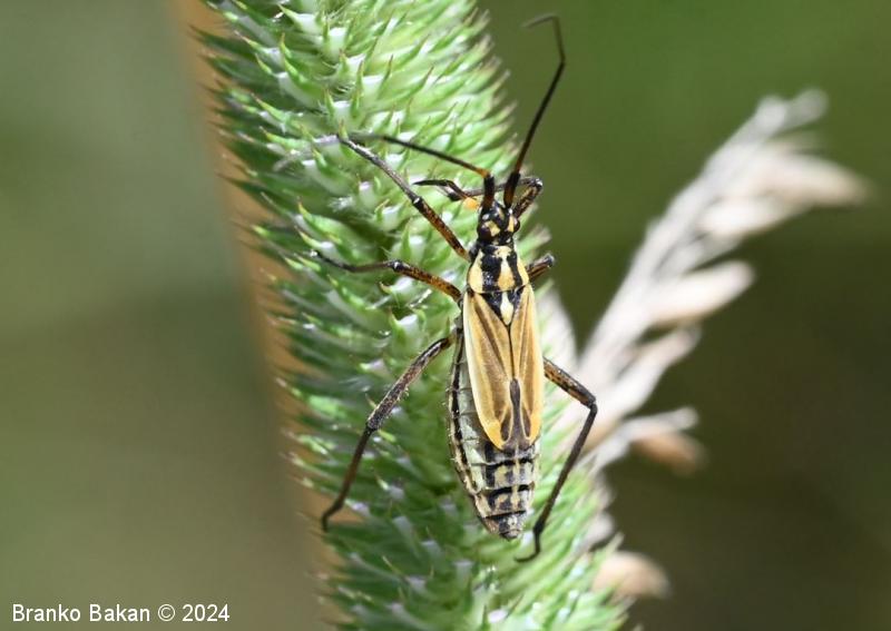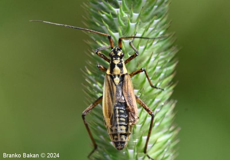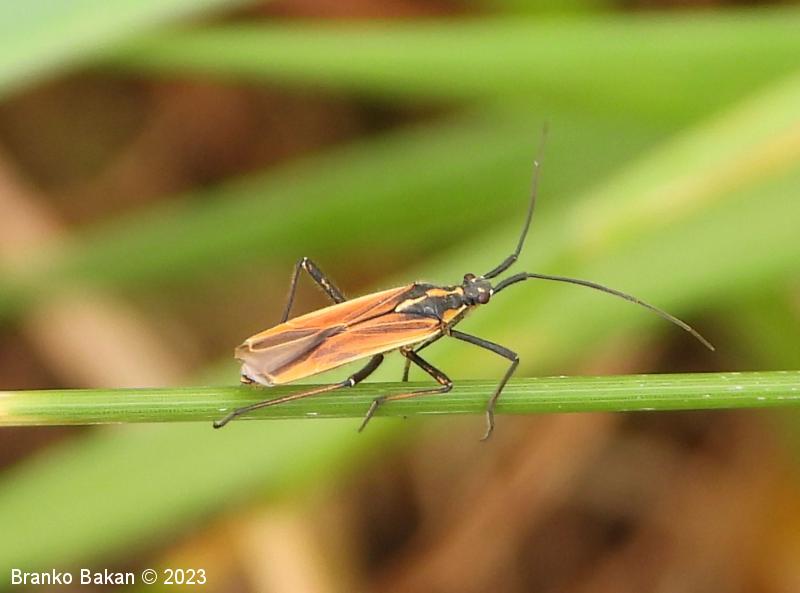 Odrasli osebki: telo je vitko, podolgasto, plosko. Glava je drobna, črna, z rumenkastimi lisami ob očeh in temenu, z vzdolžno brazdo med očmi. Tipalnice so dolge, črne, 2. segment je daljši kot 3. in 4. skupaj. Oprsje je ozko trapezasto, črno, z osrednjo rumenkasto ali rjavkasto progo in rumenkasto obrobljeno, rahlo grbasto v sredini. Ščitek (scutellum) je trikoten, črn, z osrednjo rumeno liso. Pokrovke segajo pri samcih do konca zadka, medtem ko so samice kratkokrile (brahiptere). Sprva so pokrovke črnorumene do bledo zelenkaste, kasneje potemnijo in postanejo lisičjerjave barve. Letalna krila so temno rjava s svetlimi žilami. Noge so dolge, vitke, rumenkastorjave, črno pikaste, porasle z dlakami.