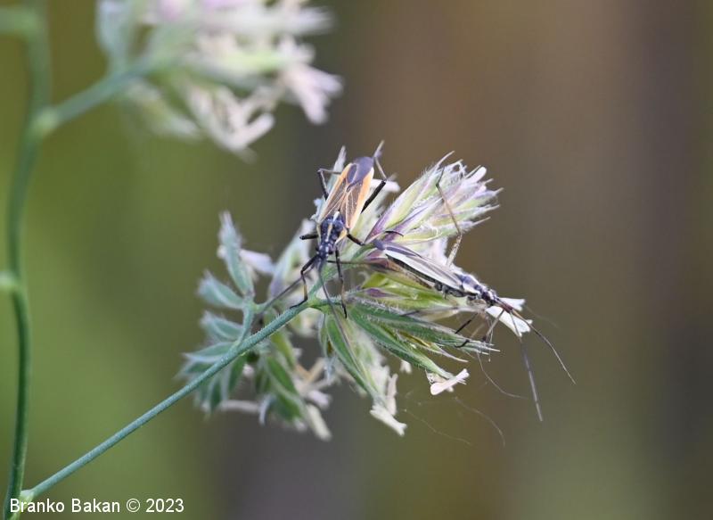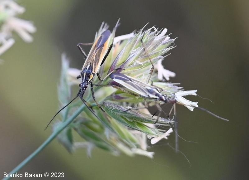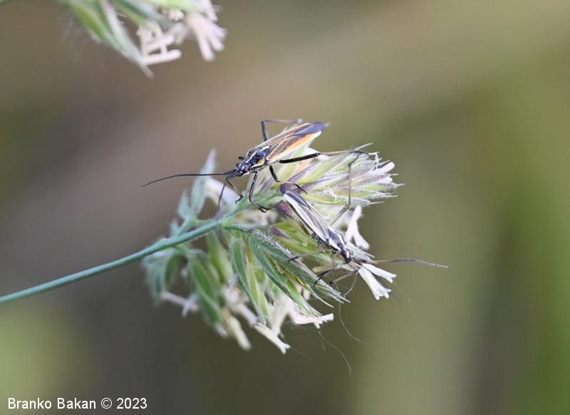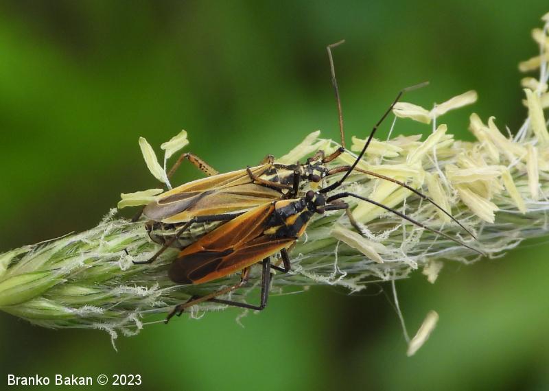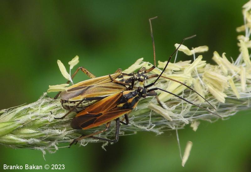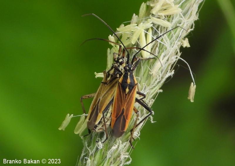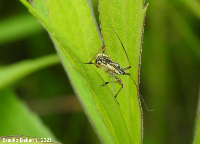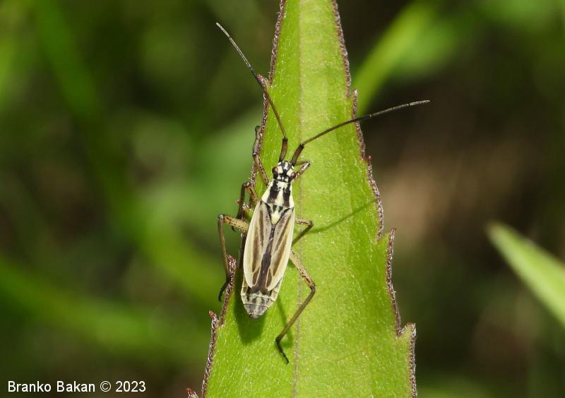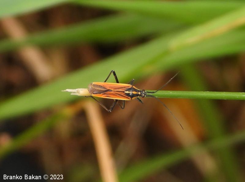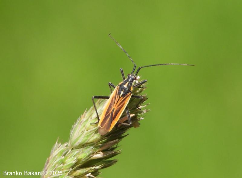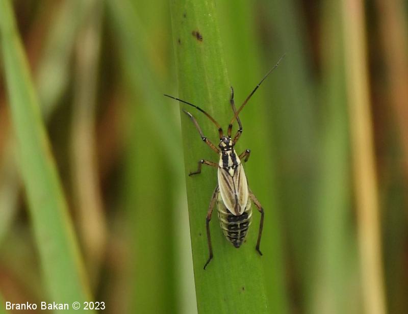 Odrasli osebki: telo je vitko, podolgasto, plosko. Glava je drobna, črna, z rumenkastimi lisami ob očeh in temenu, z vzdolžno brazdo med očmi. Tipalnice so dolge, črne, 2. segment je daljši kot 3. in 4. skupaj. Oprsje je ozko trapezasto, črno, z osrednjo rumenkasto ali rjavkasto progo in rumenkasto obrobljeno, rahlo grbasto v sredini. Ščitek (scutellum) je trikoten, črn, z osrednjo rumeno liso. Pokrovke segajo pri samcih do konca zadka, medtem ko so samice kratkokrile (brahiptere). Sprva so pokrovke črnorumene do bledo zelenkaste, kasneje potemnijo in postanejo lisičjerjave barve. Letalna krila so temno rjava s svetlimi žilami. Noge so dolge, vitke, rumenkastorjave, črno pikaste, porasle z dlakami.