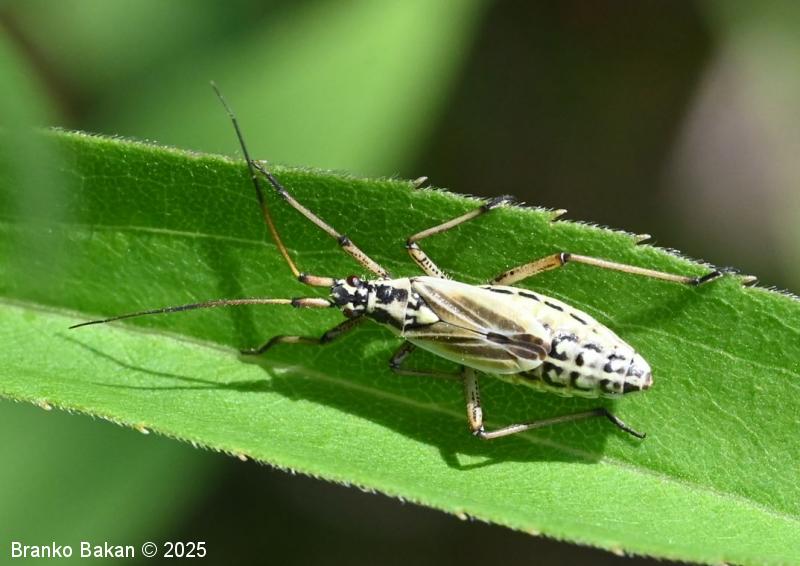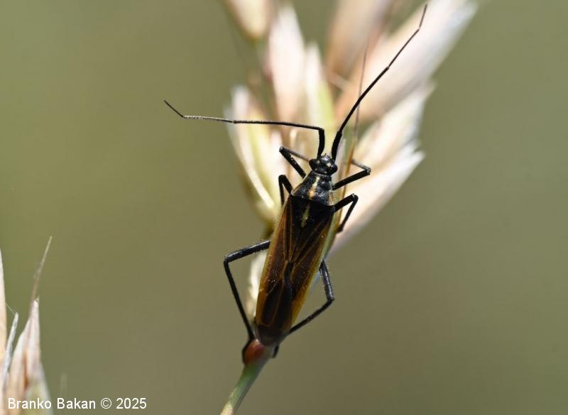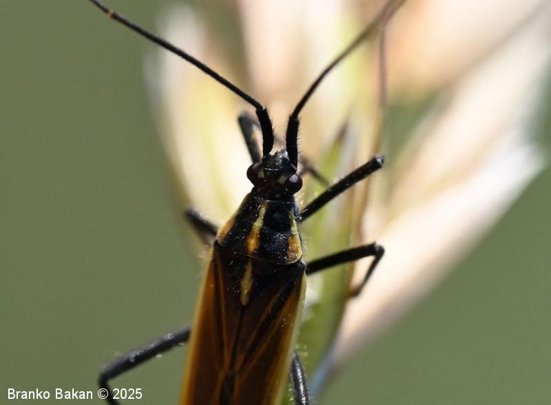 Odrasli osebki: telo je vitko, podolgasto, plosko. Glava je drobna, črna, z rumenkastimi lisami ob očeh in temenu, z vzdolžno brazdo med očmi. Tipalnice so dolge, črne, 2. segment je daljši kot 3. in 4. skupaj. Oprsje je ozko trapezasto, črno, z osrednjo rumenkasto ali rjavkasto progo in rumenkasto obrobljeno, rahlo grbasto v sredini. Ščitek (scutellum) je trikoten, črn, z osrednjo rumeno liso. Pokrovke segajo pri samcih do konca zadka, medtem ko so samice kratkokrile (brahiptere). Sprva so pokrovke črnorumene do bledo zelenkaste, kasneje potemnijo in postanejo lisičjerjave barve. Letalna krila so temno rjava s svetlimi žilami. Noge so dolge, vitke, rumenkastorjave, črno pikaste, porasle z dlakami.