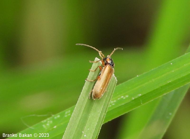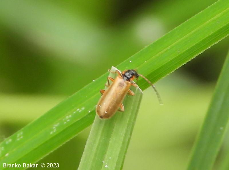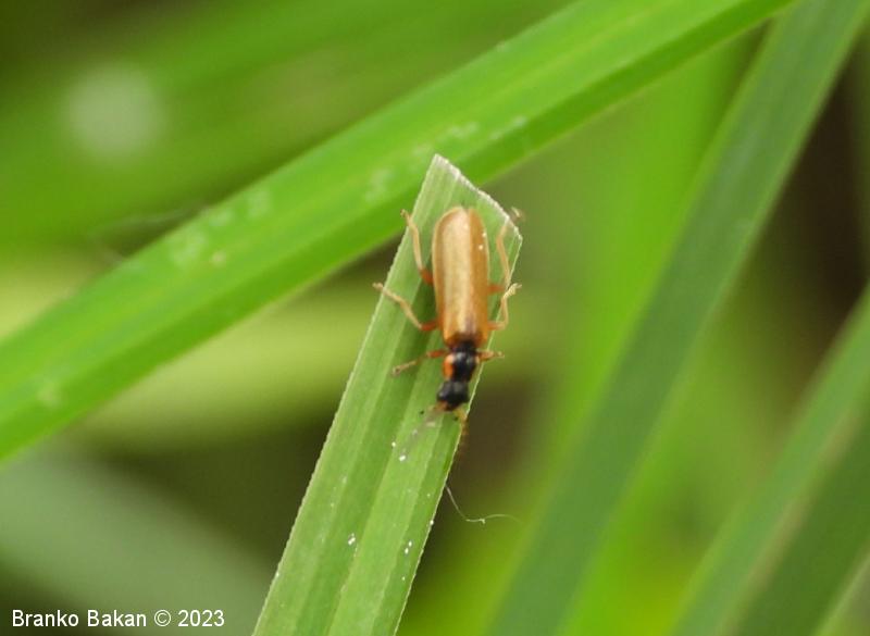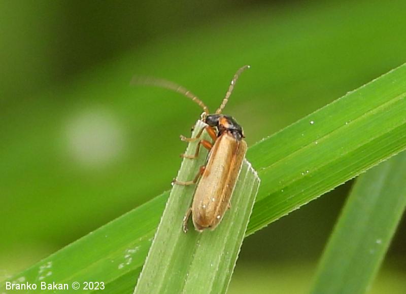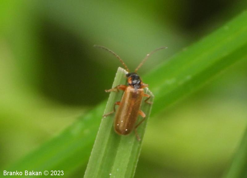 Odrasli osebki: telo je vitko, podolgasto. Glava je črna, tipalnice so nitaste, drobnočlenaste, v spodnjem delu rumenkastorjave, v zgornjem delu temne, presegajo oprsje. Oprsje je črno (redko oranžnorumeno), zaokroženo ščitasto, z oranžnorumenim robom. Pokrovke so rumenorjave, z ravnimi robovi, v spodnjem delu rahlo razširjene, mehkodlakave. Zadek je temen. Noge so rumenorjave.