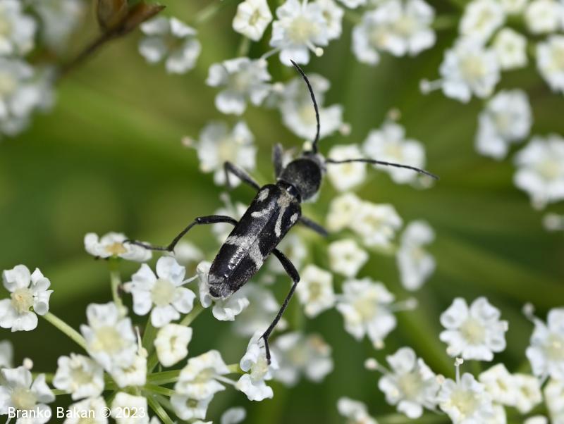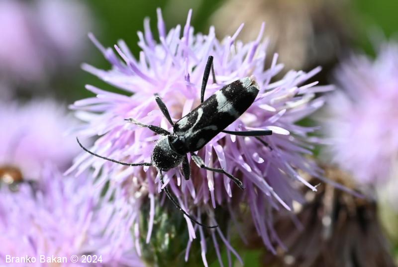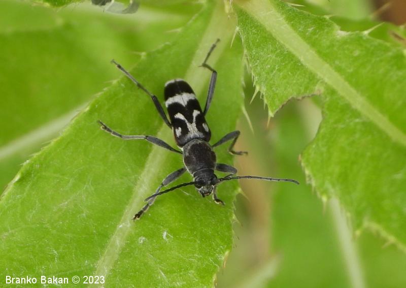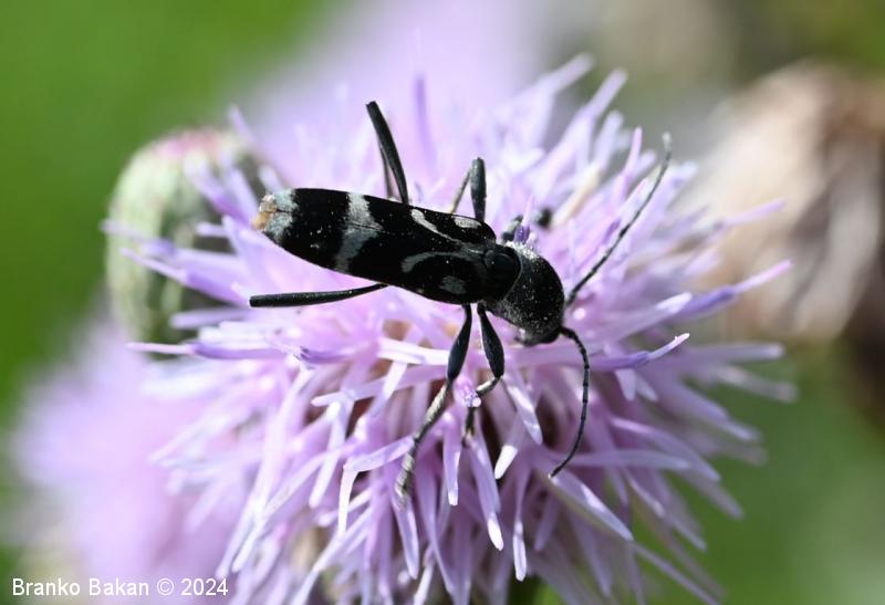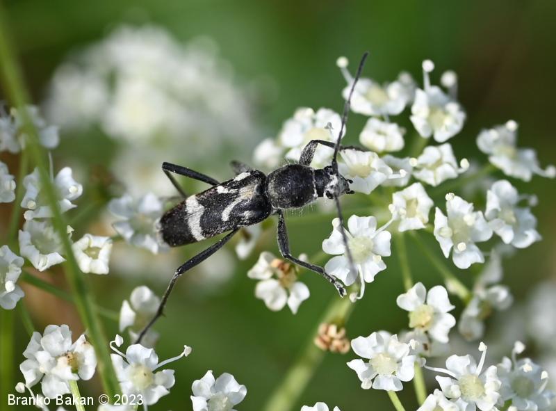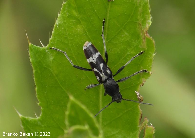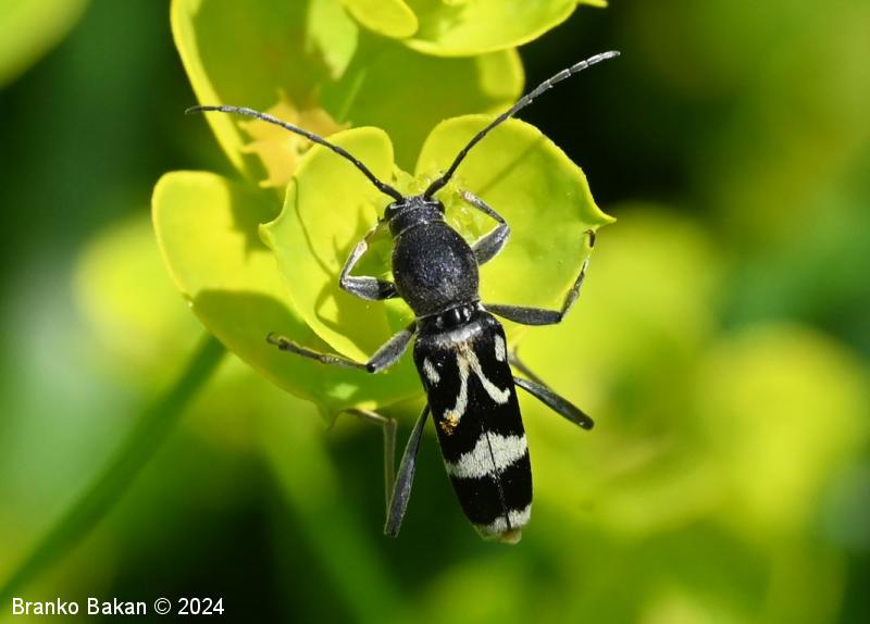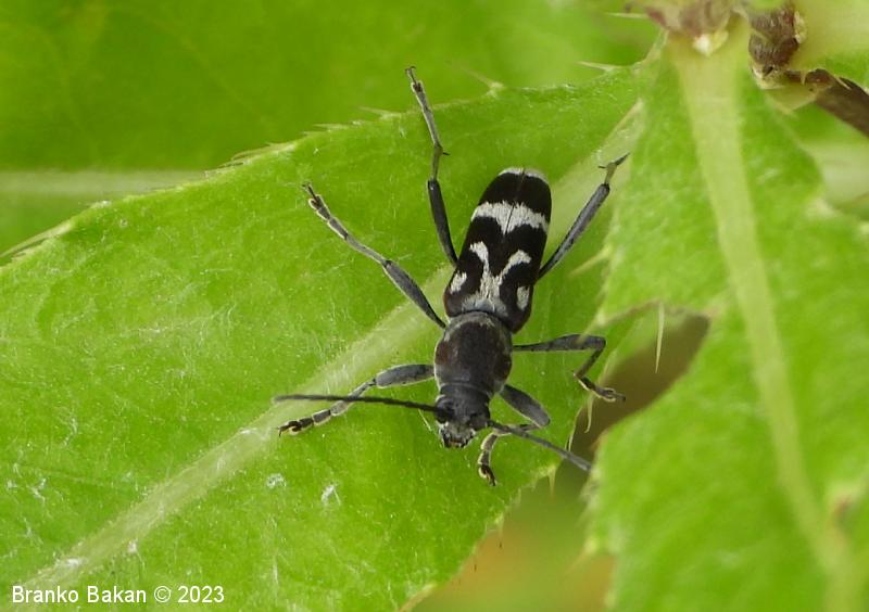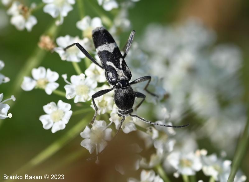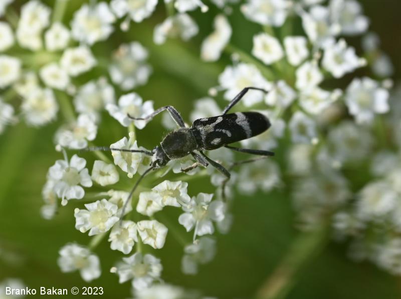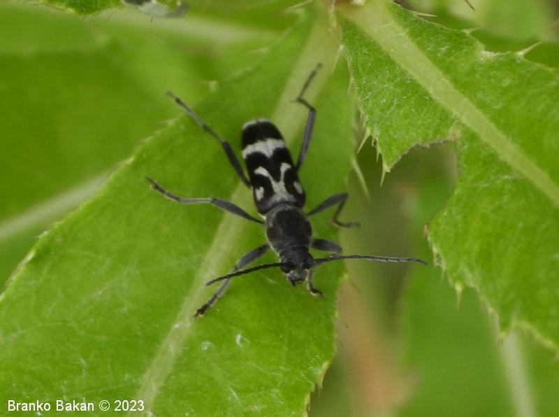 Odrasli osebki: vitki, temni, z značilno belo risbo na pokrovkah. Glava je drobna, črna, svetlo dlakava, oči so črne. Tipalnice so nitaste, temne, dosegajo nekje sredino pokrovk. Oprsje je jajčasto, ob straneh zaobljeno, pri vrhu in v spodnjem delu zoženo, poraslo z dolgimi, svetlimi dlakami, sicer črno. Pokrovke so podolgaste, nekoliko krajše od zadka, temne, z belkastimi dlakami, ki tvorijo zaokrožen pas v zgornjem delu, ki oklepa belo liso, v osrednjem delu širok prečni pas, tudi konice kril so belodlakave. Noge so dolge, vitke, temne.