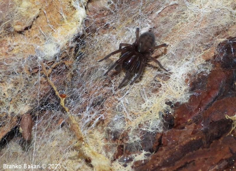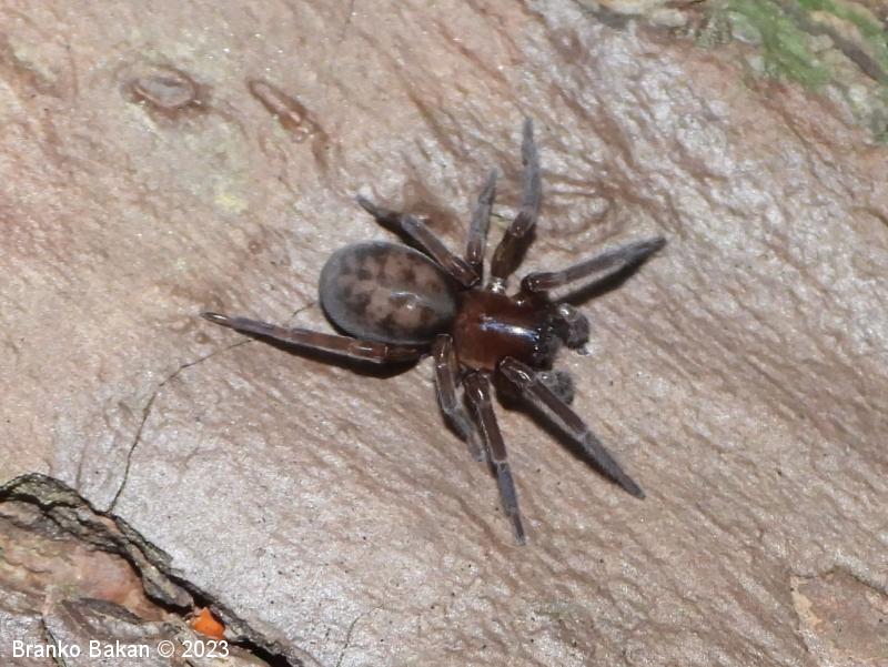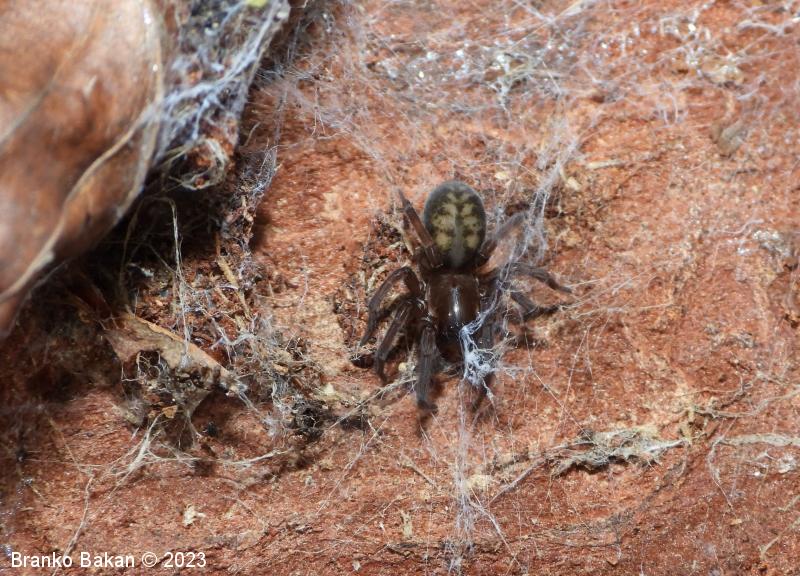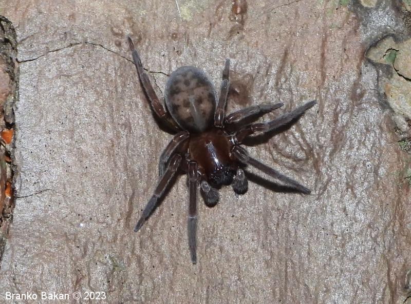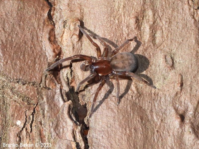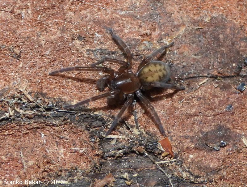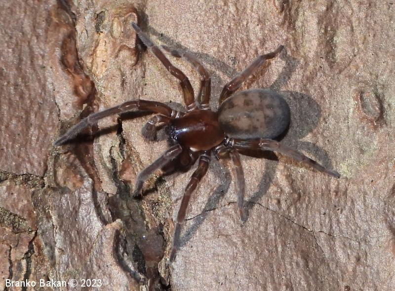 Samica: glavoprsje je večinoma rdečerjavo, redkeje nekoliko črnorjavo, precej krepko, ščitasto, v sprednjem delu nekoliko zoženo. Oči so nameščene v dveh redeh, en par oči je nameščen nad ostalimi šestimi. Zadek je precej velik, jajčast, večinoma črnorjav (včasih tudi svetel), s prepoznavnimi svetlimi lisami, ki potekajo vzdolž osrednjega dela in tvoriji značilen drevesast vzorec. Noge so rdečerjave, večinoma niso daljše od celotnega telesa, prekrite s sivkastimi mehkimi dlakami.