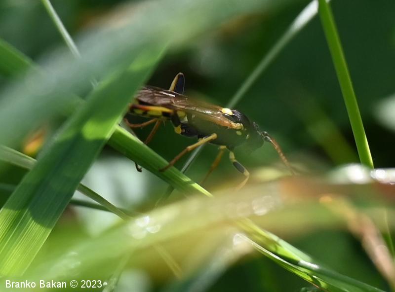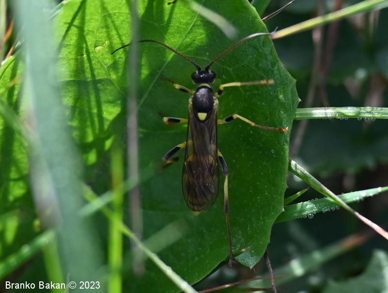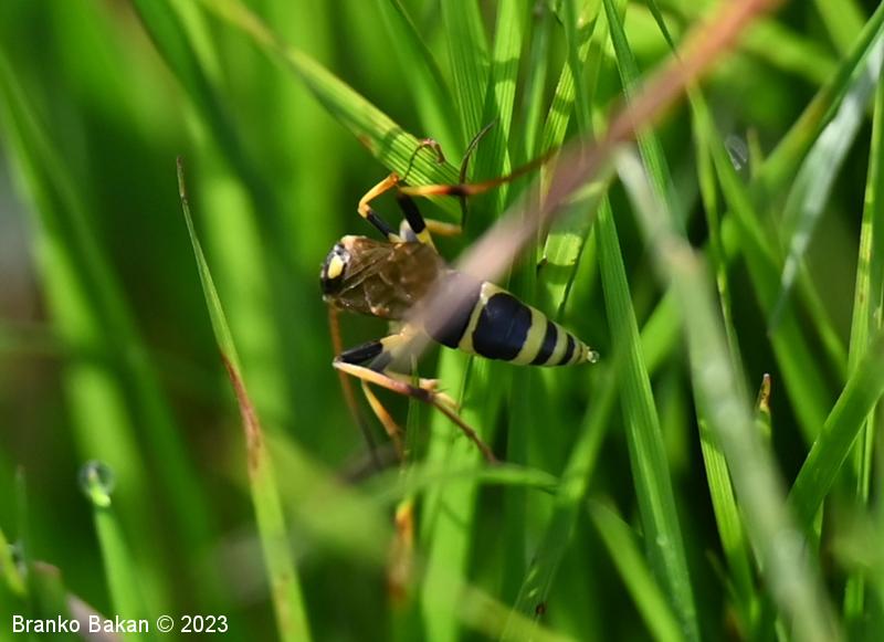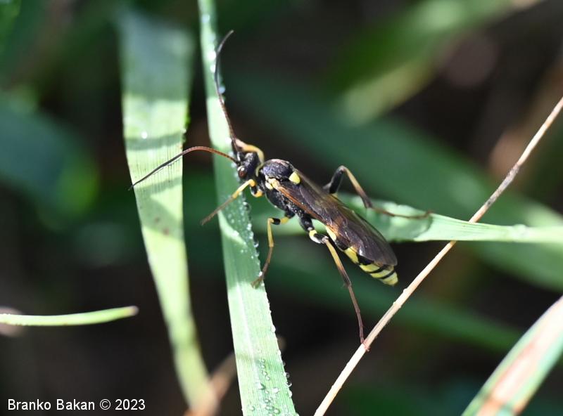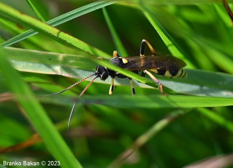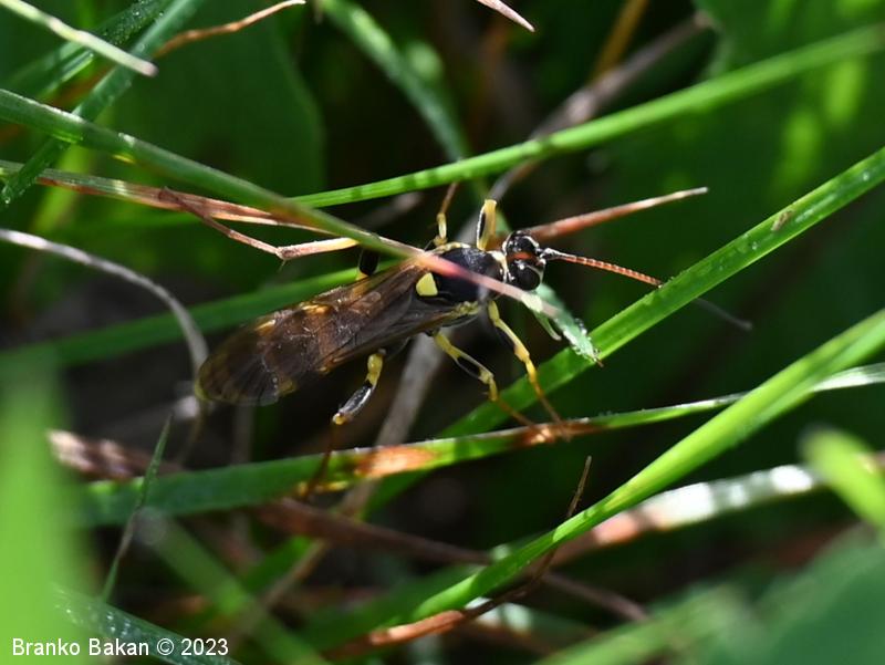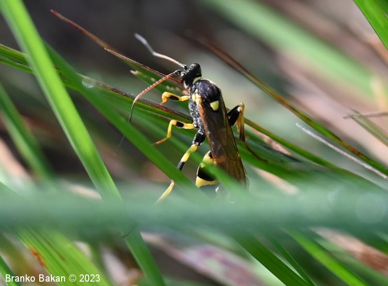 Samica: je "osjelika". Glava in oči so črne, oči so svetlo obrobljene, ustni deli so bledorumenkasti. Tipalnice so zelo dolge (le malo krajše od telesa), rdečerjave, na bazi črne in proti konicam zatemnjene. Oprsje je krepko, črno, rahlo hrapavo, proti zadku je zoženo in s kratkima, ostrima trnoma na zadnjem delu, na sprednjem delu ozko rumeno obrobljeno, ob bazi kril z rumenimi lisami. Ščitek (scutellum) je jezičasto trikoten, rumen, črno obrobljen. Krila so ozka, podolgasta, krajša od zadka, zelo rahlo rjavkasto nadahnjena, s krepko, rjavkasto pterostigmo in okrepljenim kostalnim delom. Zadek je vitek, koničast, brez izrazite leglice (ovipozitor), črn, z dvema ožjima rumenima pasovoma v sprednjem delu in večinoma po štirmi širokimi rumenimi pasovi v zadnjem delu. Noge so dolge, vitke, "pisane", rumene, s črnimi lisami na prvem paru stegenc ter s skoraj v celoti črnimi zadnjimi stegenci, zadnje goleni so v spodnjem delu črne, pogosto rjavkasto nadahnjene, tudi zadnja stopalca so rjavkasta.