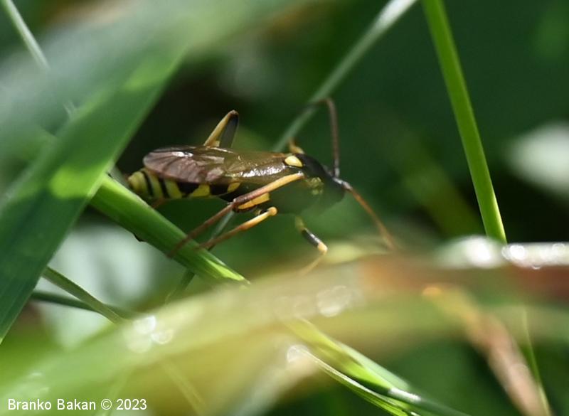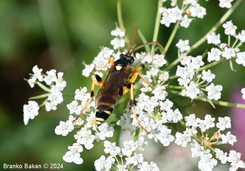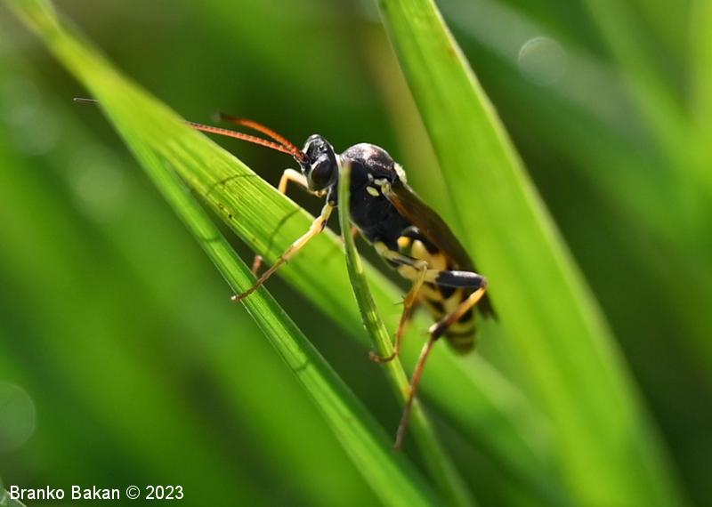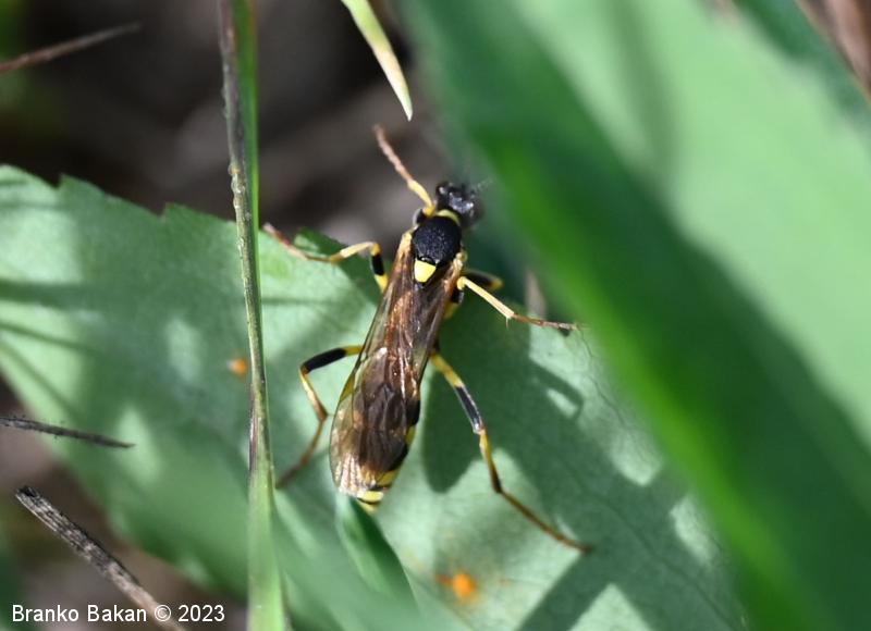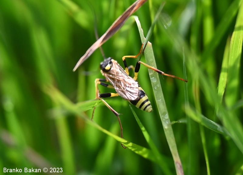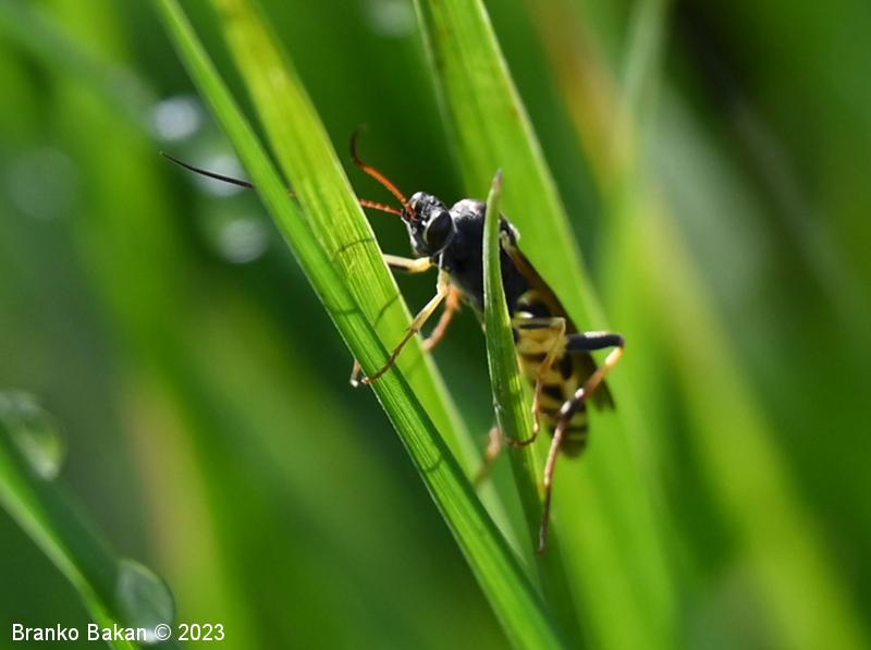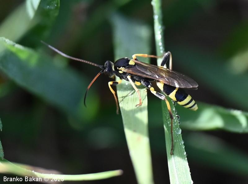 Samica: je "osjelika". Glava in oči so črne, oči so svetlo obrobljene, ustni deli so bledorumenkasti. Tipalnice so zelo dolge (le malo krajše od telesa), rdečerjave, na bazi črne in proti konicam zatemnjene. Oprsje je krepko, črno, rahlo hrapavo, proti zadku je zoženo in s kratkima, ostrima trnoma na zadnjem delu, na sprednjem delu ozko rumeno obrobljeno, ob bazi kril z rumenimi lisami. Ščitek (scutellum) je jezičasto trikoten, rumen, črno obrobljen. Krila so ozka, podolgasta, krajša od zadka, zelo rahlo rjavkasto nadahnjena, s krepko, rjavkasto pterostigmo in okrepljenim kostalnim delom. Zadek je vitek, koničast, brez izrazite leglice (ovipozitor), črn, z dvema ožjima rumenima pasovoma v sprednjem delu in večinoma po štirmi širokimi rumenimi pasovi v zadnjem delu. Noge so dolge, vitke, "pisane", rumene, s črnimi lisami na prvem paru stegenc ter s skoraj v celoti črnimi zadnjimi stegenci, zadnje goleni so v spodnjem delu črne, pogosto rjavkasto nadahnjene, tudi zadnja stopalca so rjavkasta.