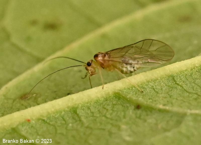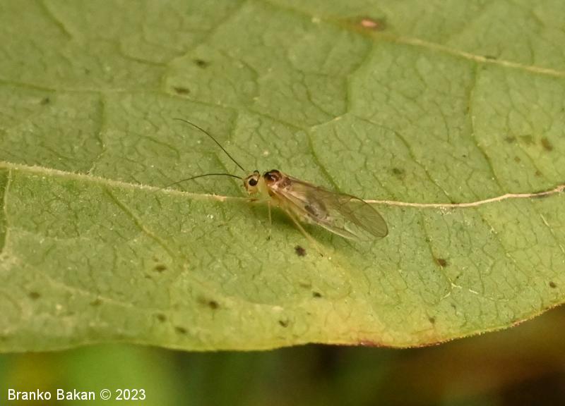 Odrasli osebki: telo je bledikavo, krila so v celoti prosojna, brez lis, tudi pterostigma ni izrazito obarvana. Glava je bledo rumenkasta, po zgornji strani temno lisasta, oči so velike, temne. Tipalnice so nitaste, temne, dokaj dolge. Oprsje je grbasto, dvignjeno, temnorjavo do črnikasto, gladko, bleščeče. Krila so široka, dobro ožiljena (areola postica (AP) je povezana z mediano žilo (M)), pterostigma enakomerno ozka, brezbarvna. Zadek je jajčast, nekoliko napihnjen, bledikav, zelenkast ali zelenkasto rumen. Noge so bledo rumenkaste, redko tudi temno lisasta.
