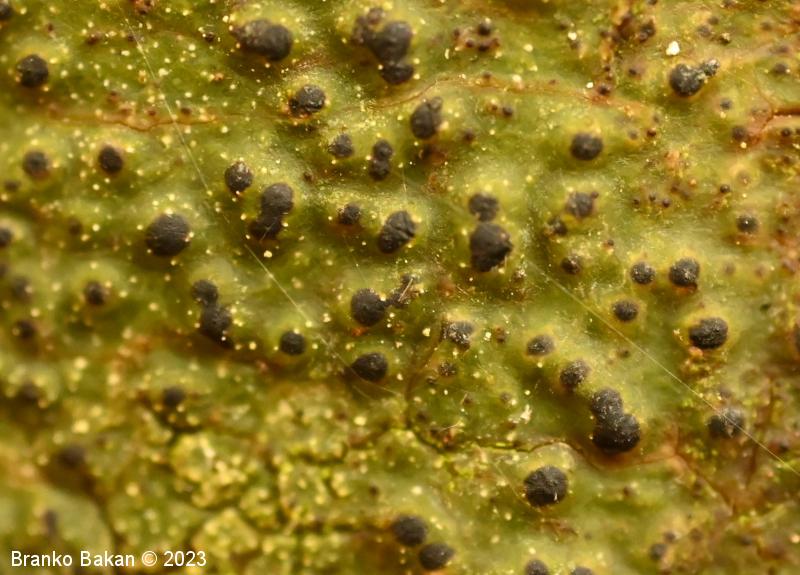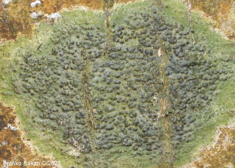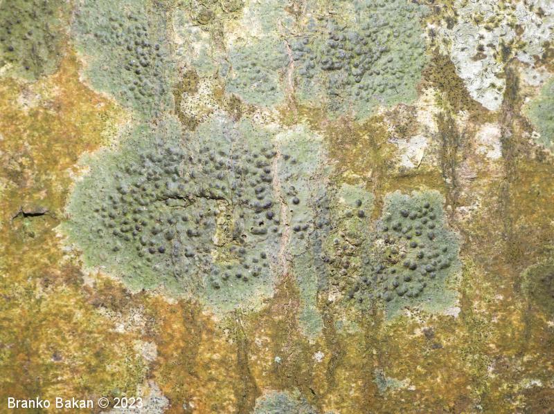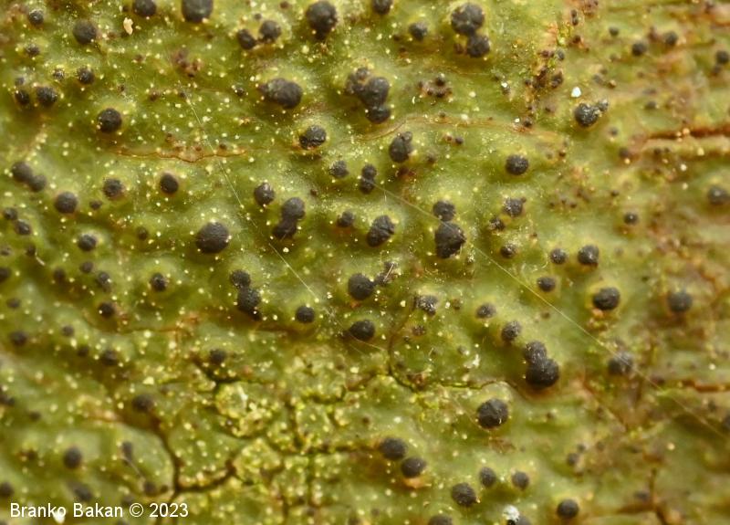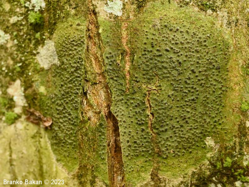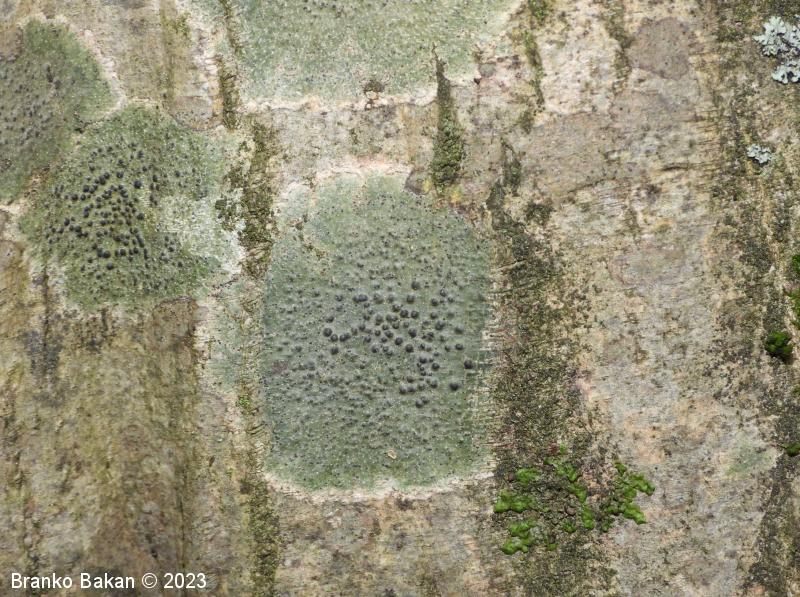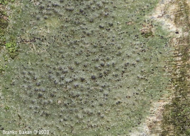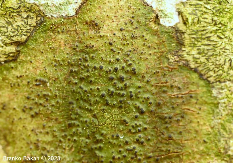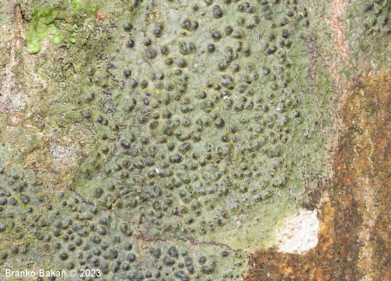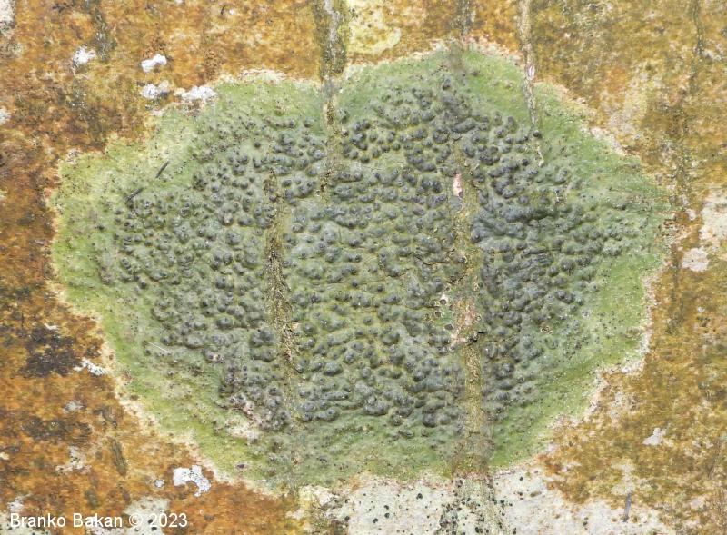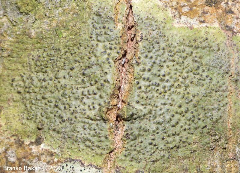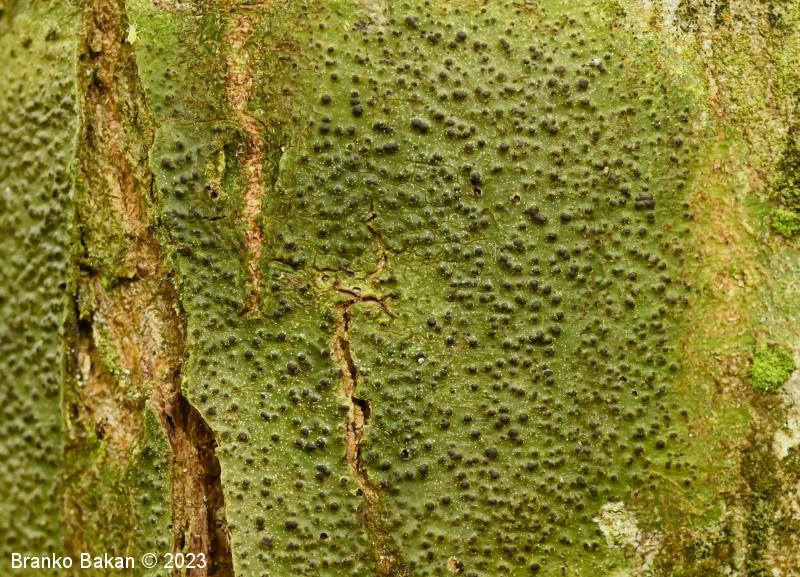 Opis: steljka je skorjasta in je večinoma olivnozelena ali rumeno rjava, dokaj bleščeča in gladka, izgleda kot temen madež na drevesih, večinoma z jasnim (zelenim) robom. Soredijev, izidijev in apotecijev ne razvije, razmnoževalne strukture so grbičasti periteciji. Ti so črni in so videti kot bradavice. Prisotne so tudi pseudoficele (), ki so belkaste in točkaste, zelo drobne.