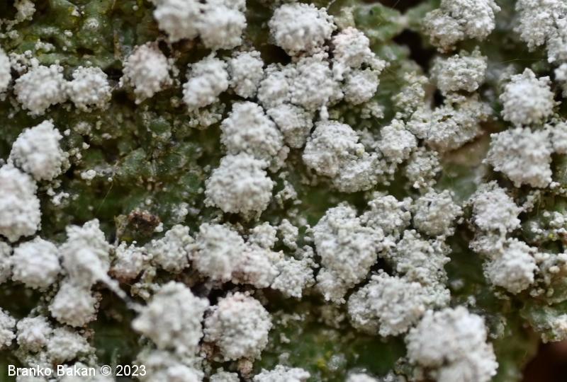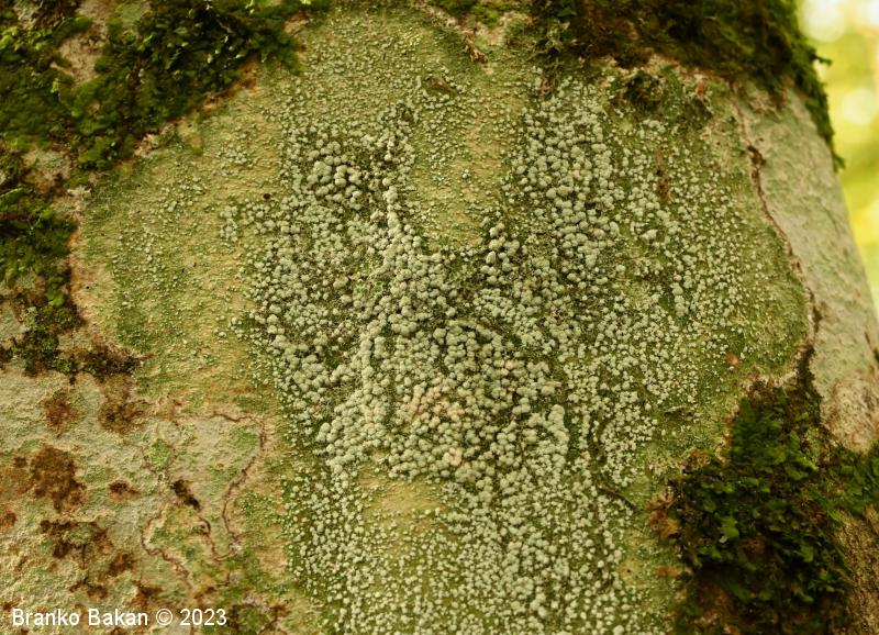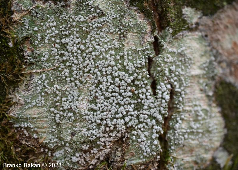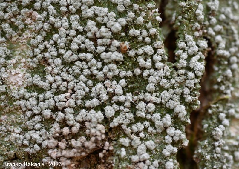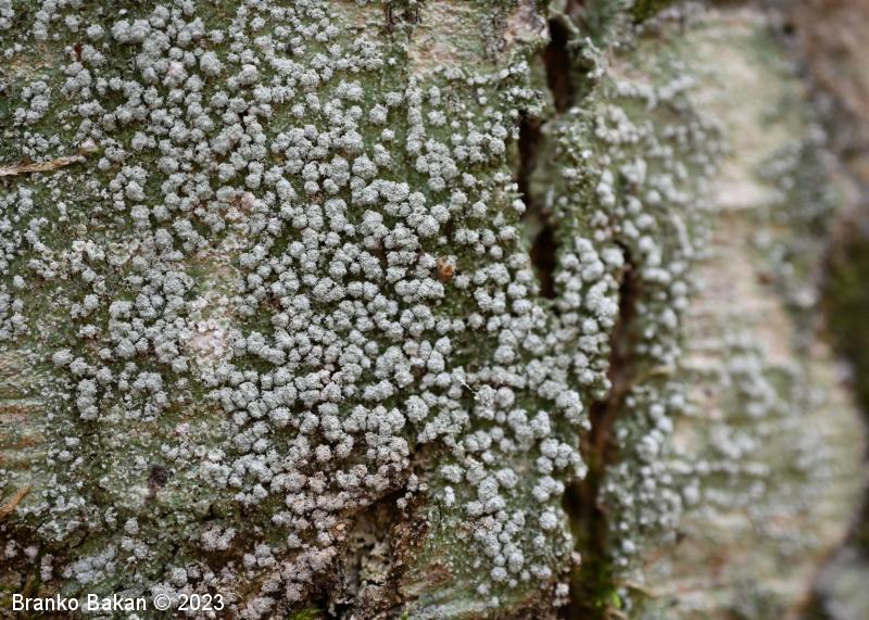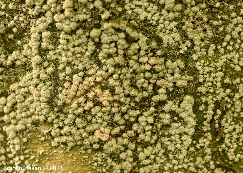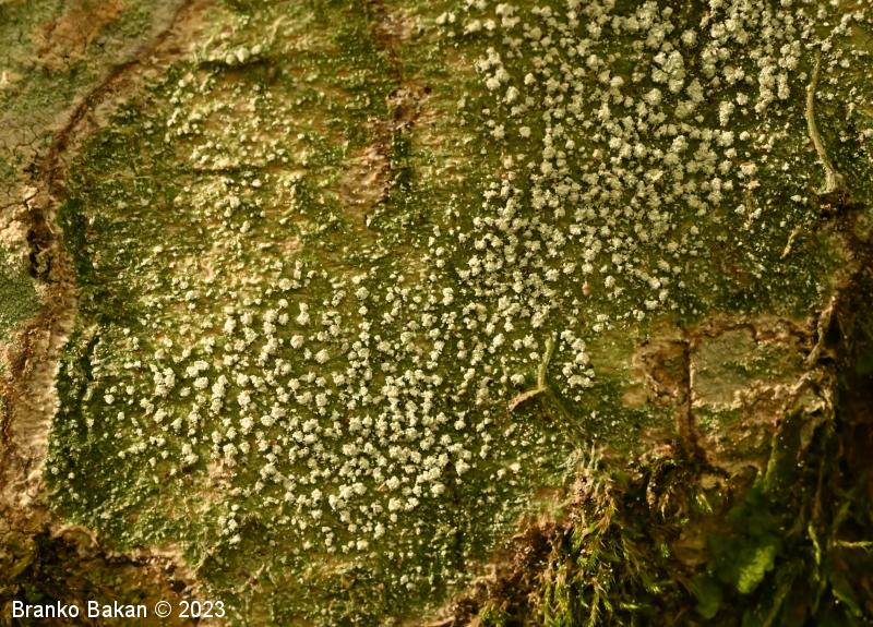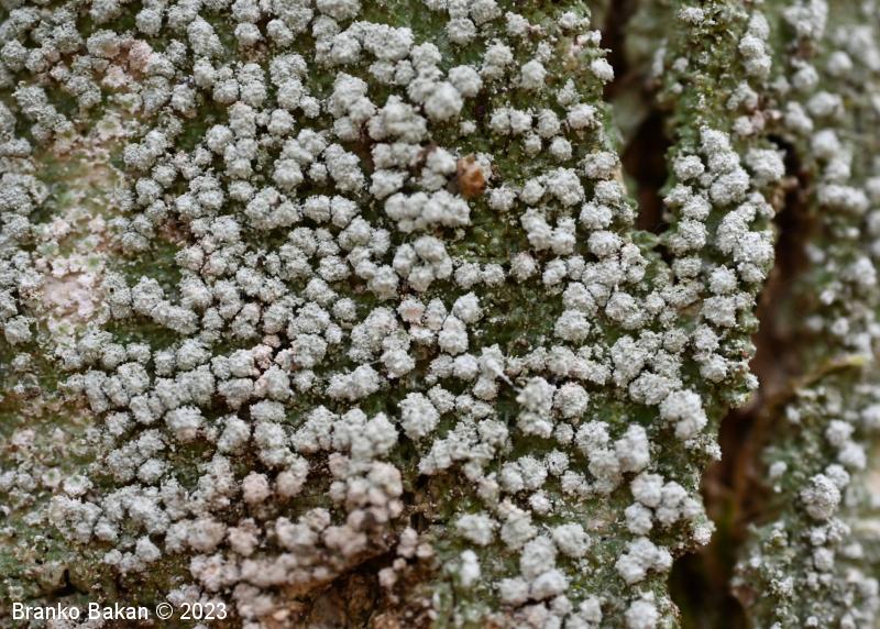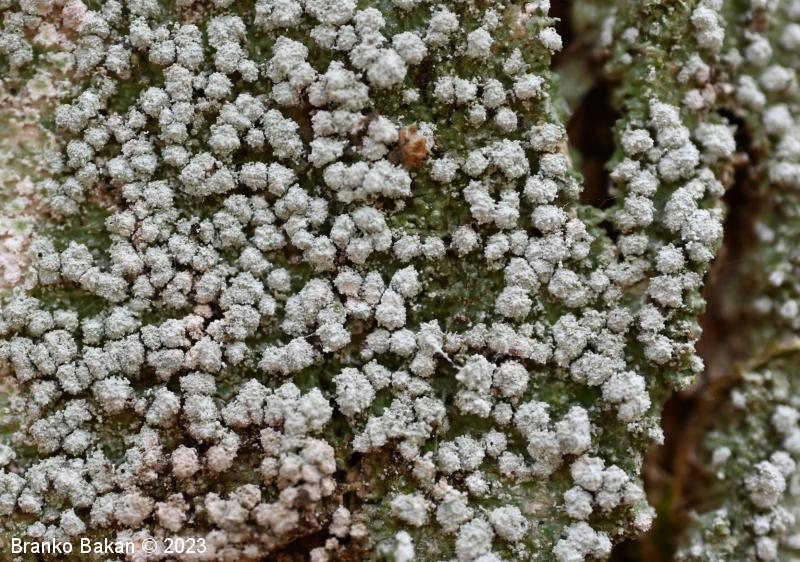 Opis: steljka je skorjasta, bledo siva do temno zelenkasto siva, nekoliko povoščena, tanka do zmerno debela, ob robovih večinoma neizrazito omejena, gladka do grobo bradavičasta, pogosto hrapava. Soraliji so točkasti, številni, izbočeni (ob zrelosti so videti kot kosmičaste kroglice), 0.5 do 1.5 mm veliki, dokaj enakomerno razporejeni po površini steljke. Steljka in soraliji imajo izrazito grenak okus. Apoteciji se le redko ustvarijo. Fotobiont je kokalna zelena alga.