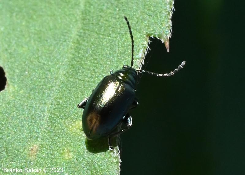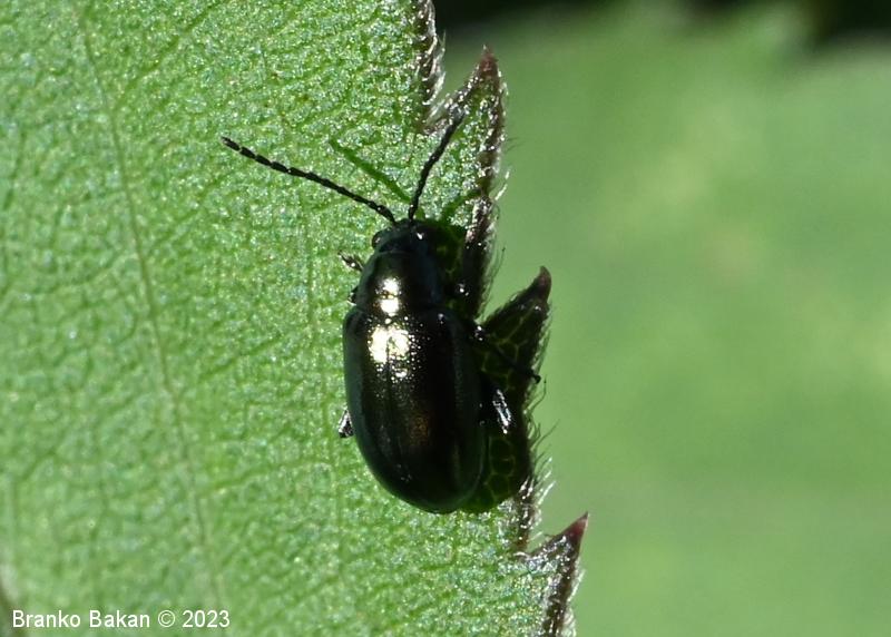 Odrasli osebki: telo je ovalno, kovinsko bleščeče, večinoma temno zeleno, redkeje temno modro. Glava je drobna, tipalnice so temne, sestavljene iz 11 členkov, dosegajo nekje polovico pokrovk. Oprsje je prečno kvadratasto, na zgornji in spodnji strani konveksno, z razločnim, prečnim šivom v spodnjem delu. Pokrovke so podolgasto jajčaste, v spodnjem delu zaokrožene, na ramenskem delu ob straneh plitvo vbočene, enakomerno grobo plitvo jamičaste, gladke. Noge so nekoliko temnejše od pokrovk, posebej še stegenca, zadnja stegenca so odebeljena.
