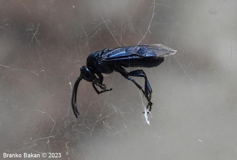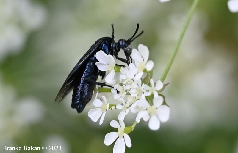 Odrasli osebki: glava, oprsje, zadek in noge (!) so v celoti bleščeče črno modro obarvane, kar jih uvršča v skupino med seboj zelo podobnih "črnih" ščetinorožk. Tipalnice so betičaste, pri samcih so s spodnje strani porasle s serijo ščetinic. Sprednja krila so krepko temno ožiljena, na bazalnem delu nekoliko črnikasta, proti konicam prosojna, zato so izrazito kontrastno dvobravna, z ozko in dolgo črno pterostigmo, 3rm žila (subapikalno okence) je skoraj ravna. Samice imajo na končnem (genitalnem) segmentu kratka in vzporedna izrastka.