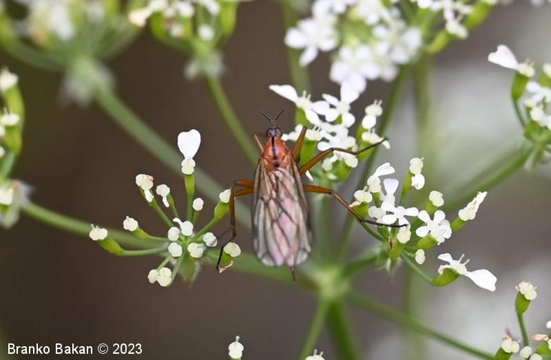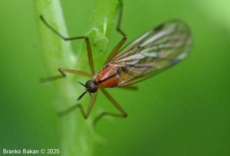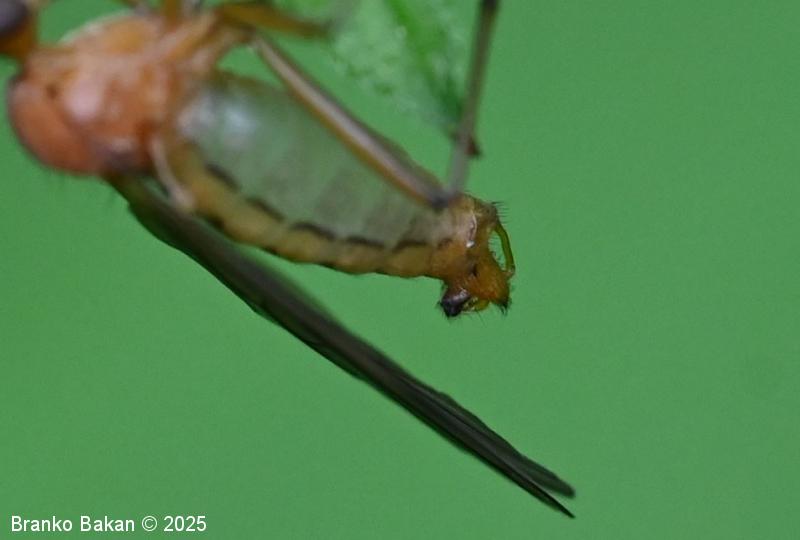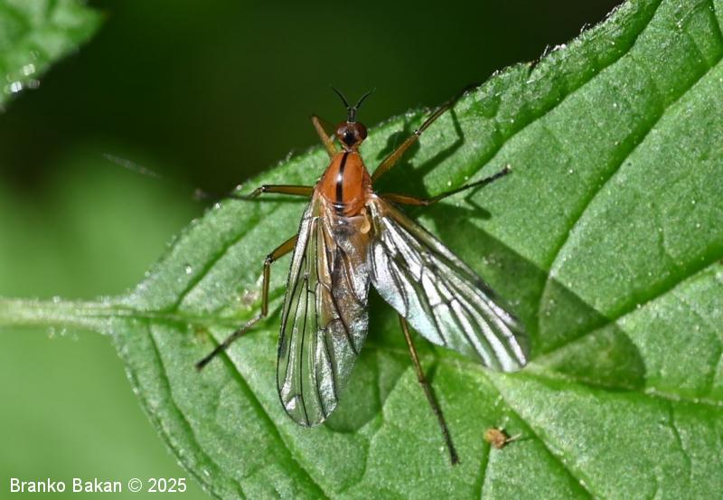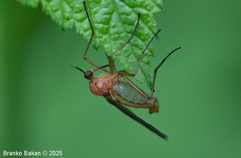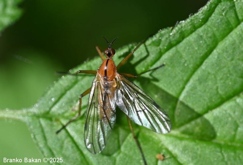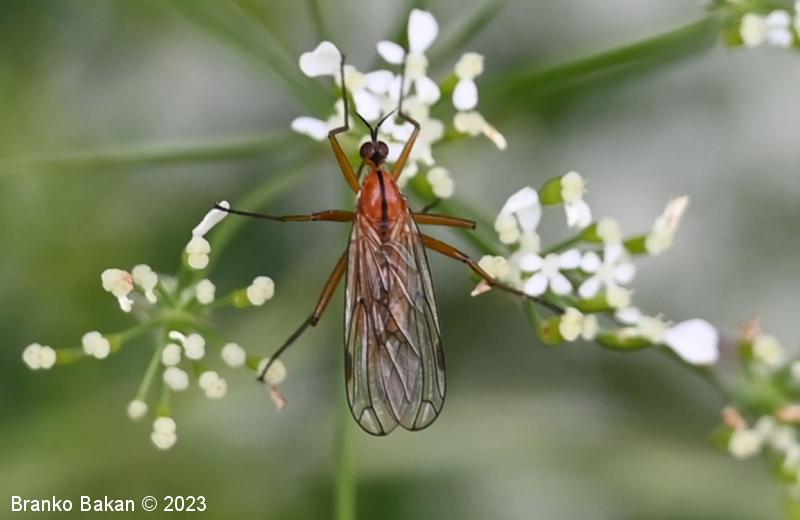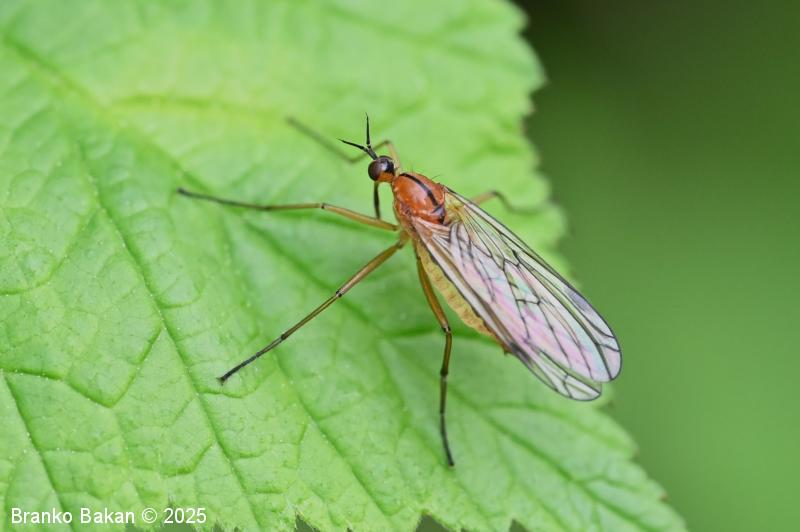 Odrasli osebki: telo je precej vitko, oranžno do rumenaksto, s temno vzdolžno črto na oprsju. Glava je drobna, rumenkasta, zadnji del je temen, oči so velike, rdečkaste, spodnji del glave se nadaljuje v dolg, rahlo upognjen in temen kljunec. Tipalnice so temne, tanke, prvi členek je mnogo daljši od drugega. Oprsje je jajčasto, oranžno, skoraj golo do raztreseno ščetinasto, z eno vzdolžno črno črto. Ščitek (scutellum) je umazano rumen do oranžen, s temno progo. Krila so prosojna, s temnimi do rumenkastimi žilami, pterostigma je praviloma pristona in je temna, lahko pa je tudi neizrazita. Zadek je bledo rumenkast, vzdolžno sivkasto progast, tudi ob straneh poteka sivkasta proga. Noge so dolge in tanke, porasle s ščetinami, rumenkaste, na "kolencih" črnikasta, tudi stopalca so temna.