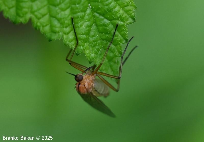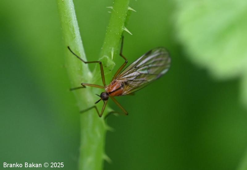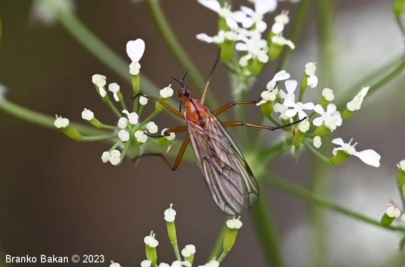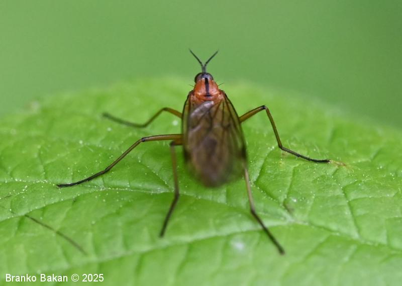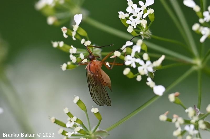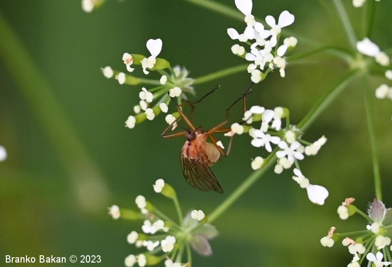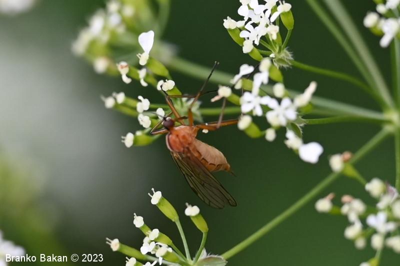 Odrasli osebki: telo je precej vitko, oranžno do rumenaksto, s temno vzdolžno črto na oprsju. Glava je drobna, rumenkasta, zadnji del je temen, oči so velike, rdečkaste, spodnji del glave se nadaljuje v dolg, rahlo upognjen in temen kljunec. Tipalnice so temne, tanke, prvi členek je mnogo daljši od drugega. Oprsje je jajčasto, oranžno, skoraj golo do raztreseno ščetinasto, z eno vzdolžno črno črto. Ščitek (scutellum) je umazano rumen do oranžen, s temno progo. Krila so prosojna, s temnimi do rumenkastimi žilami, pterostigma je praviloma pristona in je temna, lahko pa je tudi neizrazita. Zadek je bledo rumenkast, vzdolžno sivkasto progast, tudi ob straneh poteka sivkasta proga. Noge so dolge in tanke, porasle s ščetinami, rumenkaste, na "kolencih" črnikasta, tudi stopalca so temna.
