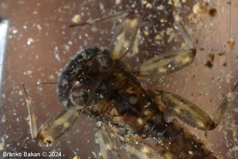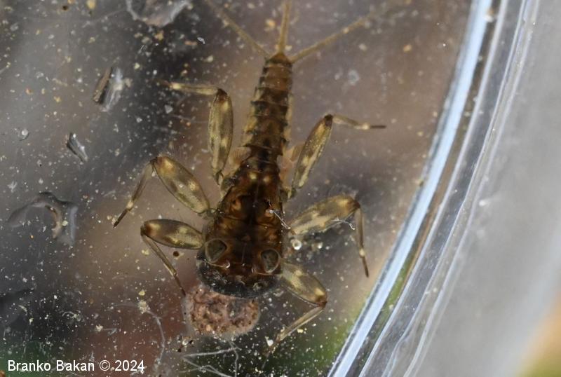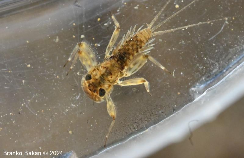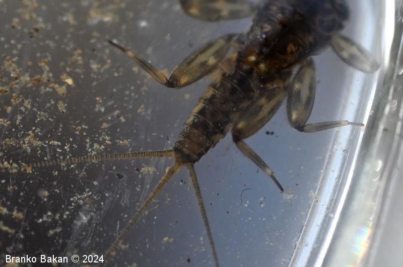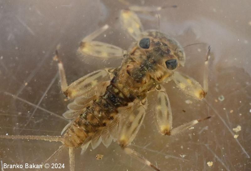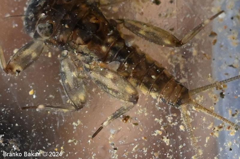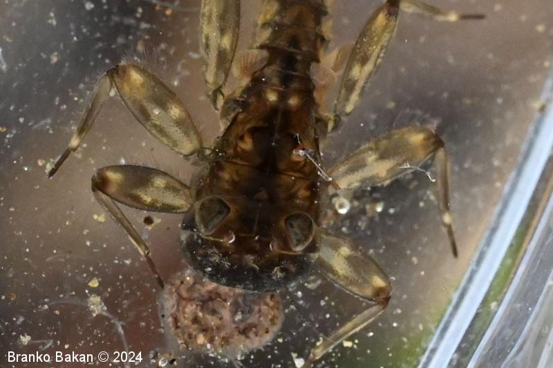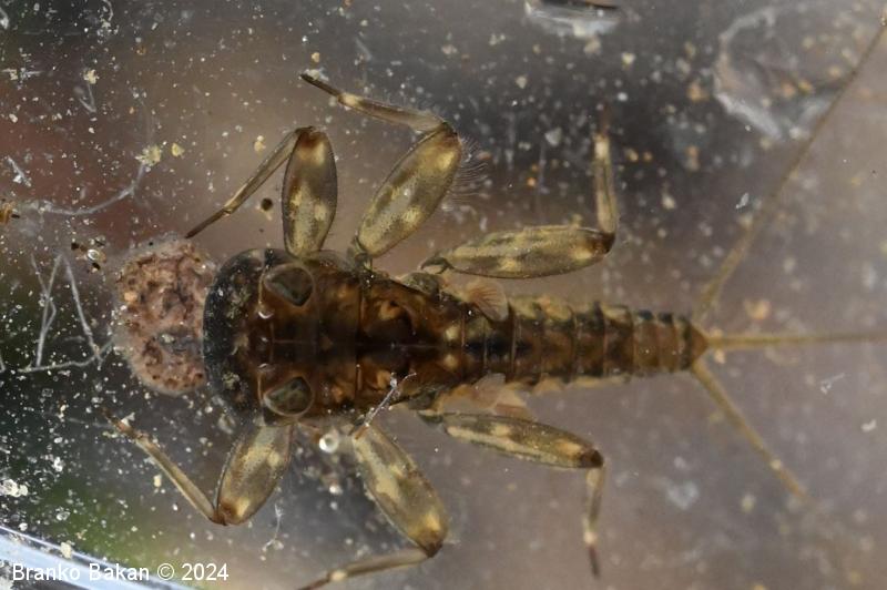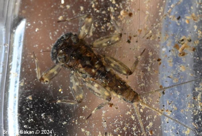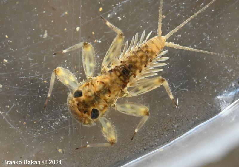 Ličinke: telo je plosko, 9 do 12 mm dolgo, v sprednjem delu razširjeno, precej temno s svetlejšimi lisami. Glava je skoraj okrogla, ščitasta, z velikimi očmi, ki so nameščene na zgornji strani glave, ob njih so očesca (ocelli). Oprsje (toraks) je temno, z nekaj rumenkastimi lisami. Zadek je vitek, ožji od oprsja, temno lisast in marogast, večinoma s trikotnimi lisami, ob straneh z listastimi škrnimi izrastki. Na koncu zadka so 3 rumenkasti nitasti izrastki (cerki). Noge so precej velike, s krepkimi in sploščenimi stegenci, ki so temna z rumeno osrednjo progo in stranskimi marogami.
