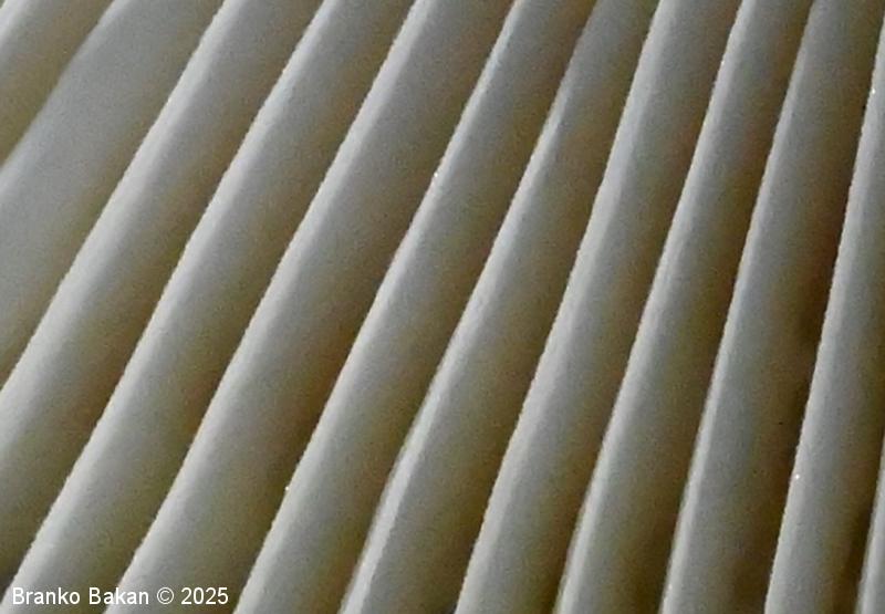 Opis: klobuk mladih trosnjakov je večinoma polkrožen, zaobljen, kasneje se dežnikasto razpre, v sredini večinoma udrt, zelo variabilno obarvan, pogosto dvobarven, okrasto rjav do olivno rjavkast s škrlatnim in rdečkastim odtenkom, tudi vinsko rdeč do modrovijoličen, v sredini je temnejši, rob je gladek ali rahlo rebrast, suh, kožica se zlahka lupi. Trosovnico tvorijo beli ali rahlo kremasti, tanki lističi, ki so prirasli ob zgornji del beta, včasih se vilasto razcepijo, rob lističev je nazobčan in posejan s številnimi cistidami (). Bet je navadno krepak, rahlo betičast, bel z rahlo rožnatim ali rdečkastim pridihom, nekoliko poprhnjen.
