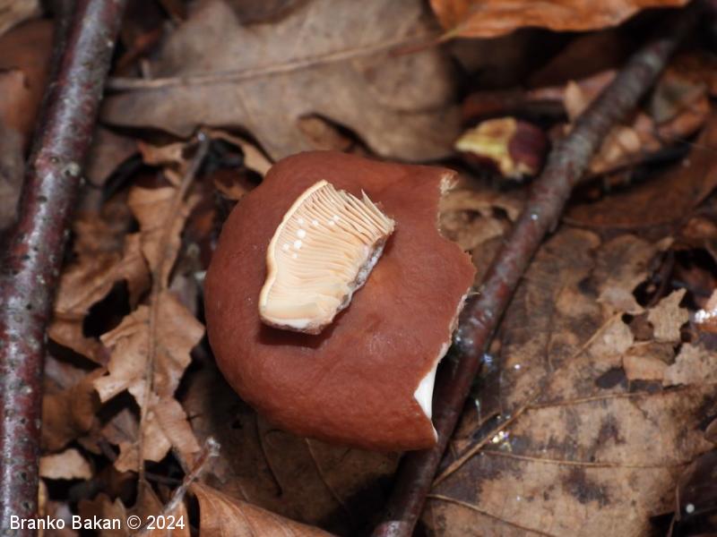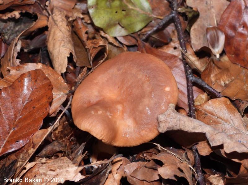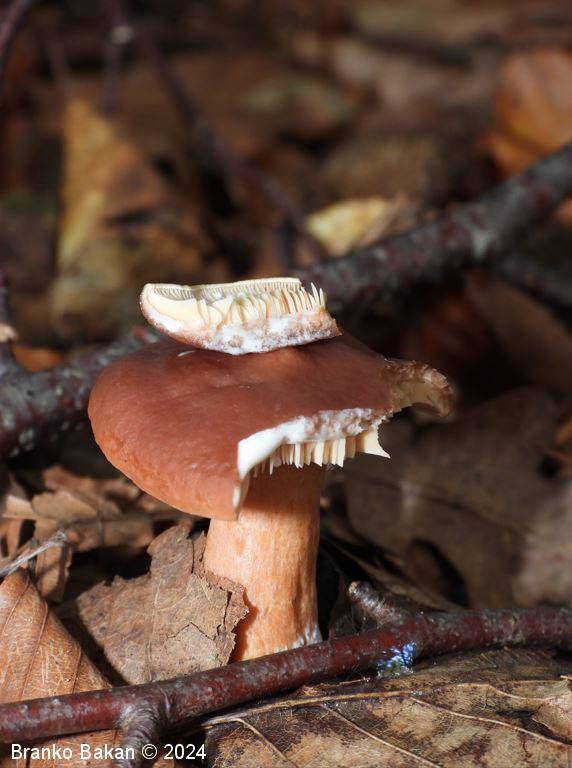 Opis: klobuk je dežnikasto razprt, pri mladih trosnjakih z uvihanim robom, s staranjem postane bolj lijast ali pladnjast, v sredini pogosto z manjšo grbico, rdečerjav, gladek, brez lis in kolobarjev. Spodnja stran klobuka (trosovnica) je gosto porasla z belimi ali rahlo kremastimi lističi, ki vsebujejo bel sok, zelo rahlo se iztezajo po vrhu beta, med velikimi lističi so še manjši lističi. Bet je valjast, zapolnjen, trd, medlo rdečerjav oz. svetlejši od klobuka, prav tako vsebuje bel sok.