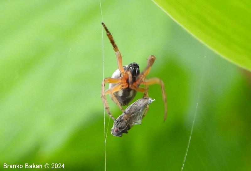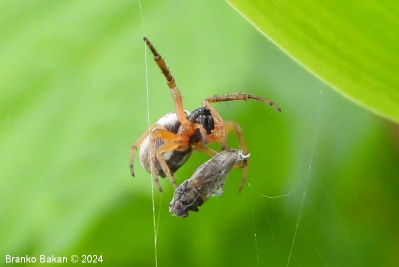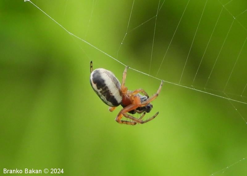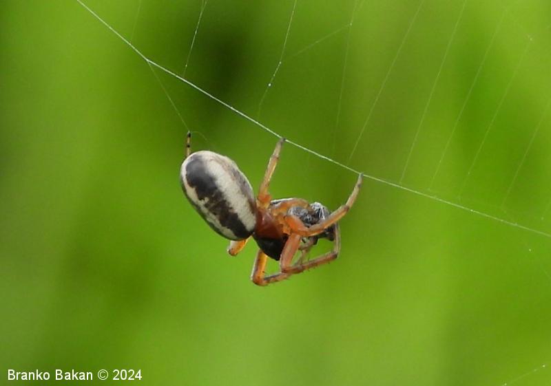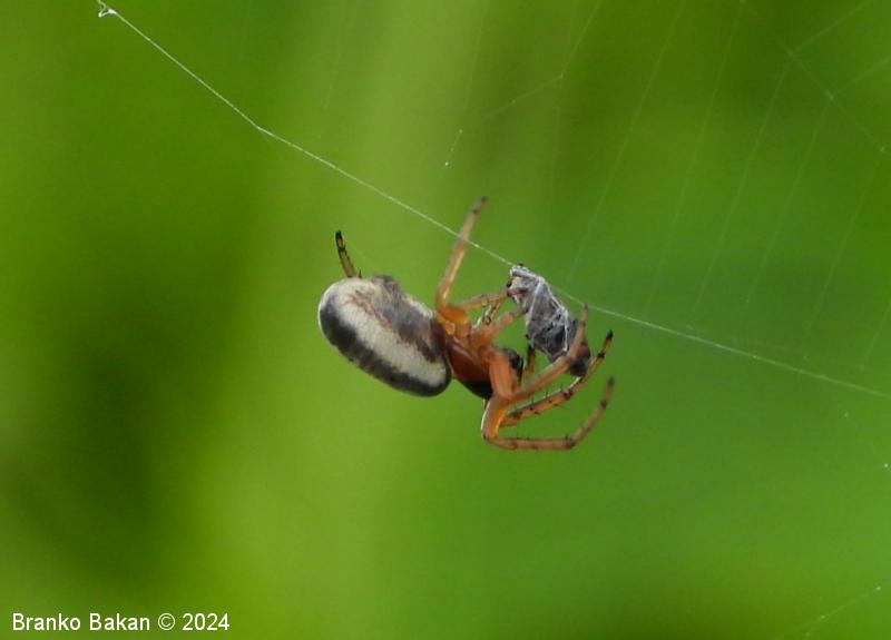 Samica: prepoznavna po temnem zadku, ki je vzdolžno belo progast. Glavoprsje (prosoma) je ščitasto, v sprednjem delu rahlo iztegnjeno in dvignjeno, temno- do črnorjavo, ob robovih nekoliko svetlejše. Zadek (opistosoma) je jajčasto podolgovat in zaobljen, črnorjav do črnordečkast, z osrednjo belo progo, ki ima v osrednjem delu pogosto stranske črtice, prav tako vzdolž robov poteka širok bel pas. Noge so rumenkaste ali rdečerjave, goleni in stegenca prednjih parov so pogosto temno lisasta.