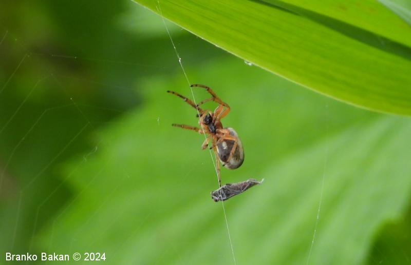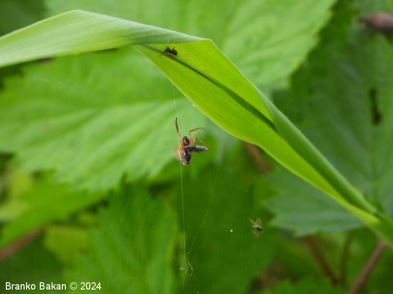 Obnašanje in razvoj: samice si pogosto spletejo navpične, nežne mreže med nizko podrastjo, večinoma med obrežnim rastlinjem nekje v višini 60 cm nad tlemi, včasih tudi v nizkem vejevju vrb. Pogosto si splete še tunelasto zavetišče iz zvitih listov trav, kamor se zateče v nevarnosti ali v slabem vremenu. Sicer je na preži za manjšimi letečimi žuželkami na sredini mreže. Odrasli so aktivni od maja do julija, mladi pajki se izležejo nekje v poznem juliju.