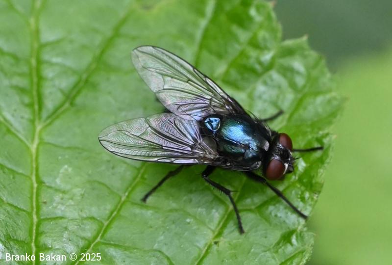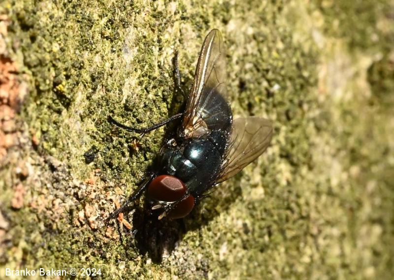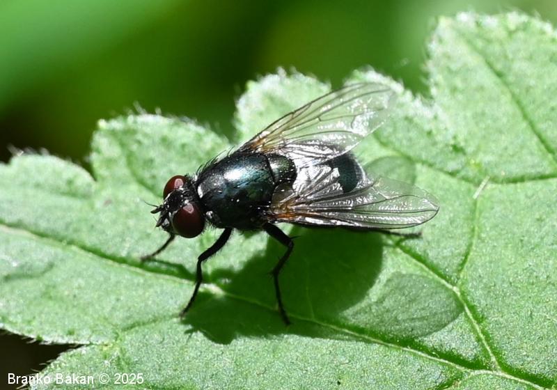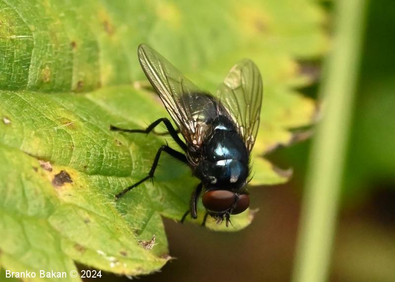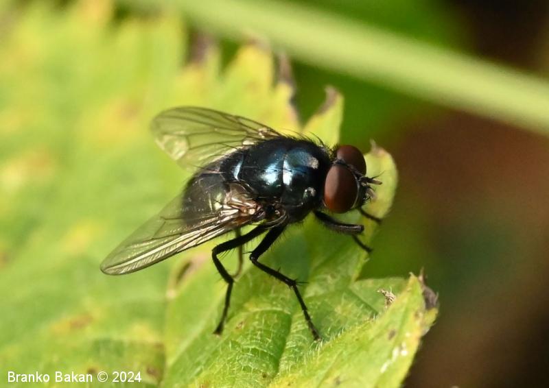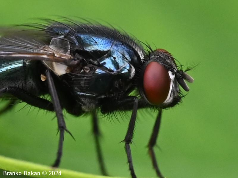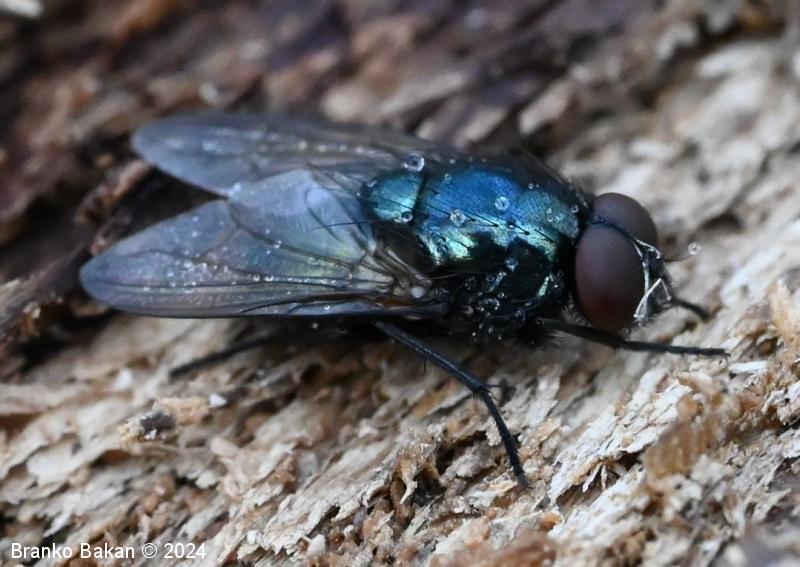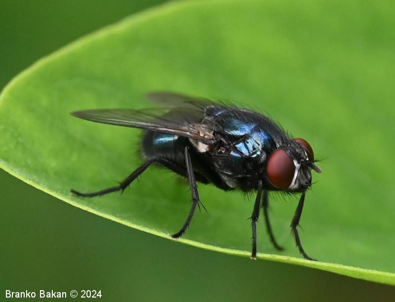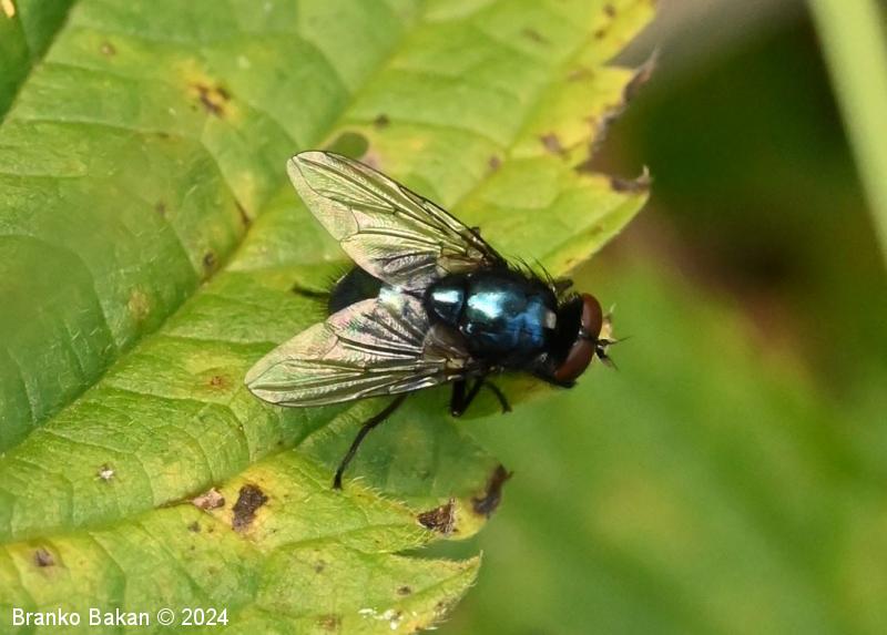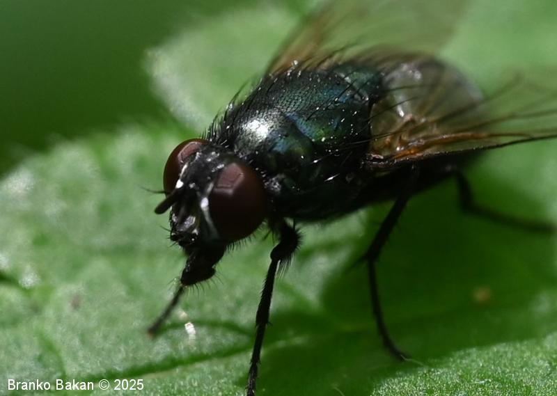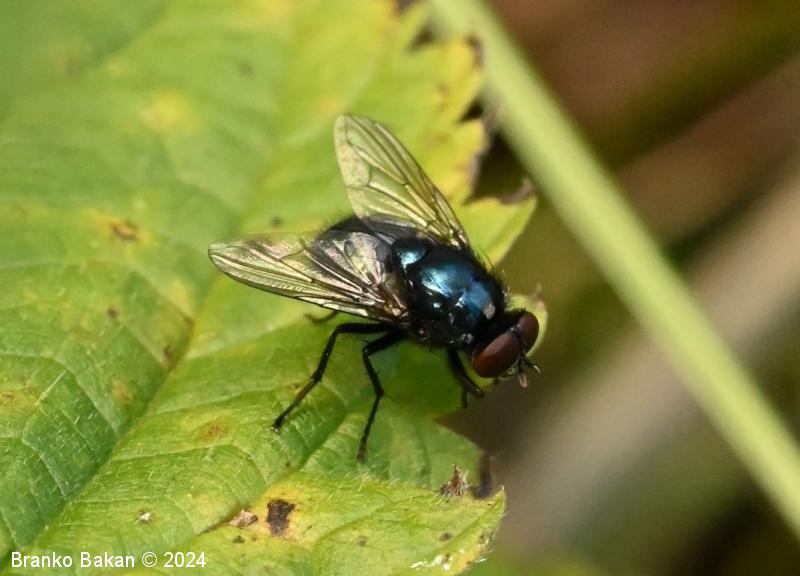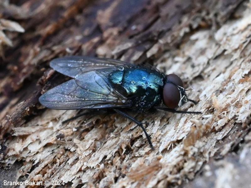 Odrasli osebki: telo je vitko in nekoliko podolgasto, bleščeče črnomodro z zelenim odtenkom. Glava je dokaj velika, temna, ob očeh in v frontalnem delu bela, porasla z dolgimi, temnimi ščetinami. Zadnji členek tipalnic je betičast, sivkast, ariste (ščetine na betičastem delu tipalnic) so peresaste. Oči so velike, rdečerjave, pri samicah so razmaknjene, pri samcih se na temenskem delu stikajo. Oprsje je krepko, bleščeče črnomodro, na sprednjem robu s kvadratasto, srebrnkasto svetlo liso, ki se včasih razteza do ščitka (pogosto sta prisotni tudi dve obstranski poprhnjeni lisi), poraslo z eno serijo dolgih akrostihalnih ščetin, sicer kratko puhastodlakavo. Ščitek (scutellum) je široko zaokrožen, z enim parom apikalnih ščetin. Krila so široko trikotna, v mirovanju ozko vzdolžno zložena čez telo, prosojna, z močno ukrivljeno M1 žilo, ki se ob robu približa žili R4+5. Zadek je trikotno jajčast, bolj kovinsko zelen od oprsja, na koncu pogosto svetlo poprhnjen. Noge so črne, ščetinaste.