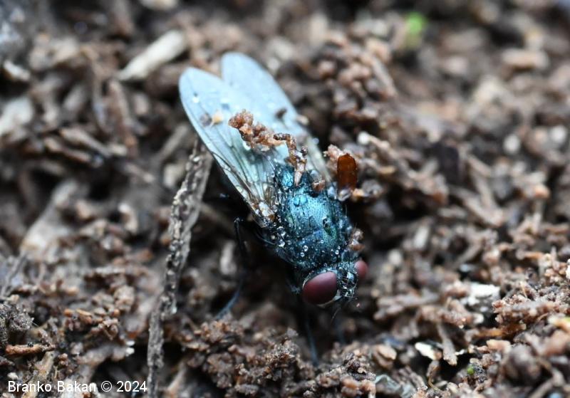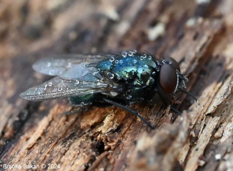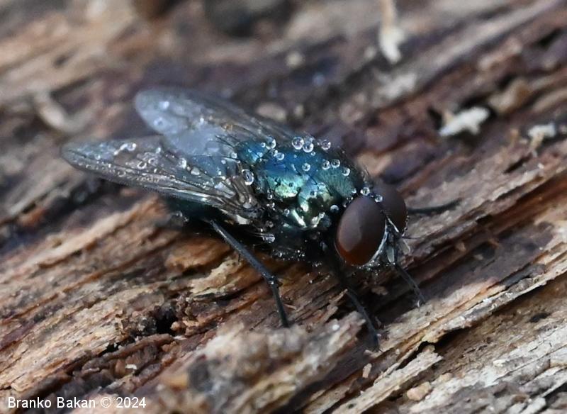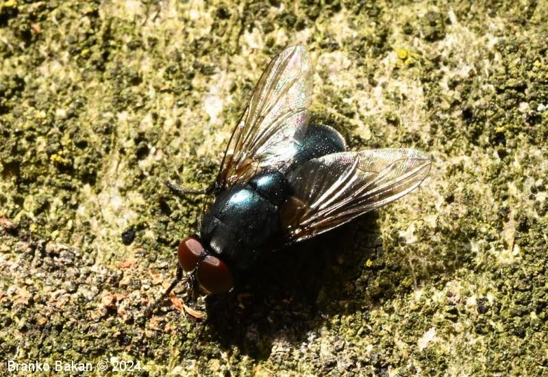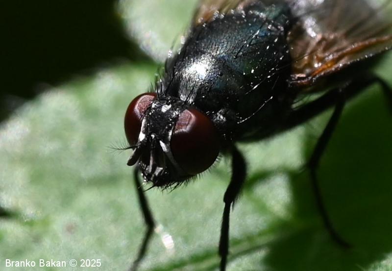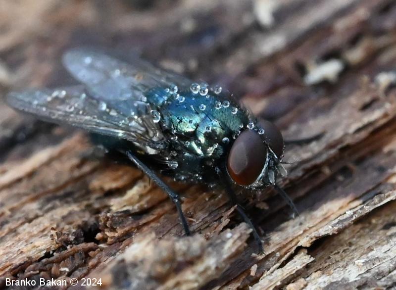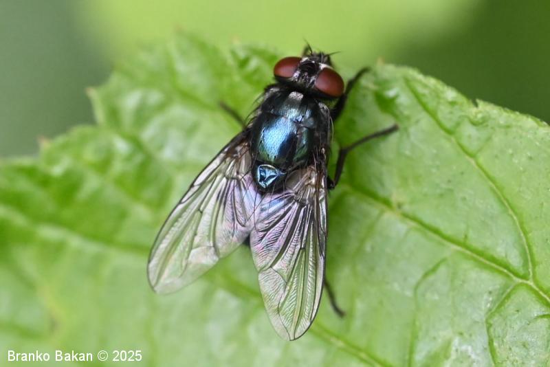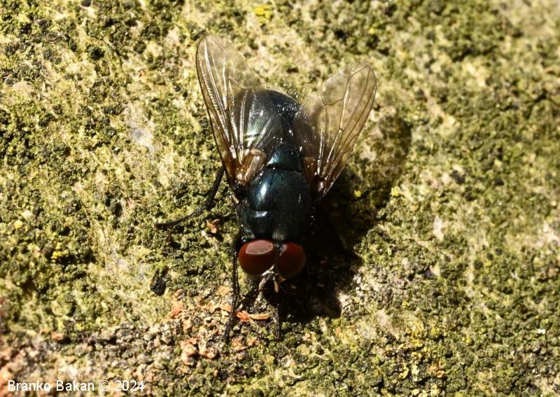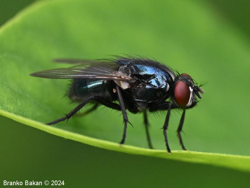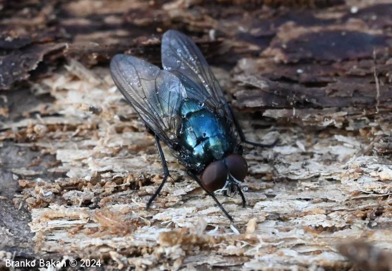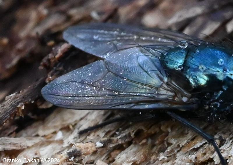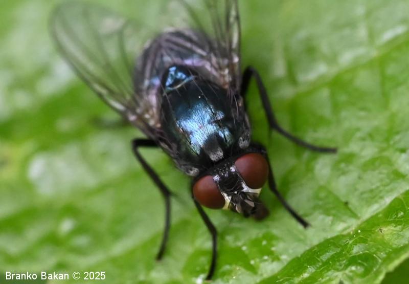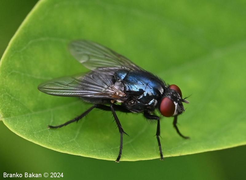 Odrasli osebki: telo je vitko in nekoliko podolgasto, bleščeče črnomodro z zelenim odtenkom. Glava je dokaj velika, temna, ob očeh in v frontalnem delu bela, porasla z dolgimi, temnimi ščetinami. Zadnji členek tipalnic je betičast, sivkast, ariste (ščetine na betičastem delu tipalnic) so peresaste. Oči so velike, rdečerjave, pri samicah so razmaknjene, pri samcih se na temenskem delu stikajo. Oprsje je krepko, bleščeče črnomodro, na sprednjem robu s kvadratasto, srebrnkasto svetlo liso, ki se včasih razteza do ščitka (pogosto sta prisotni tudi dve obstranski poprhnjeni lisi), poraslo z eno serijo dolgih akrostihalnih ščetin, sicer kratko puhastodlakavo. Ščitek (scutellum) je široko zaokrožen, z enim parom apikalnih ščetin. Krila so široko trikotna, v mirovanju ozko vzdolžno zložena čez telo, prosojna, z močno ukrivljeno M1 žilo, ki se ob robu približa žili R4+5. Zadek je trikotno jajčast, bolj kovinsko zelen od oprsja, na koncu pogosto svetlo poprhnjen. Noge so črne, ščetinaste.