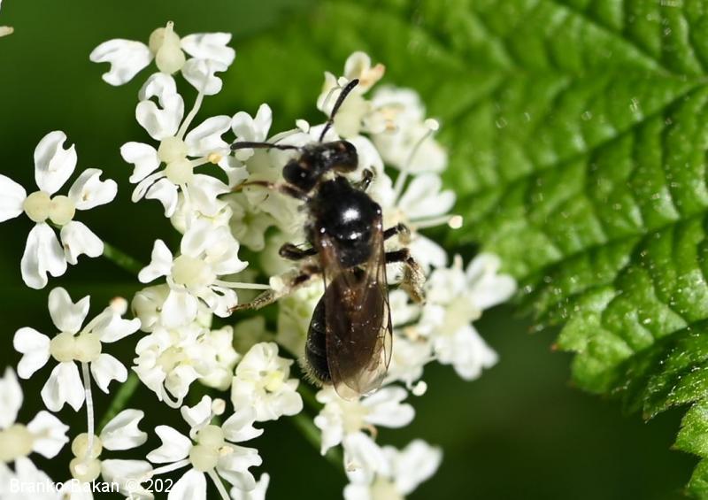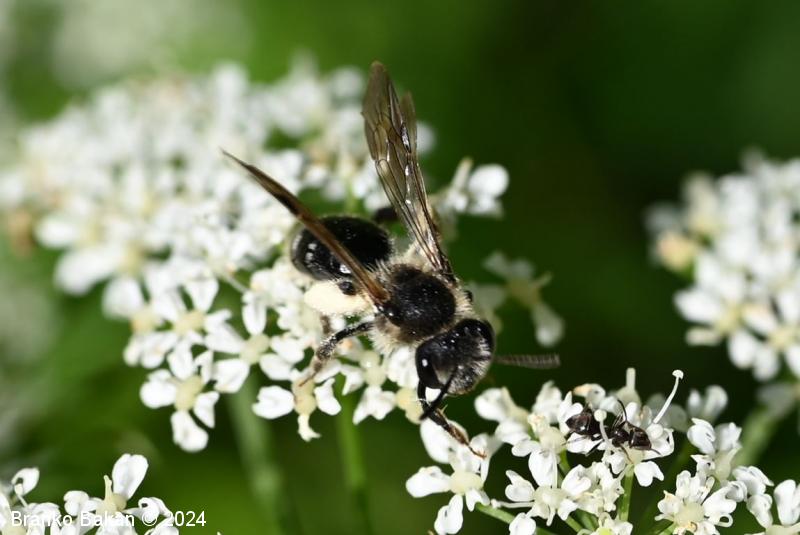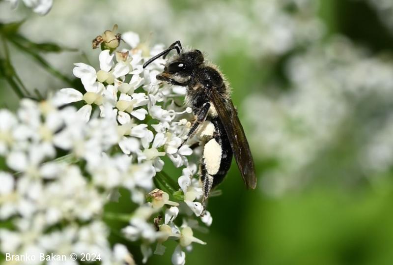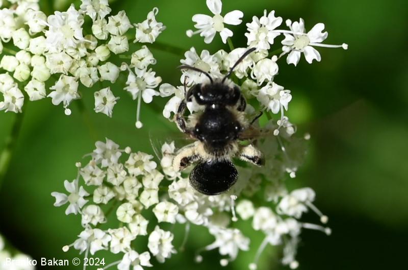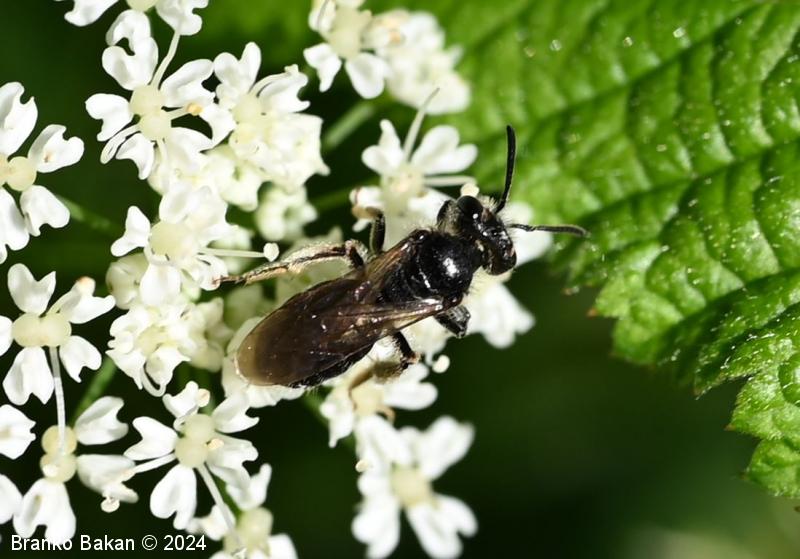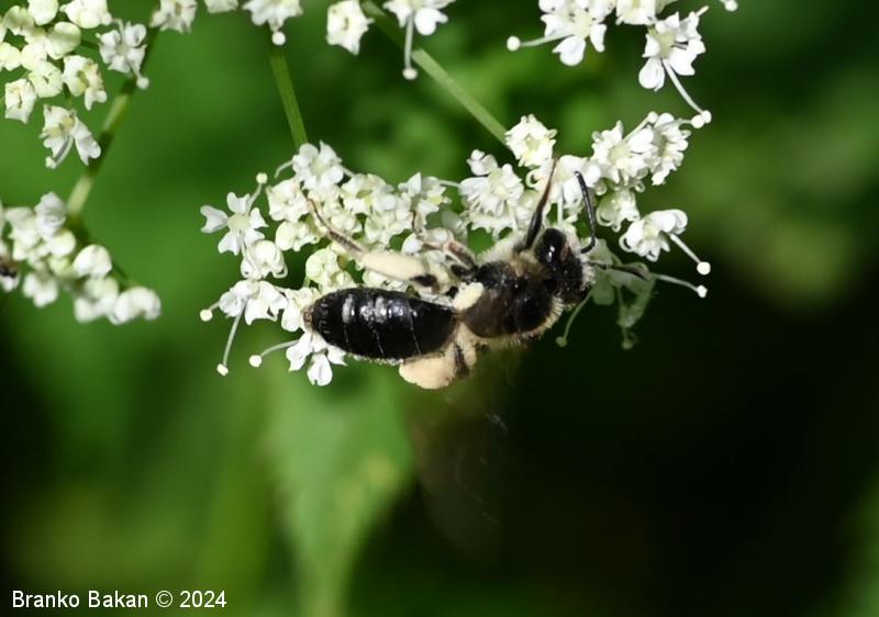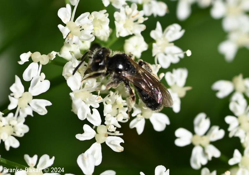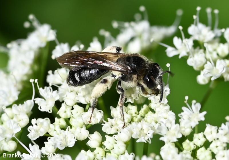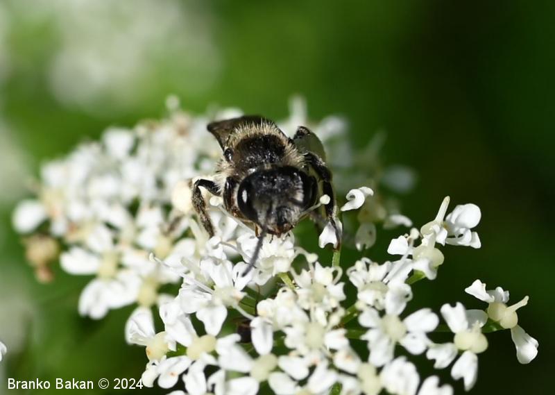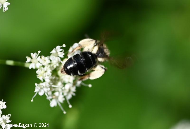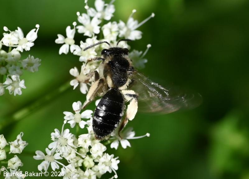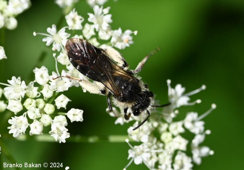 Samica: črno obarvana, porasla s svetlimi dlakami in golim, bleščečim sprednjim delom zadka, ki ima večinoma po tri izrazite svetle pasove. Glava je široka, črna, ob tipalnicah in v sprednjem delu porasla z daljšimi, svetlimi dlakami. Oči so velike, temne, ob njihovem robu poteka tipalčna brazda (značilnost za ta rod). Tipalnice so temne, v spodnji tretnji zožene, sicer bolj ali manj enkomerno debele. Oprsje je v osrednjem delu golo, vsaj v zadnjem delu grobo hrapavo jamičasto, ob straneh gosto poraslo s svetlimi dlakami. Krila so prosojna, ozko podolgasta, z ozko, rumenorjavo pterostigmo. Zadek je ozko jajčast, črn, v sprednjem delu bleščeč in skoraj gol, 3. in 4. segment sta prekinjeno ozko belo pasasto dlakava, 5. je neprekinjeno belo pasasto dlakav, zadnji del zadka je gosteje porasel s svetlimi dlakami. Noge so krepke, skoraj v celoti črne, le stopalca so lahko nekoliko bolj rjavkasta, zadnje goleni so porasle s svetlimi dlakami, ki tvorijo košek.