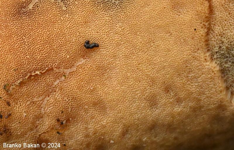 Opis: klobuk je široko pladnjast, plosk ali v sredini rahlo udrt, nekoliko usnjat, sprva bledo sivkastorjav, kasneje kostanjevo rjav, temnejši v sredini in z bolj rumenkastim robom, ki je pogosto valovit, krpat ali globoko nacepljen. Trosovnica (spodnja stran) je fino drobno luknjičasta, gladka, sprva bela, s staranjem postane bolj bledo rumenkasta, nekoliko se izteza po betu. Bet je kratek, na bazi pogosto črnikast.