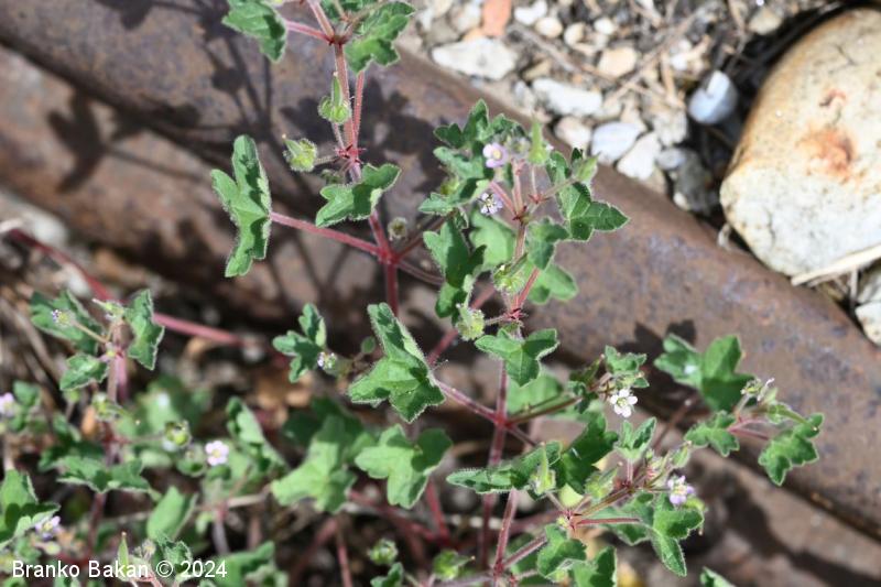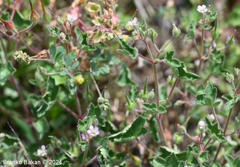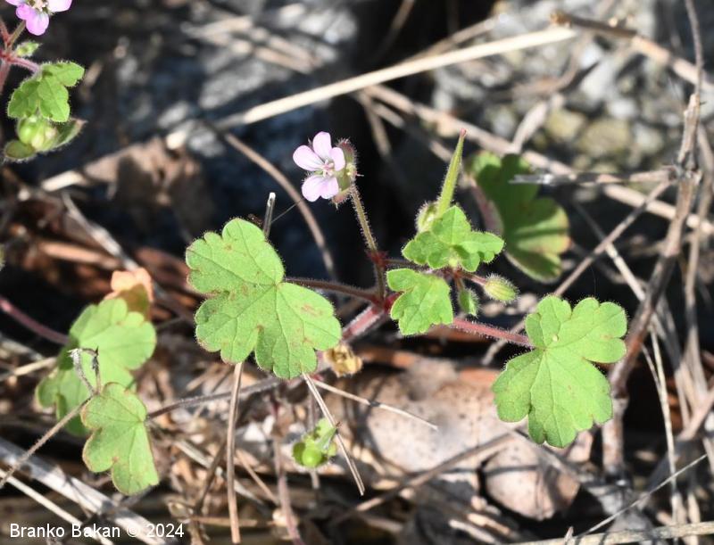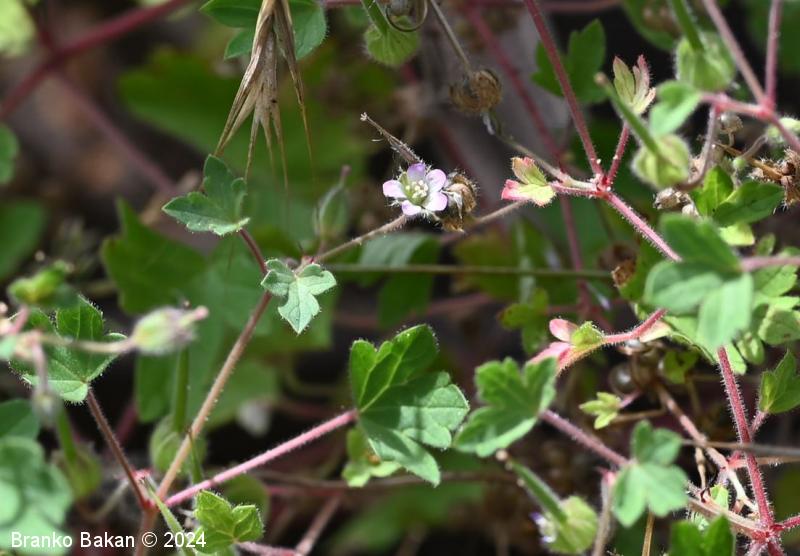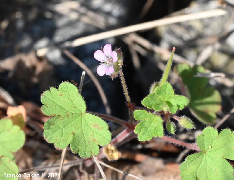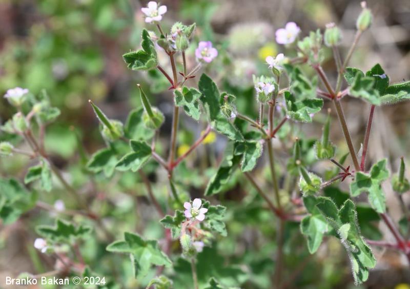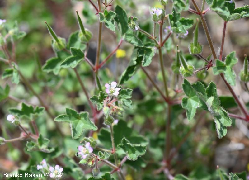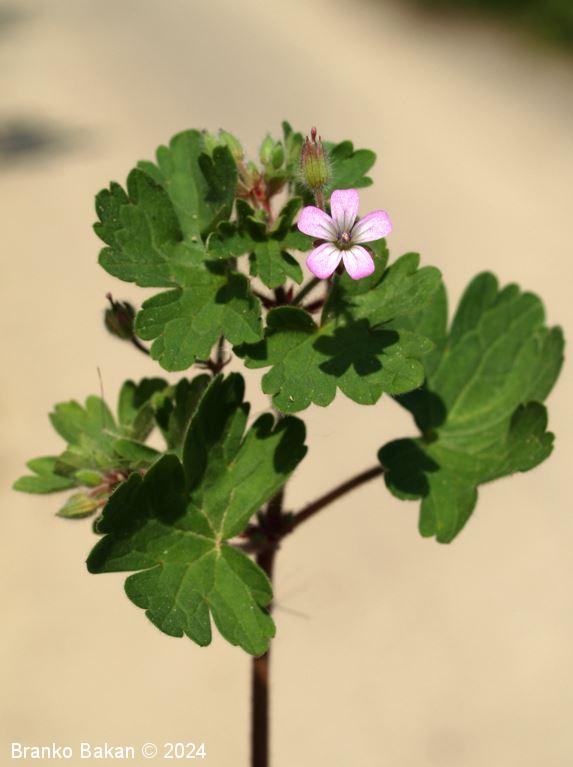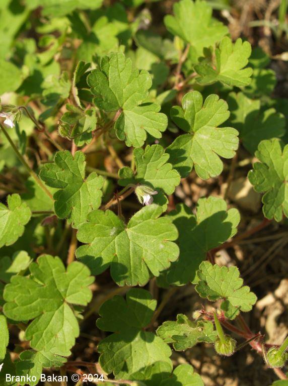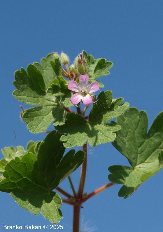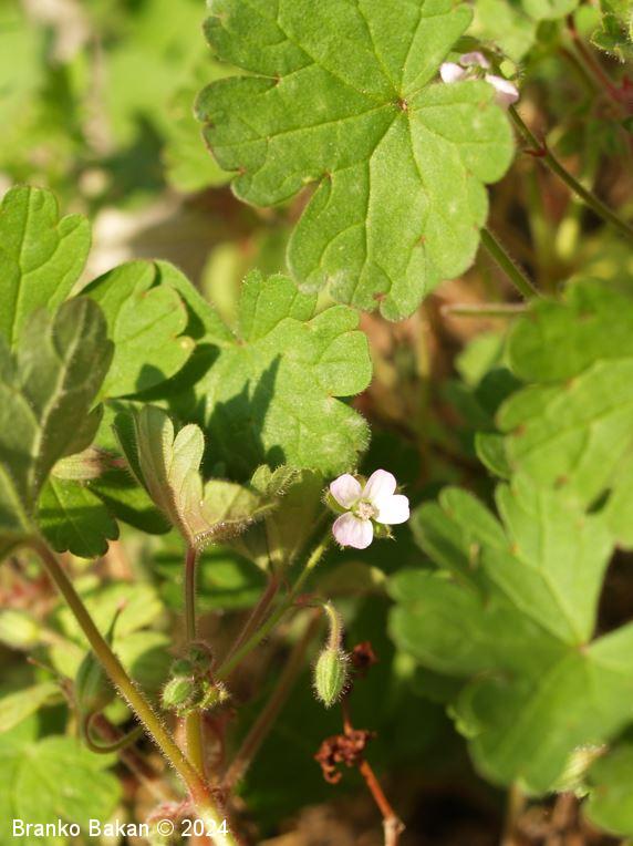 Opis: močno razrasla eno- ali dvoletnica s pritlično listno rozeto. Steblo je poraslo s štrlečimi žlezastimi in enostavnimi, medhkimi dlakami, pogosto rdečkasto nadahnjeno, enakomerno razraslo, lomljivo. Listi so dolgopecljati, v obrisu skoraj okrogli, dlanasto nacepljeni v topo zaokrožene kratke krpe, deljeni nekje od 1/3 do 2/3 širine listne ploskve, kratkodlakavi, zgornji stebelni listi so pogosto globoko deljeni in dlanasto trojnati do peternati. Cvetovi so 5 do 7 mm veliki, 5-števni, rožnati ali svetloškrlatni, v goltu nekoliko svetlejši. Venčni listi so na vrhu zaokroženi do zelo plitvo izrobljeni, pri dnu so goli. Plod se ob zrelosti razpre od spodaj navzgor in razpade na 5 plodičev, ki so na vrhu podaljšani v dolg kljunec.