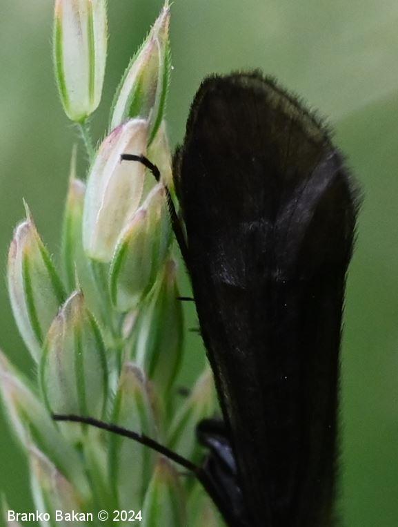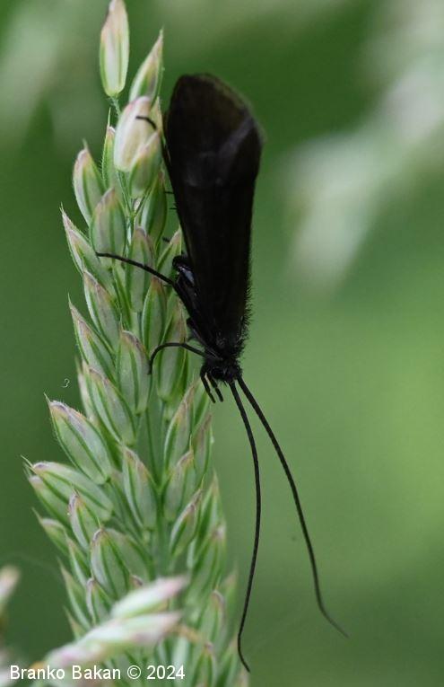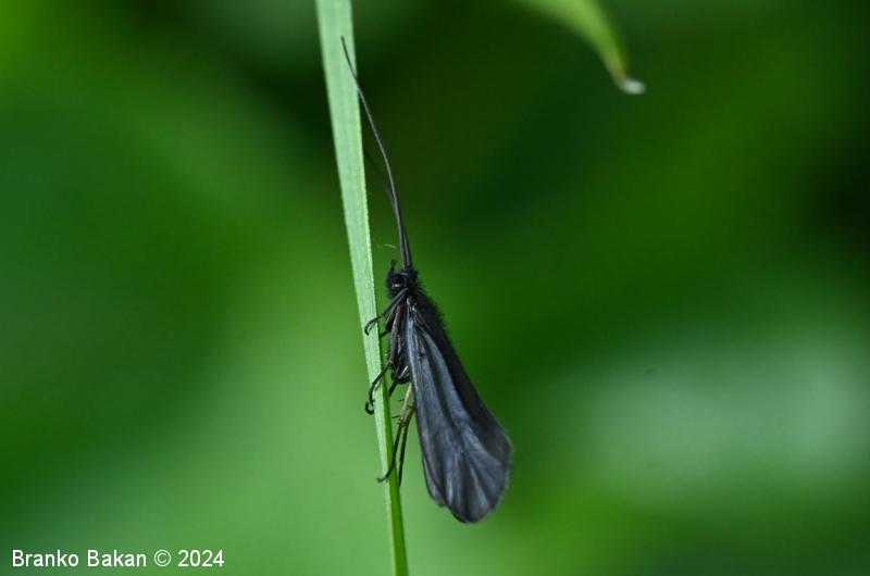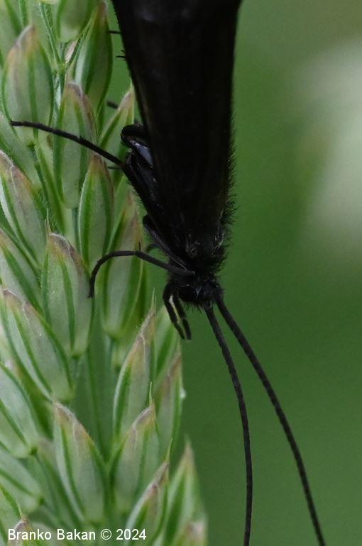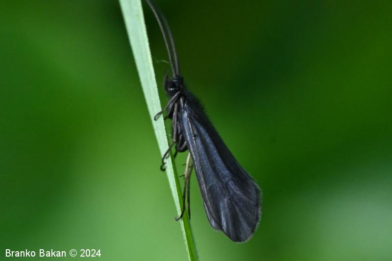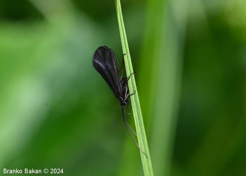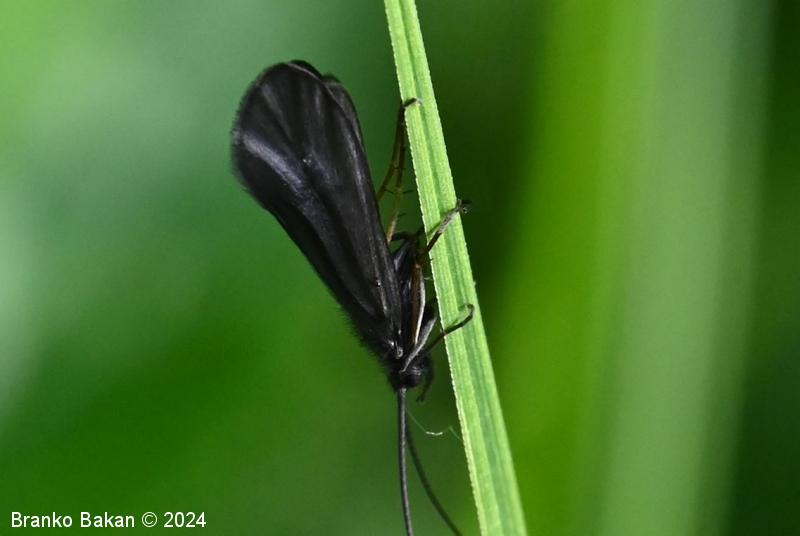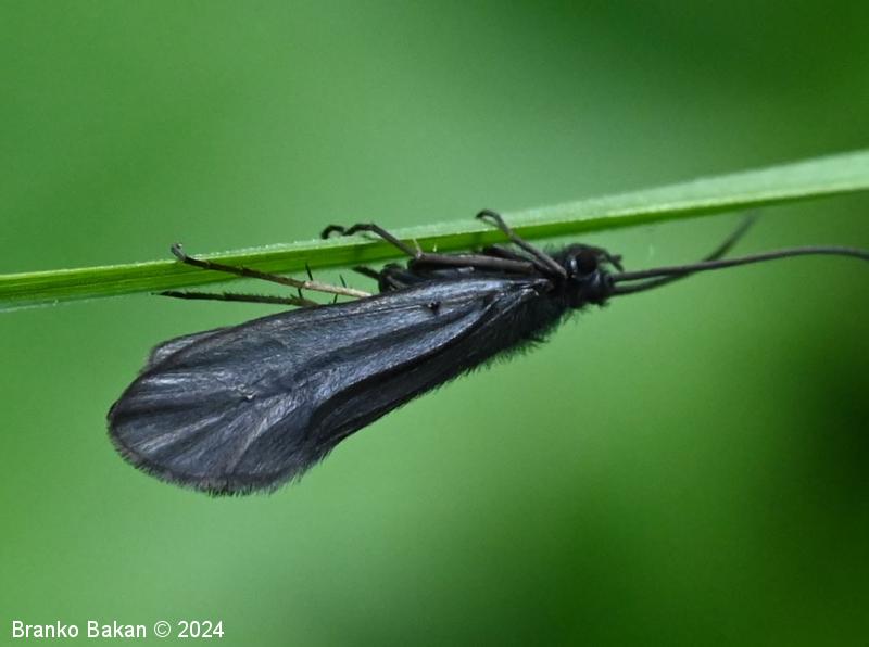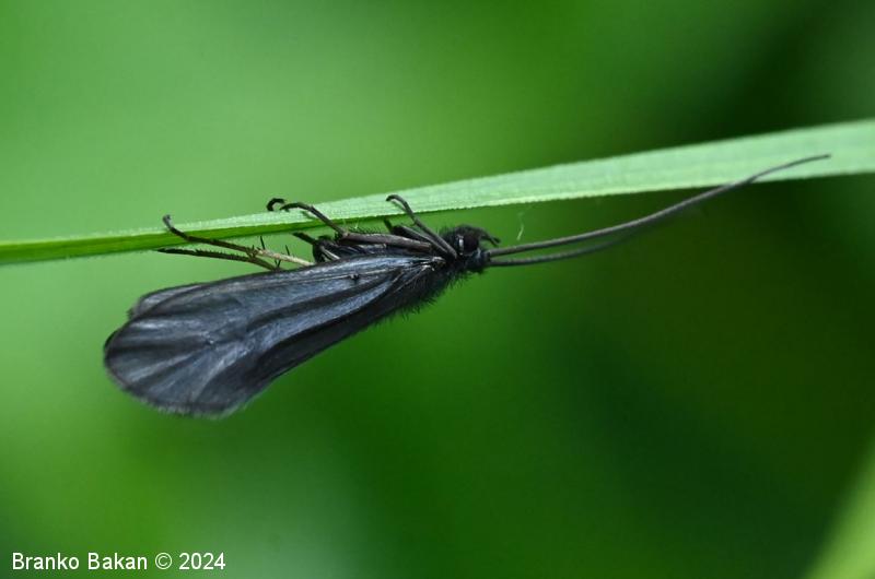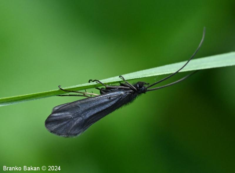 Odrasli osebki: telo in krila so črna. Sprednja krila so na koncu poševno odrezana in rahlo privzdignjena, porasla s kratkimi dlačicami, s krepkejšo žilo ob zgornjem robu, resasta ob zunanjem robu. Zadnja krila so nekoliko manj temna in z izrazitejšimi žilami. Glava je črna, gosto črnodlakava, tudi oči so črne. Tipalnice so nitaste, približno tako dolge kot krila. Noge so črne, zadnje noge so svetlejše.