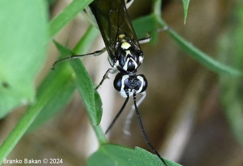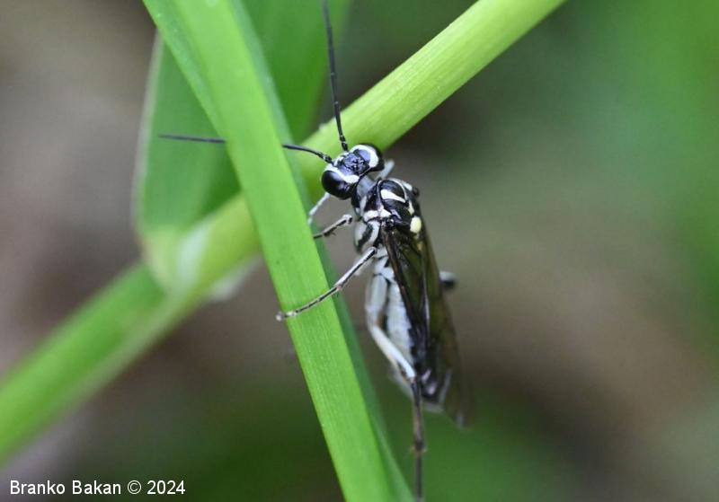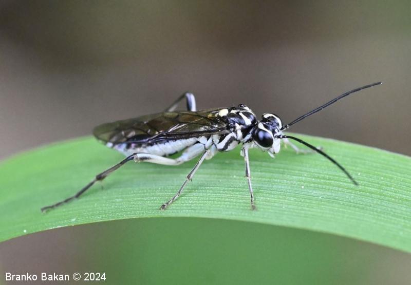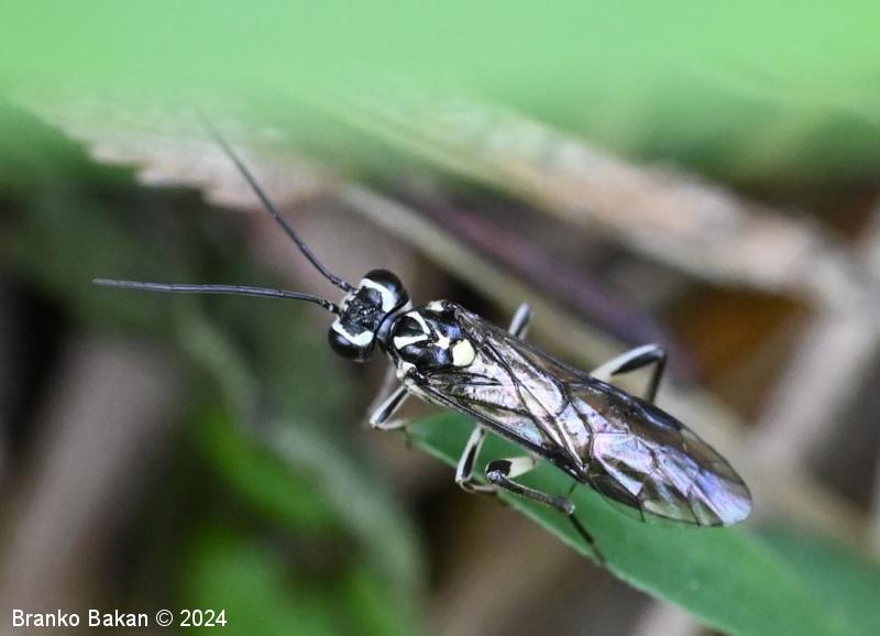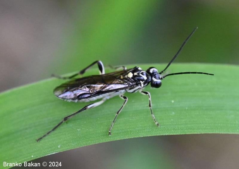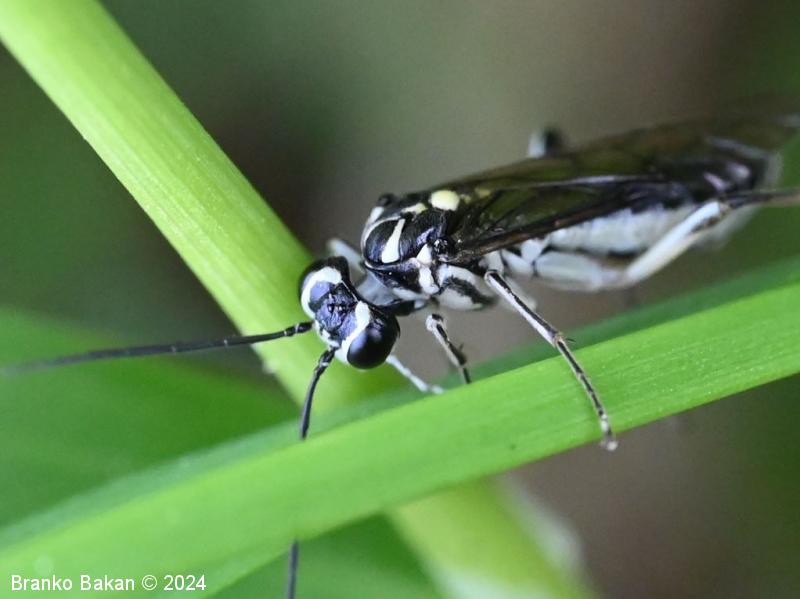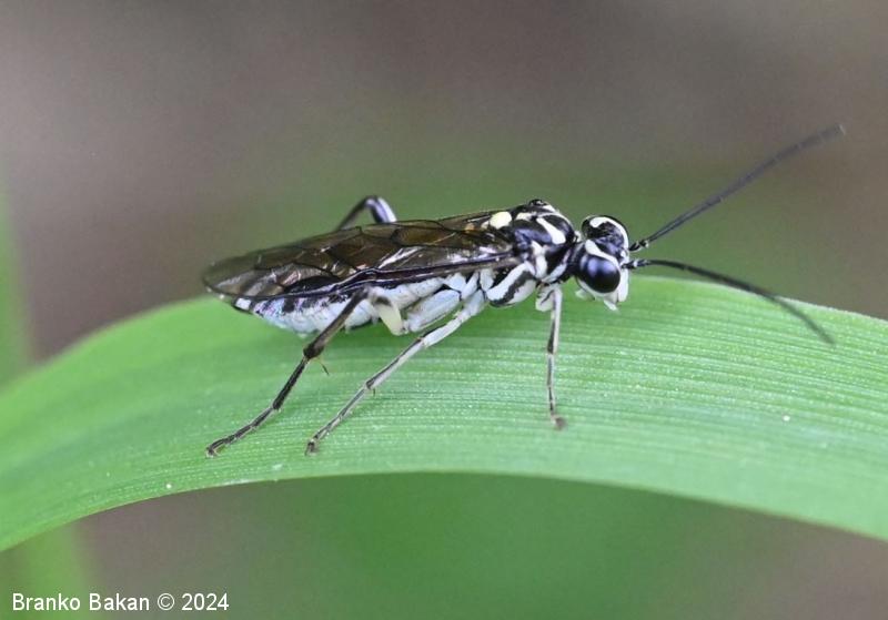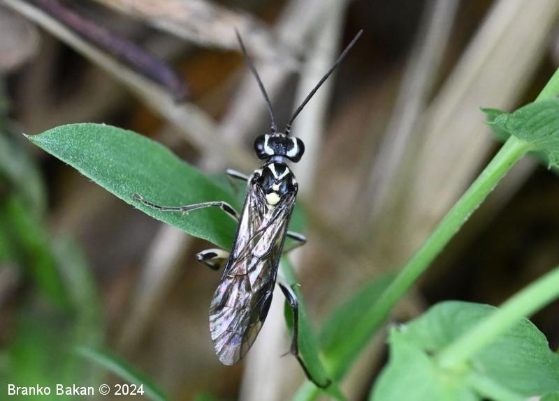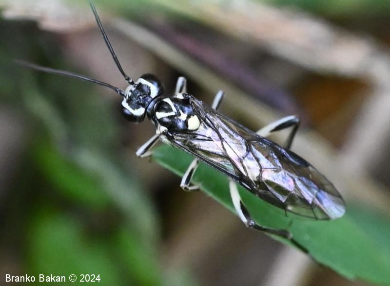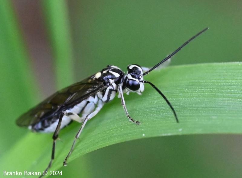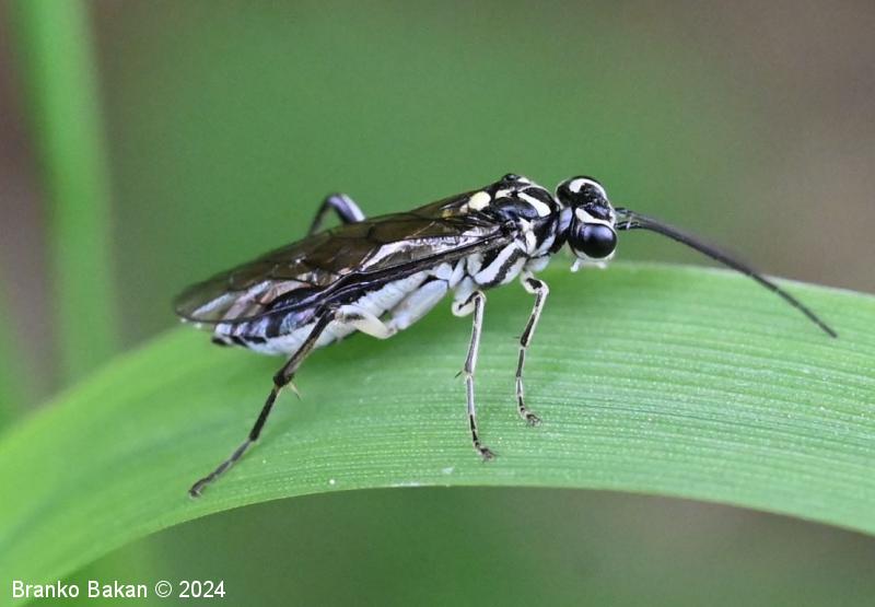 Odrasli osebki: v osnovi so črni s kremasto belimi lisami in pikami, spodnja stran telesa je bela. Glava je bleščeče črna, na temenskem delu rahlo hrapava, frontalni del in čeljusti so bele, oči so pri samicah široko belo obrobljene. Tipalnice so črne, nitaste, členki so dokaj dolgi, bazalna členka sta razločno krajša od 3. Oprsje je krepko, gladko, pri samicah z značilno belo "V" liso v sprednjem delu in belo piko na osrednjem delu (samci imajo manj izrazit bel vzorec na oprsju). Ščitek (scutellum) je v celoti bel. Krila so prosojna, razločno ožiljena, kostalni del je krepkejši, pterostigma je ozko eliptična, krepka in črna. Zadek je jajčasto podolgast, po zgornji strani črn, po spodnji strani bel, včasih so tergiti ozko belo obrobljeni. Noge so dolge, bazalni členki in deli stegenc so beli, sprednje goleni in stopalca so bele s črnimi progami, zadnje goleni in stopalca so večji del črna.