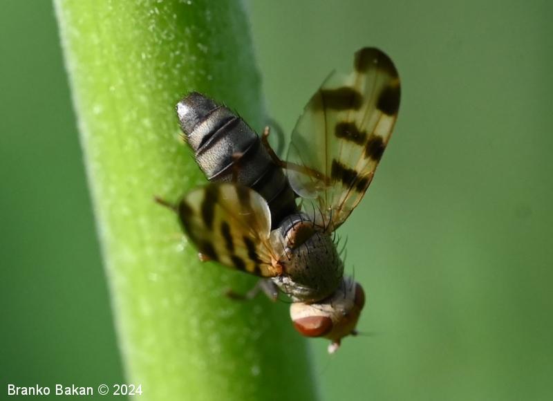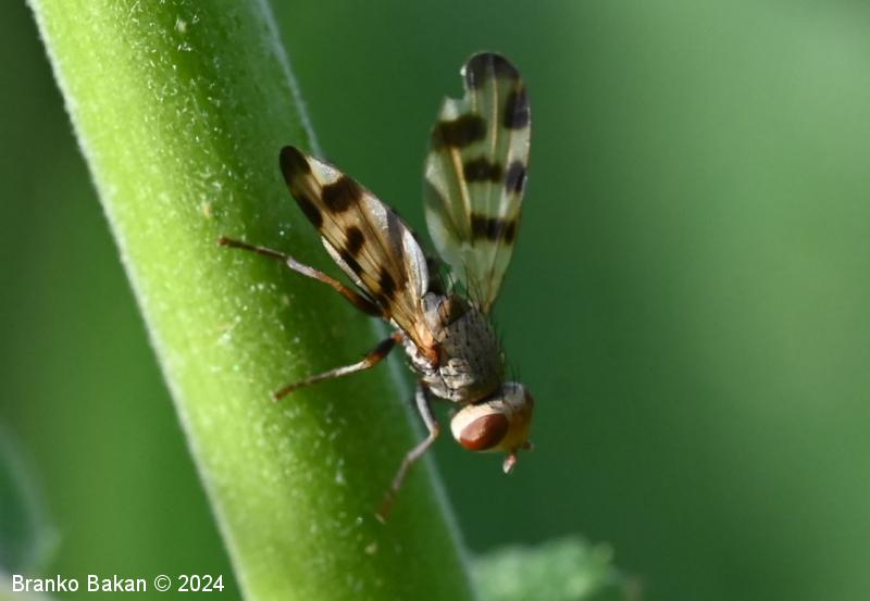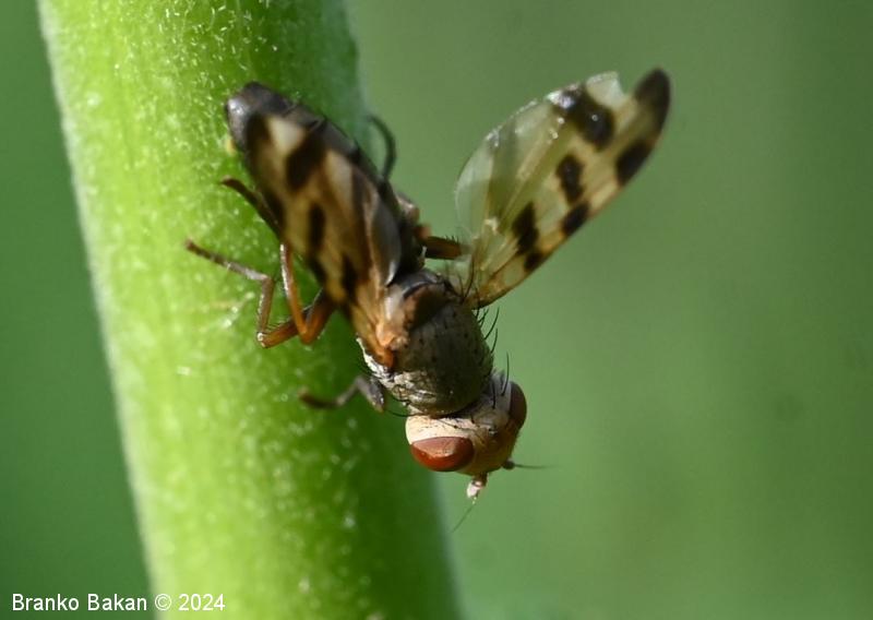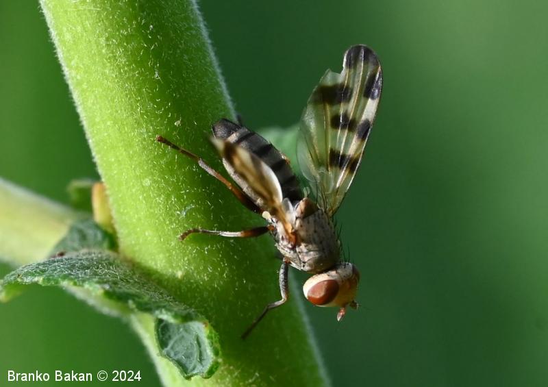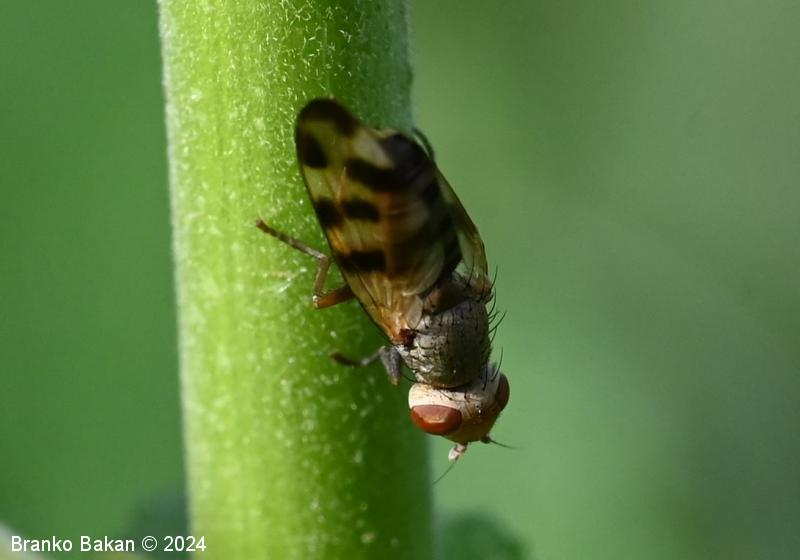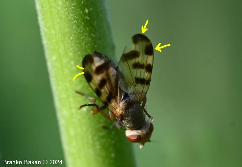 Odrasli osebki: glava je zaobljeno kvadratasta, svetla, s po dvema paroma daljših zatilnih ščetin, osrednji temenski del je rumenkast ali rahlo oranžen, oči so rdeče, razmaknjene. Tipalnice so kratke, na vrhu betičaste, rumenkaste, ariste so nitaste, dokaj dolge. Oprsje je pepelnato sivo, poraslo s kratkimi ščetinicami, daljše ščetine so le v osrednjem delu in na zadnjem delu oprsja. Ščitek (scutellum) je siv, redkeje rjavkast, s parom apikalnih ščetin. Krila so rahlo mlečnata, s temnorjavimi prečnimi lisami, ki so večinoma razporejene nad sredino kril proti robu, tudi konice kril so temno lisaste, žile so krepke, rumenkaste, večinoma nerazvejane. Zadek je valjast, proti koncu nekoliko koničast, sivkast, segmenti so temno obrobljeni. Noge so rumenkaste ali sivkaste, stegenca so večinoma črnikasta, tudi stopalca so nekoliko temnejša.
