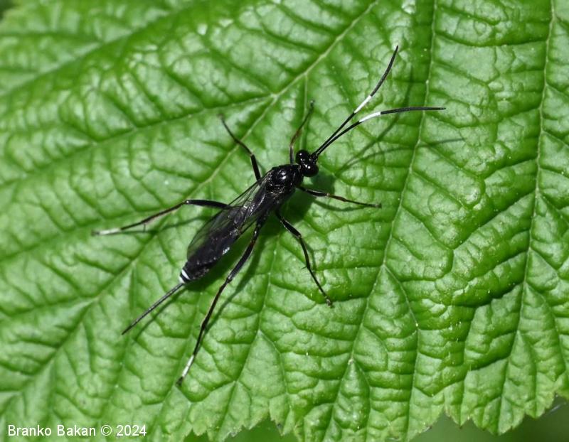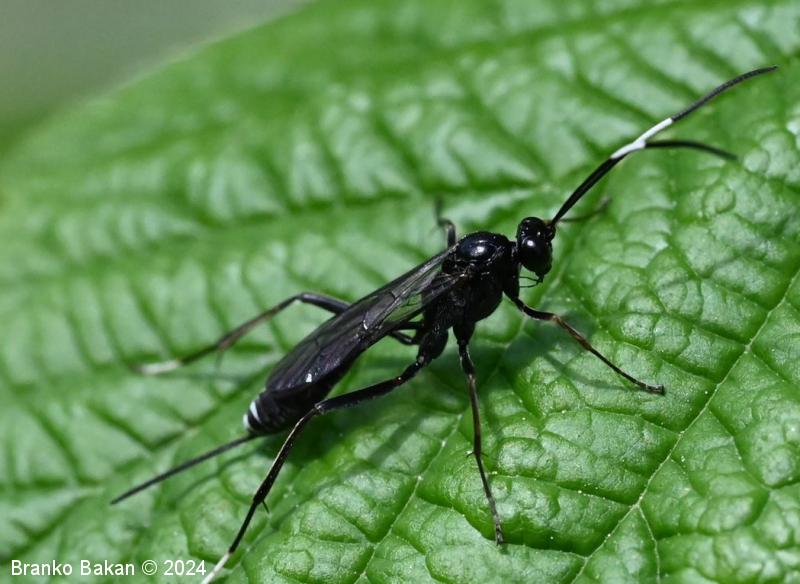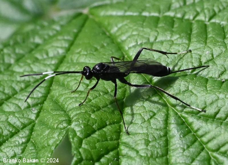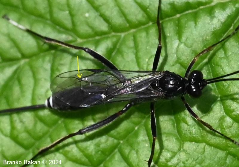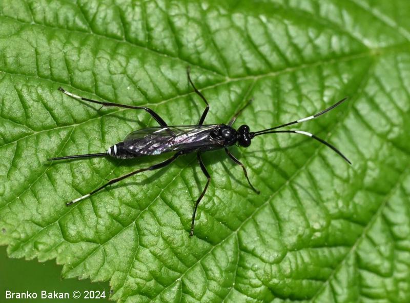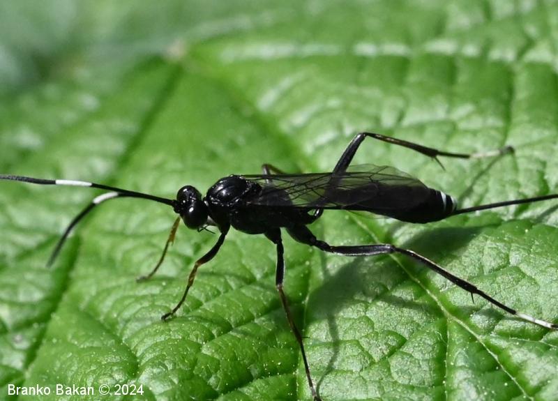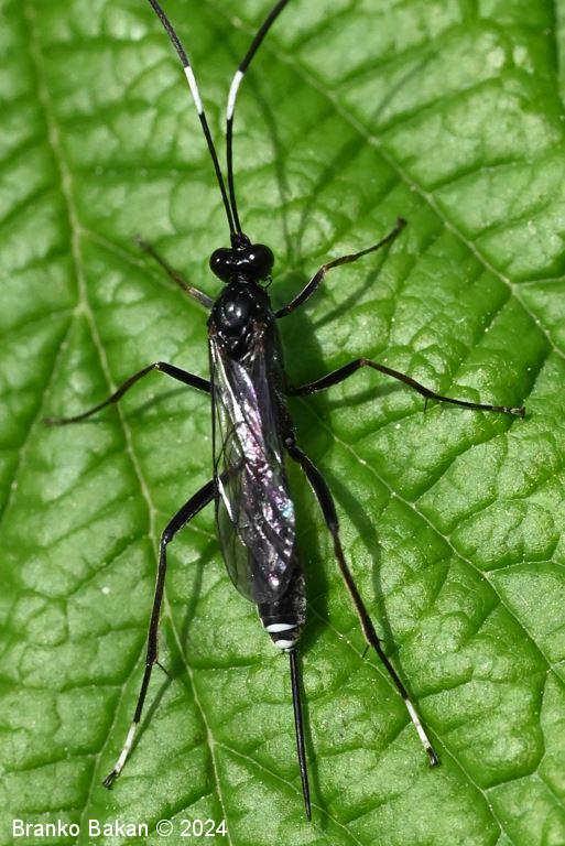 Samica: prepoznavna po bleščeče črnem telesu, le tipalnice v osrednjem delu, konica zadka in stopalca zadnjih nog so kremasto bela. Glava je dokaj drobna, klipeus (nadustna ploščica) je kratka in konveksna, oči so velike, zaobljene, tipalnice so nitaste in precej dolge, bazalni členki so nekoliko zadebeljeni, osrednji del tipalnic je belo pasast. Oprsje je krepko, gladko, brez izrazitejših vzorcev. Krila so podolgasta, zelo rahlo zatemnjena, z izrazitimi žilami, bazikosta je rjavkasta, pterostigma je drobna, ozka, črna, areolet (drobno žilno okence v diskalnem delu kril) je droben, petkoten. Zadek je v sprednjem delu pecljato zožen in prelomljen, zadnji del je ozko valjast, zadnja dva segmenta imata drobno prečno liso na robu, sicer je zadek črn, redko je ob straneh sivkasto poprhnjen. Prepoznavna je dokaj dolga, ravna leglica (ovipozitor), ki je v celoti črna in na koncu koničasta. Noge so precej dolge, vitke, pretežno črne ali črnorjave, stegenca se proti koncu nekoliko odebelijo, zadnji členki zadnjih stopalc so beli.