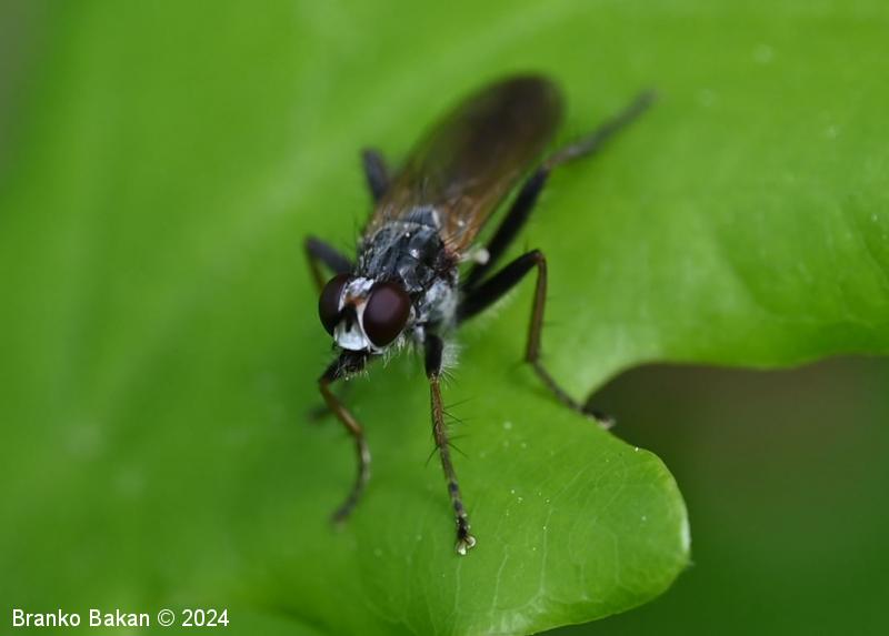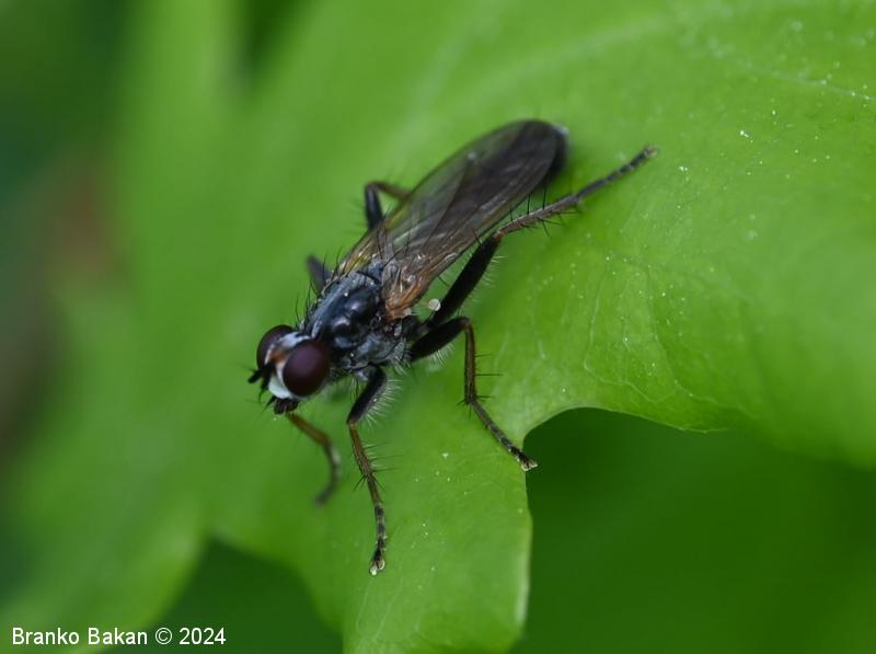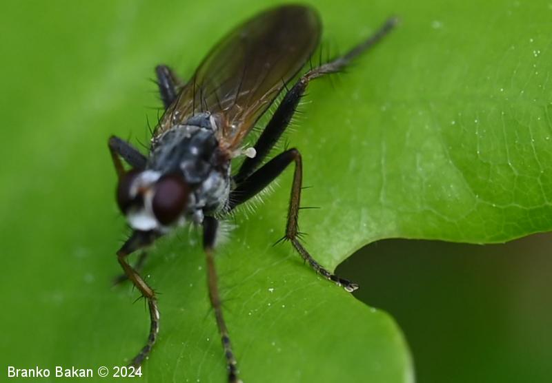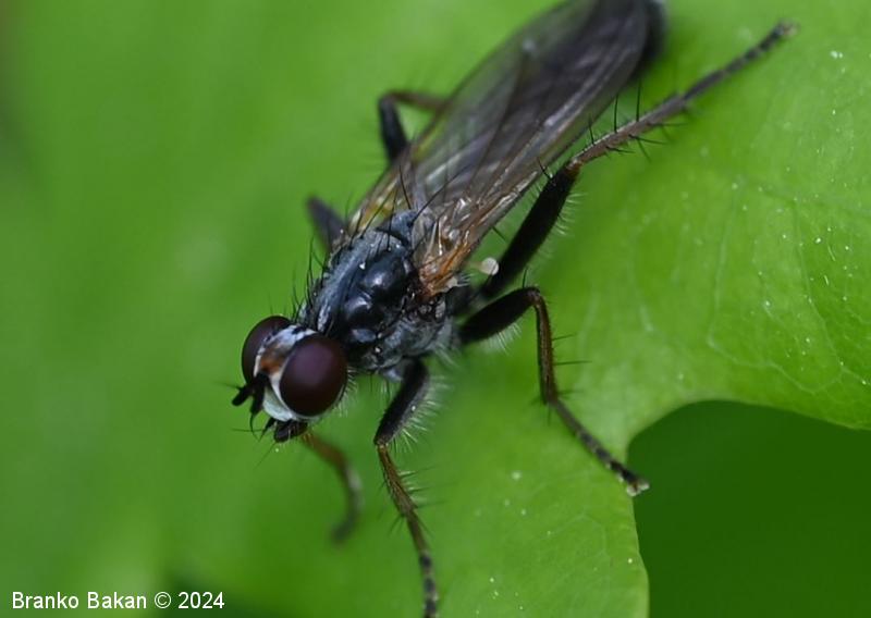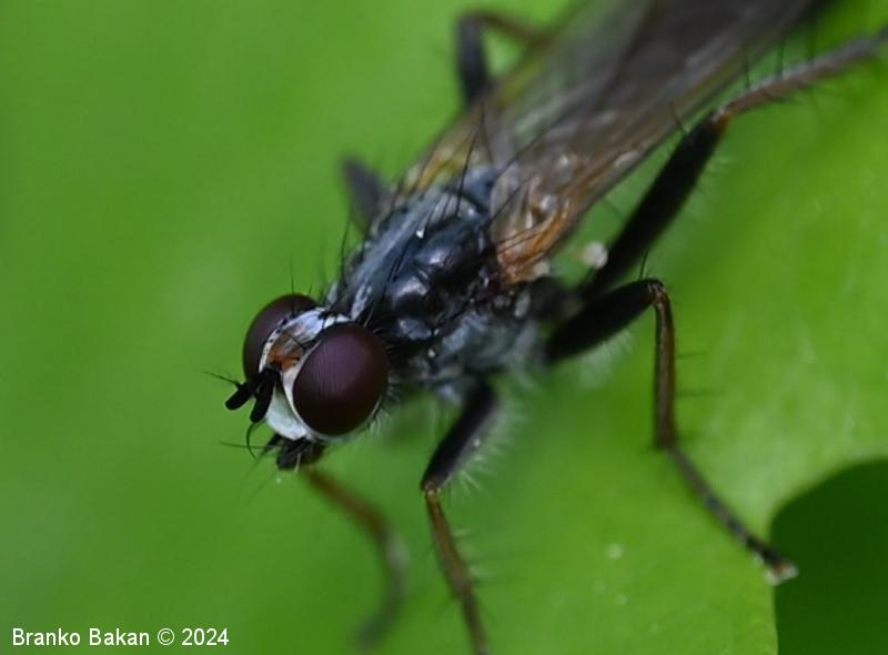 Odrasli osebki: telo je vitko, pretežno bleščeče črno, z rahlim poprhom, poraslo s ščetinami. Glava je dokaj široka, temenski del je pri precej širok, temen, z rjavkasto progo, pogosto belkasto poprhnjen, frontalni del je širok, belo poprhnjen. Oči so velike, rdeče, s krepkimi obočesnimi ščetinami. Tipalnice so kratke, betičaste, temne, ariste so peresaste. Oprsje je temen, v sprednjem delu s srebrnkasto belo progo, raztreseno poraslo z dolgimi, togimi ščetinami, ob straneh je srebrnkasto poprhnjeno. Ščitek (scutellum) je dokaj velik, temen, (večinoma) z enim parom krepkih skutelarnih ščetin in enim parom apikalnih ščetin. Krila so na bazalnem delu rumenkasta, proti konicam postanejo rahlo zatemnjena. Zadek je cilindrast, črn, pri samcih je na koncu betičast, večinoma ukrivljen, z rjavkastim in globoko razcepljenim končnim segmentom. Noge so črne, goleni so rumenkaste ali rahlo rjavkastorumene, stegenca so po spodnji strani gosto porasla s svetlimi, puhastimi dlakami.