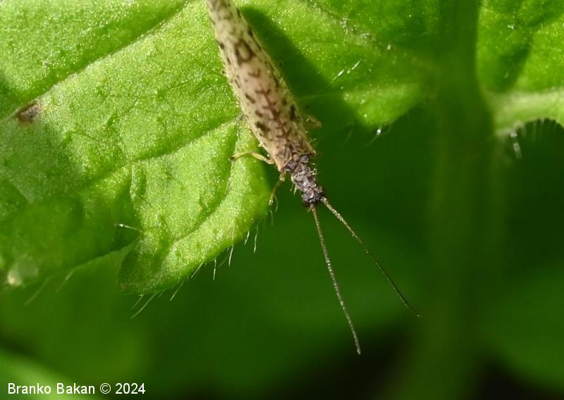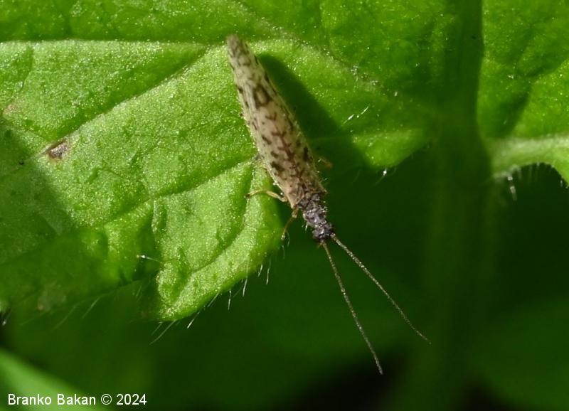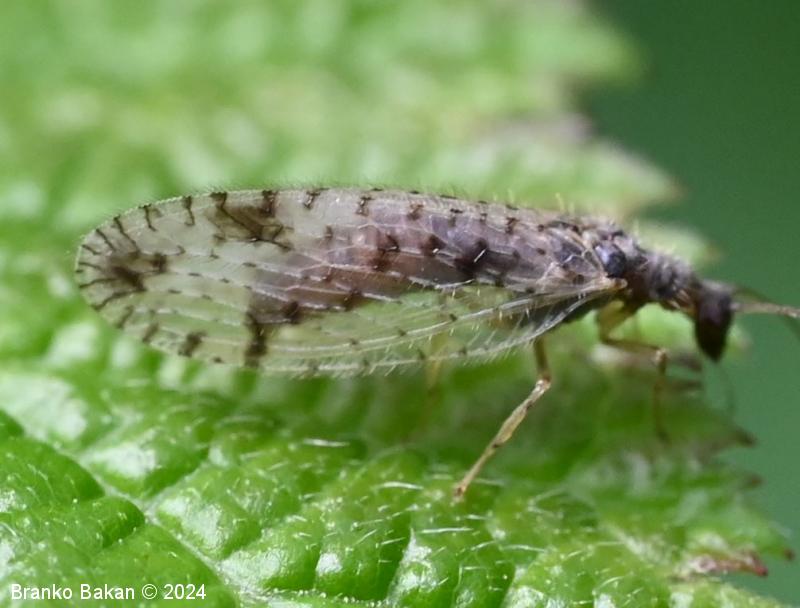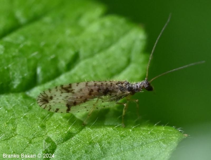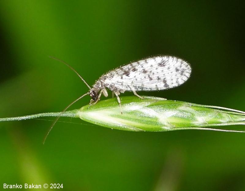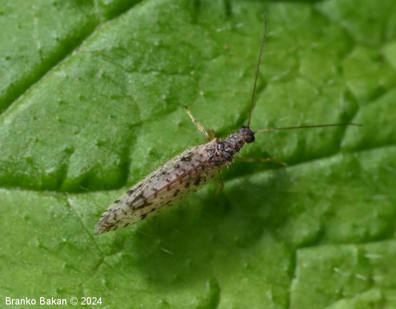 Odrasli osebki: telo je sivkasto, glava je nekoliko temnejša, oči so velike, zelenkaste, tipalnice so precej dolge in nitaste. Oprsje je ozko in poraslo s svetlimi ščetinami. Krila so podolgasto jajčasta, v sprednjem delu rahlo zožena, mehkodlakava, prosojna, z rahlo mlečnatim odtenkom, posuta z večjimi rjavimi lisami v zadnjem delu in serijo manjših lis v sprednjem delu. Žile v krilih so krepke, belkaste, rjavo pasaste, na zunanjem robu se močno vilasto razvejajo, radialna žila se razcepi 3-krat. Zadek je sivkast, krajši od kril. Noge so vitke, bledo rumenkaste.