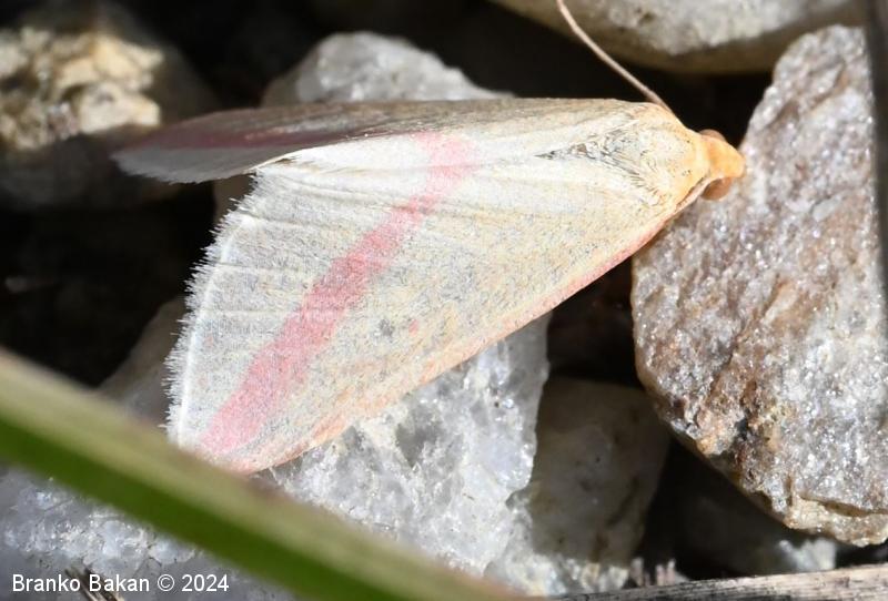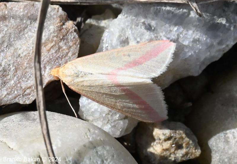 Odrasli osebki: sprednja krila so bolj ali manj intenzivno kremasto rumenkasta s prepoznavno prečno vinskordečo progo na vsakem krilu (v mirovanju tvorita obrnjeno črko V), pogosto pa še z rdečkasto piko v diskalnem delu kril, velikokrat je večji del kril nadahnjen (lahko so v celoti bledo vinskordeča), rdečkast je tudi zgornji rob kril. Zadnja krila so bledorumenkasta, brez vzorcev. Samci imajo ozko peresaste tipalnice, samice imajo nitaste tipalnice. Glava in del oprsja sta rumenkasta, oči so črne.