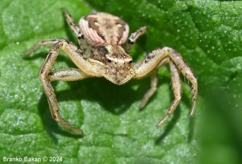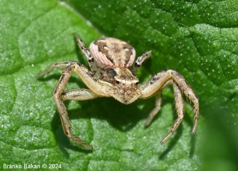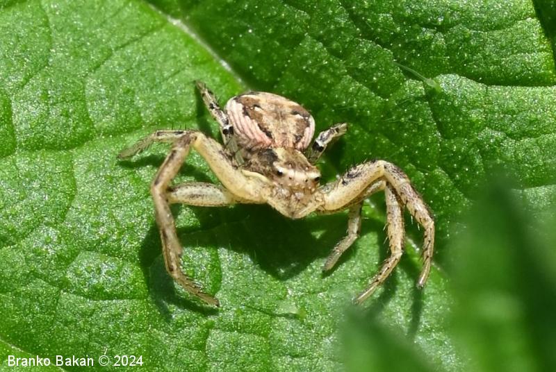 Samec: je manjši od samice, večinoma s prav tako rdečkasto obarvanim bazalnim delom zadka. Pojavljajo se zelo temno, skoraj črno obarvani osebki, z zelo kontrastnima belima lisama na glavoprsju in na zadku, zadek je lahko tudi rdečerjav. Prepoznamo jih po povečanih pedipalpih.