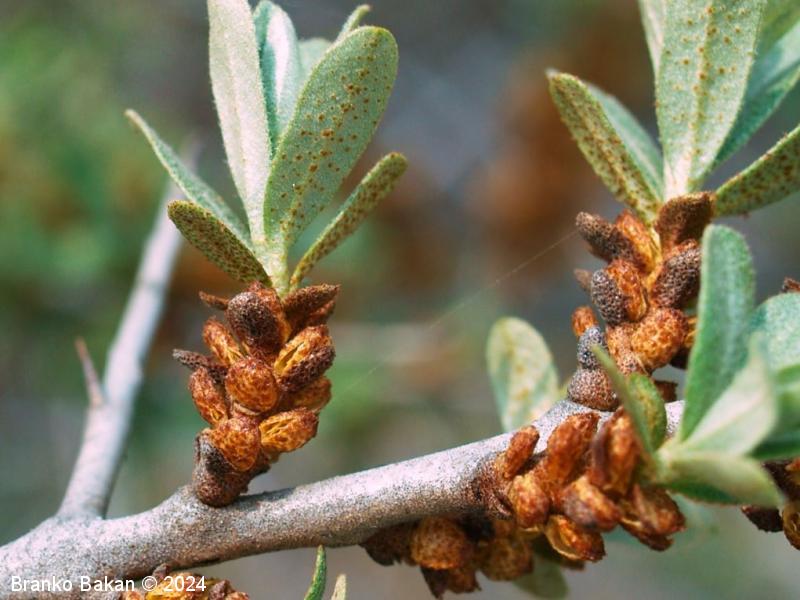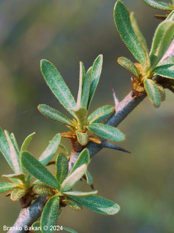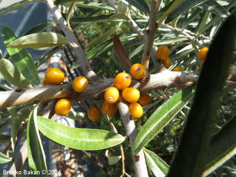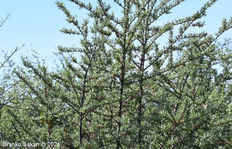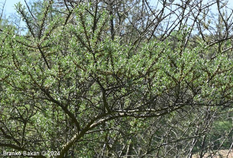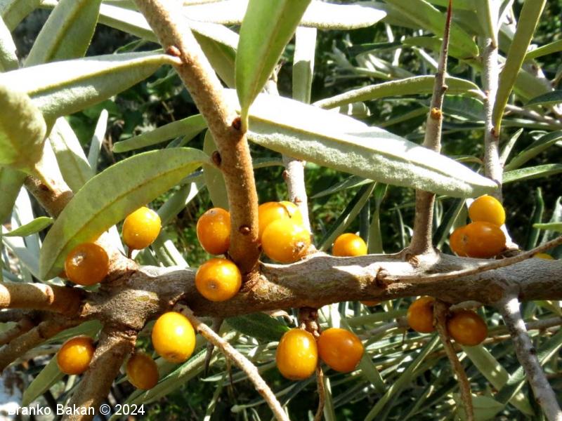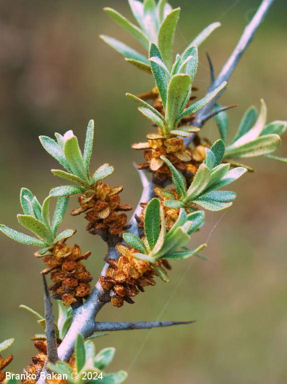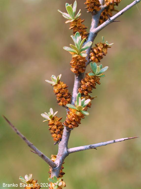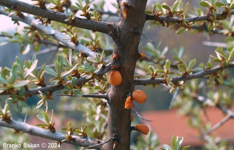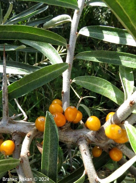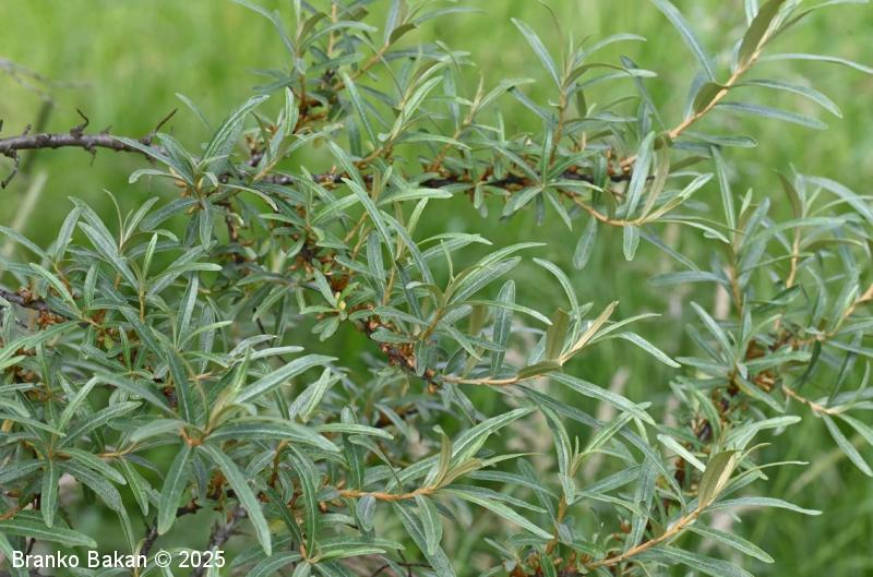 Opis: močno razvejan dvodomen grm s trni in rahlo srebrnkasto skorjo (na mladih poganjkih je ta luskasta). Listi so ozko črtalasti ali podolgasti, premenjalno razvrščeni, po zgornji strani so temnozeleni, pogosto porasli z rjavimi luskicami, sicer goli, po spodnji strani so srebrnkasti, zaradi gosto poraslih zvezdastih dlak. Cvetovi so enospolni, drobni, venčni listi niso razviti, ženski cvetovi imajo večinoma 4 rumene čašne liste, ki so po zunanji strani porasli z rjavimi luskicami, moški cvetovi so iz 2 čašnih listov in imajo po 4 prašnike. Plod je jajčast, mesnat (omesenelo cvetišče, ki obdaja orešek), oranžen ali oranžnordeč, do 8 mm velik, po zunanji strani porasel z rjavkastimi luskicami.