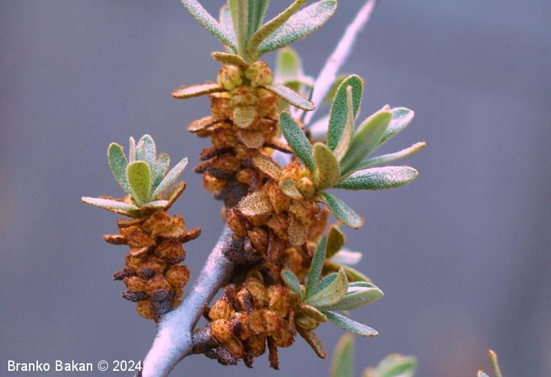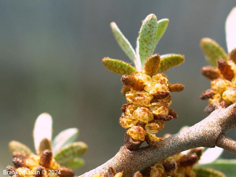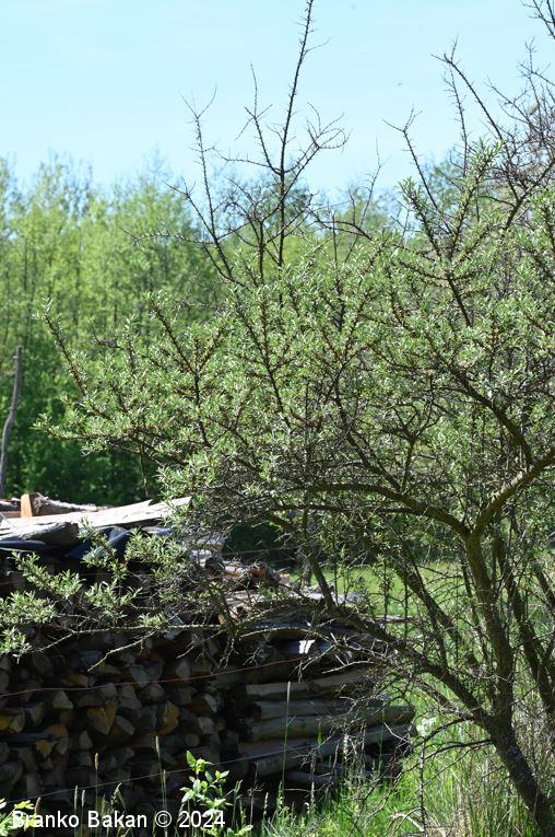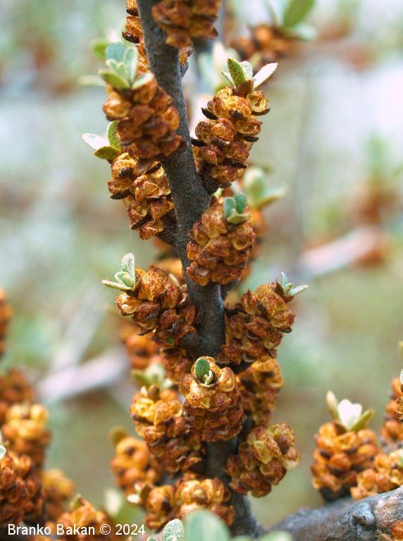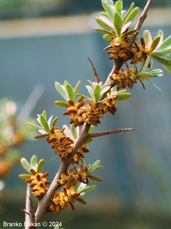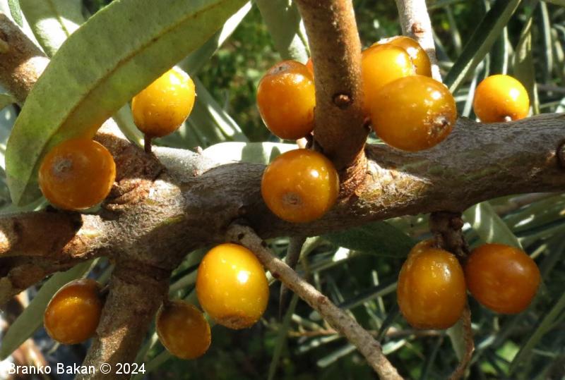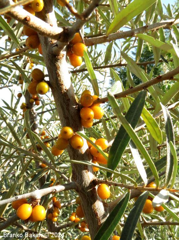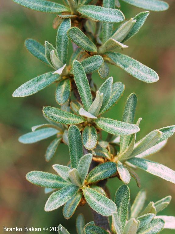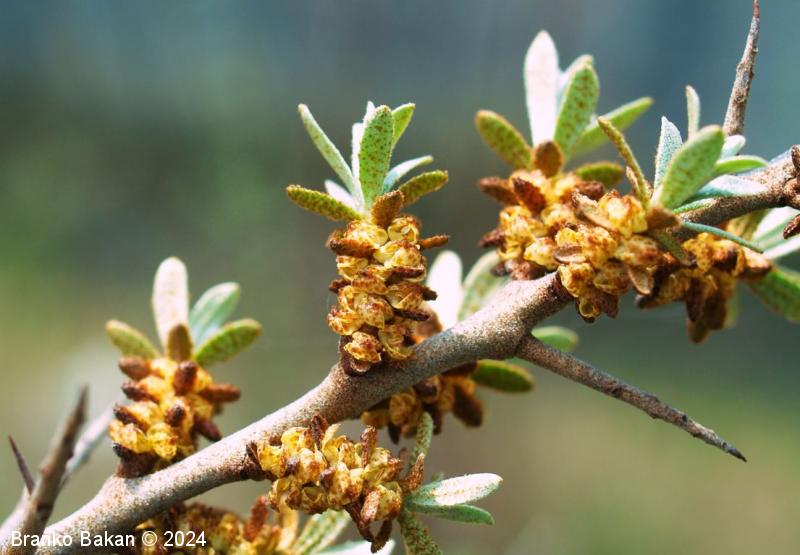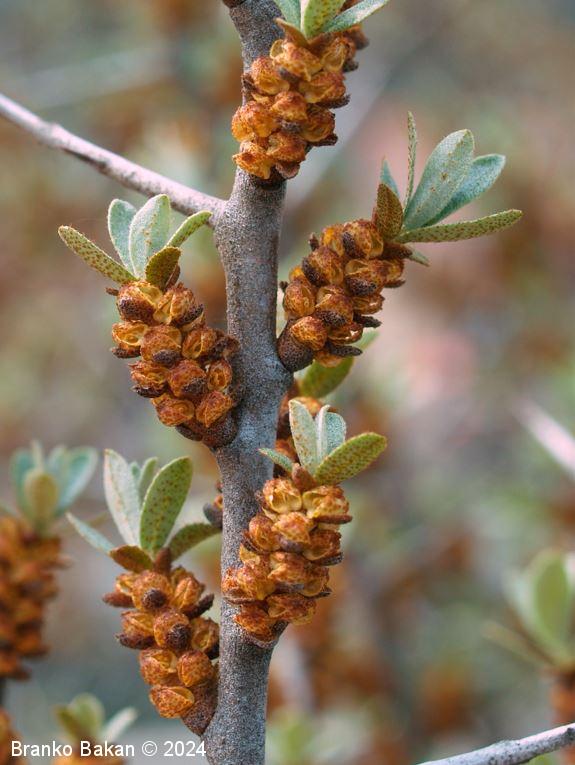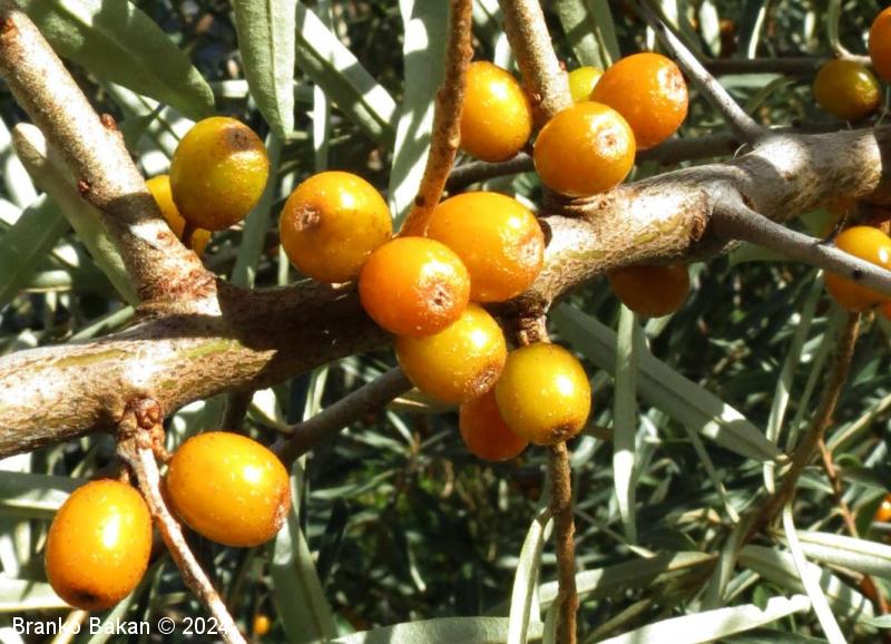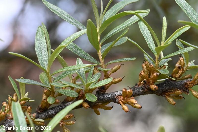 Opis: močno razvejan dvodomen grm s trni in rahlo srebrnkasto skorjo (na mladih poganjkih je ta luskasta). Listi so ozko črtalasti ali podolgasti, premenjalno razvrščeni, po zgornji strani so temnozeleni, pogosto porasli z rjavimi luskicami, sicer goli, po spodnji strani so srebrnkasti, zaradi gosto poraslih zvezdastih dlak. Cvetovi so enospolni, drobni, venčni listi niso razviti, ženski cvetovi imajo večinoma 4 rumene čašne liste, ki so po zunanji strani porasli z rjavimi luskicami, moški cvetovi so iz 2 čašnih listov in imajo po 4 prašnike. Plod je jajčast, mesnat (omesenelo cvetišče, ki obdaja orešek), oranžen ali oranžnordeč, do 8 mm velik, po zunanji strani porasel z rjavkastimi luskicami.